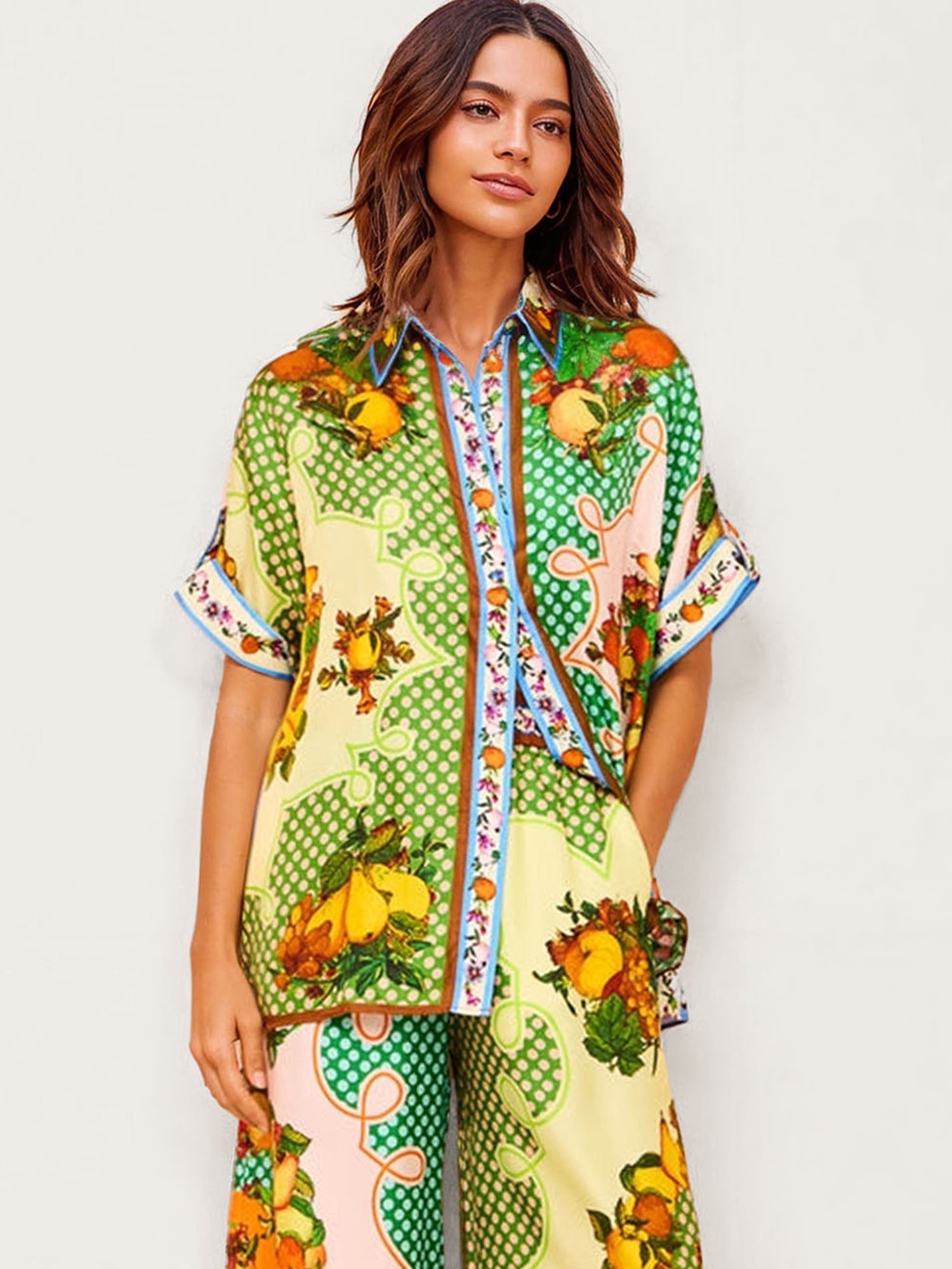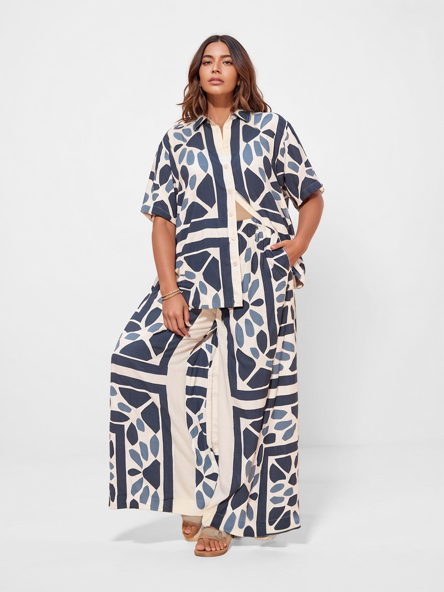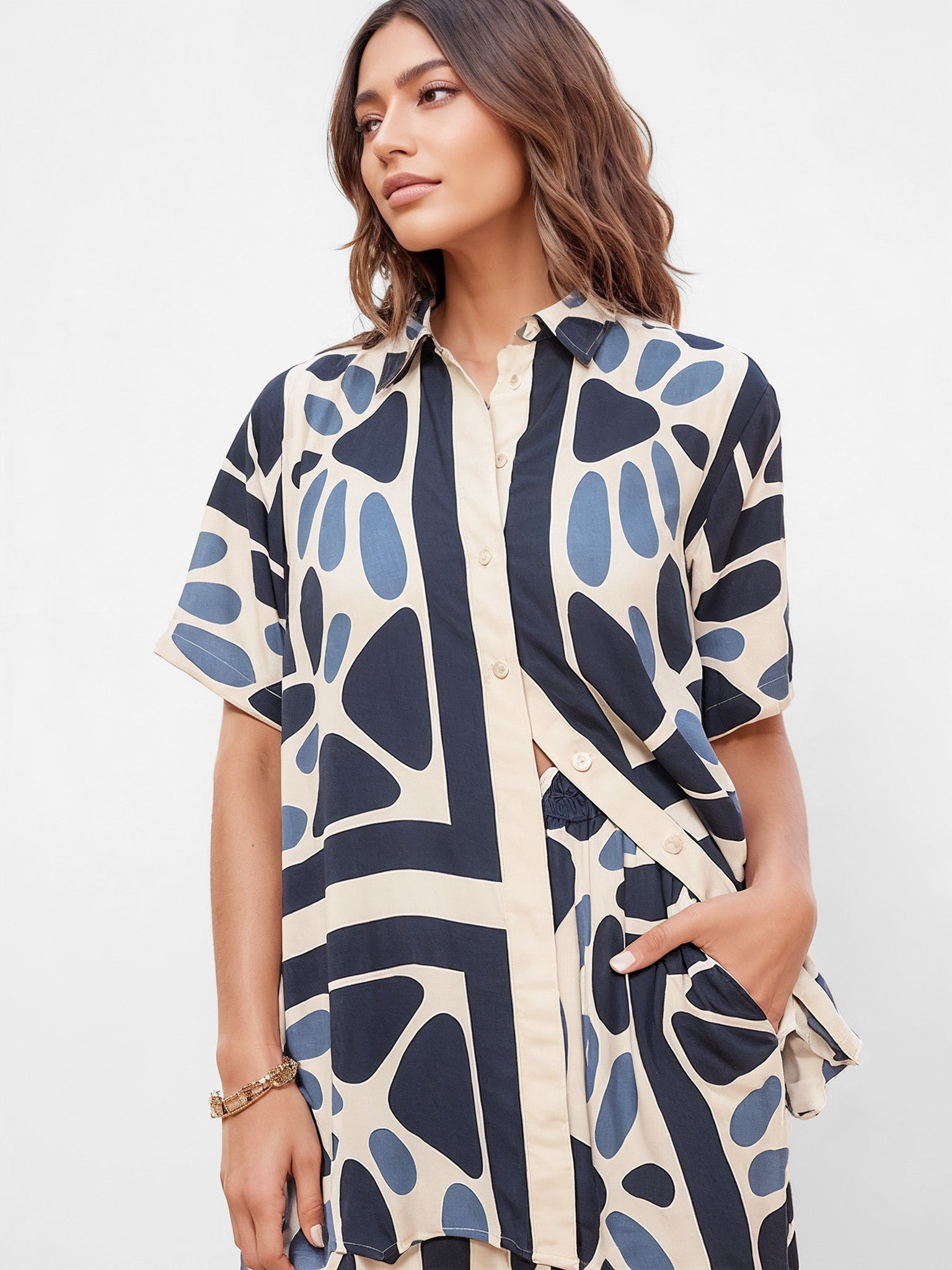 Modern Geo Print Oversized Button-Up Shirt