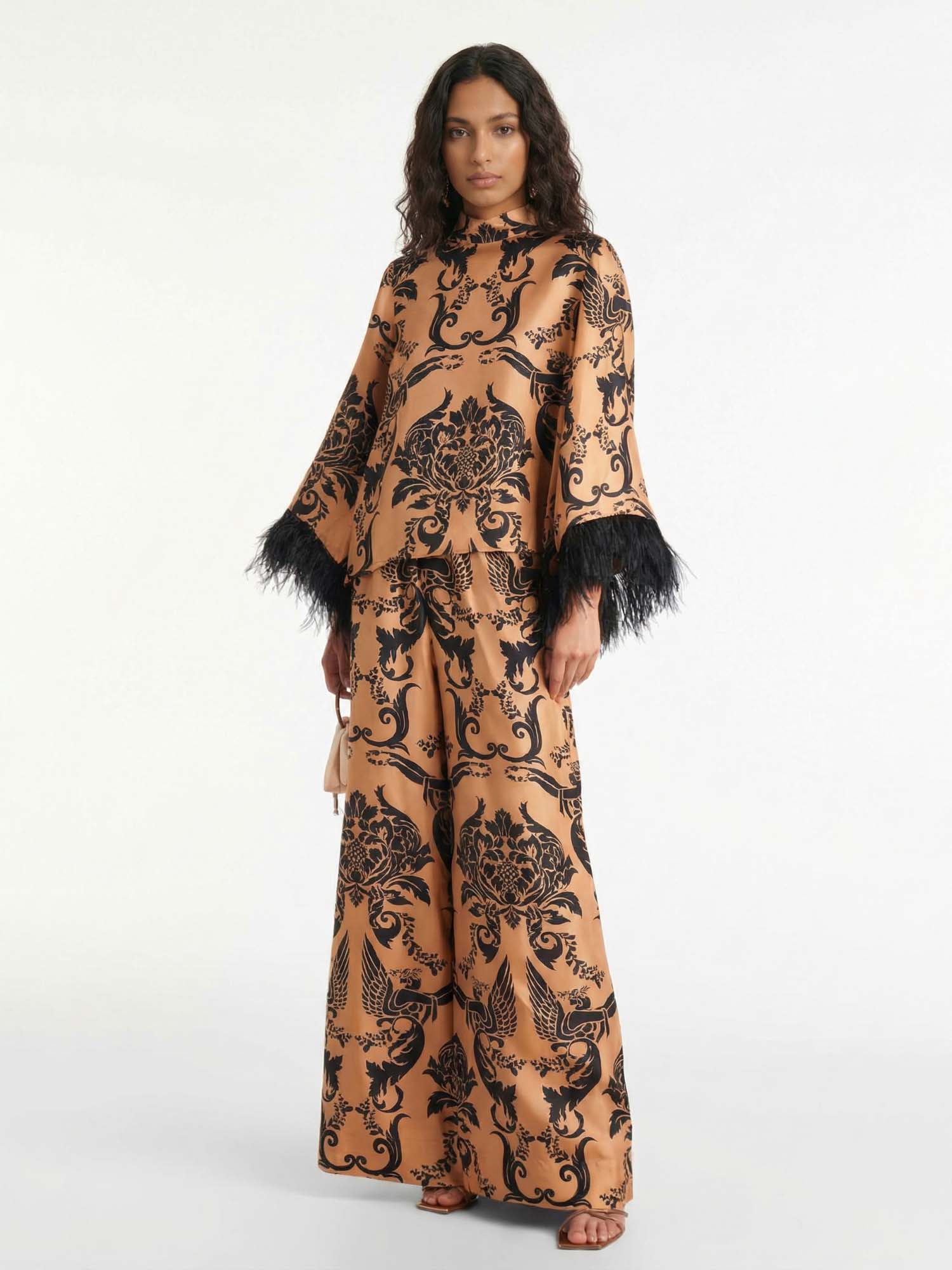 Bohemian Satin Pants with Feather Accents