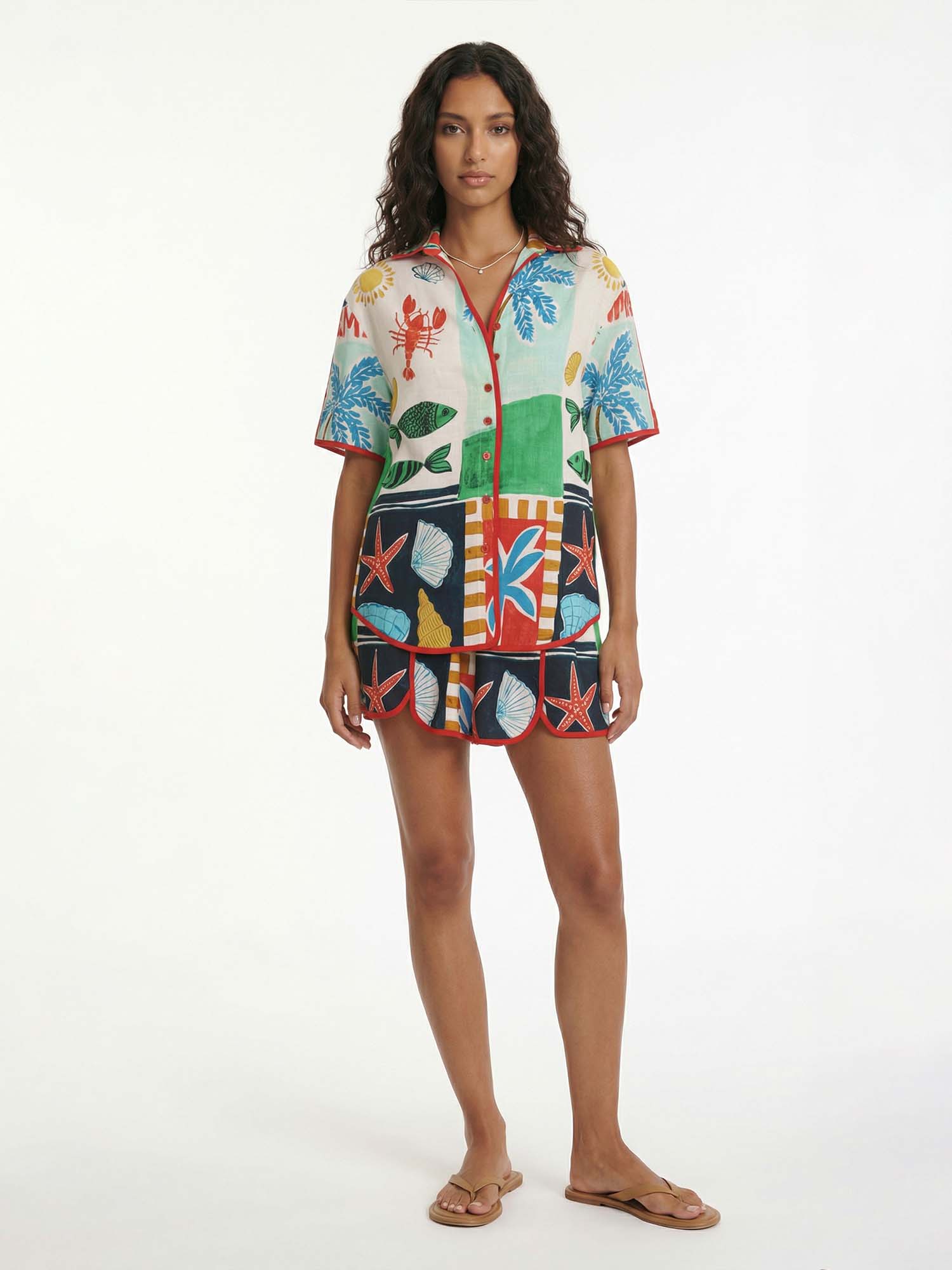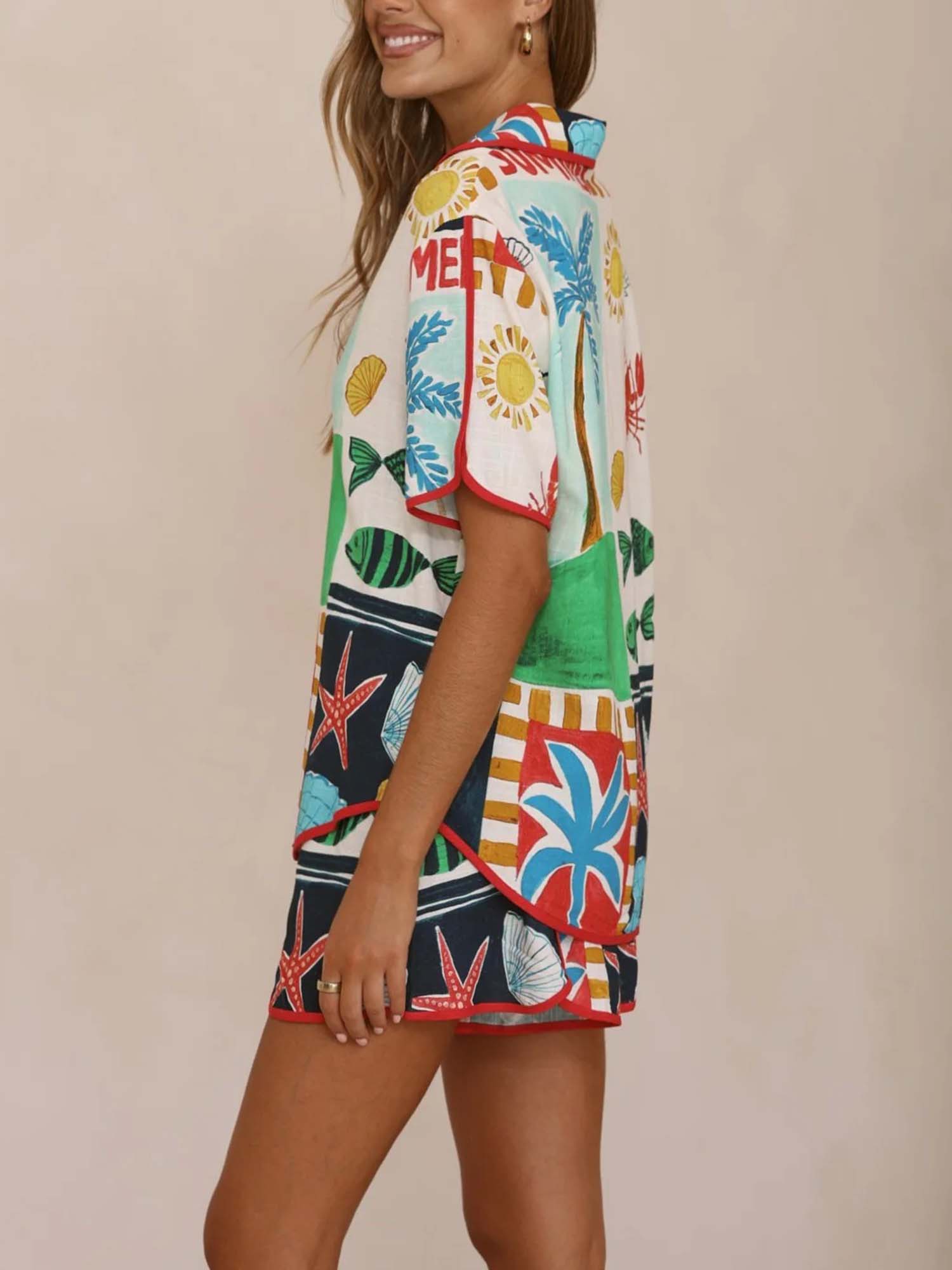 Let seaside treasures unfold in Dantўўase's Coastal Patchwork Set, where the oversized shirt and matching shorts bloom with vibrant marine motifs—starfish, lobsters, corals, shells, and sunlit palms—arranged in joyful, eclectic panels. The shirt's collared neckline opens to a deep V, short sleeves and scalloped hems add playful flutter, while the drawstring waist cinches effortless ease. For sun-drenched beach days or golden-hour lounging, it becomes minimalist women's joyful ocean mosaic—vibrant, carefree, and eternally radiant.