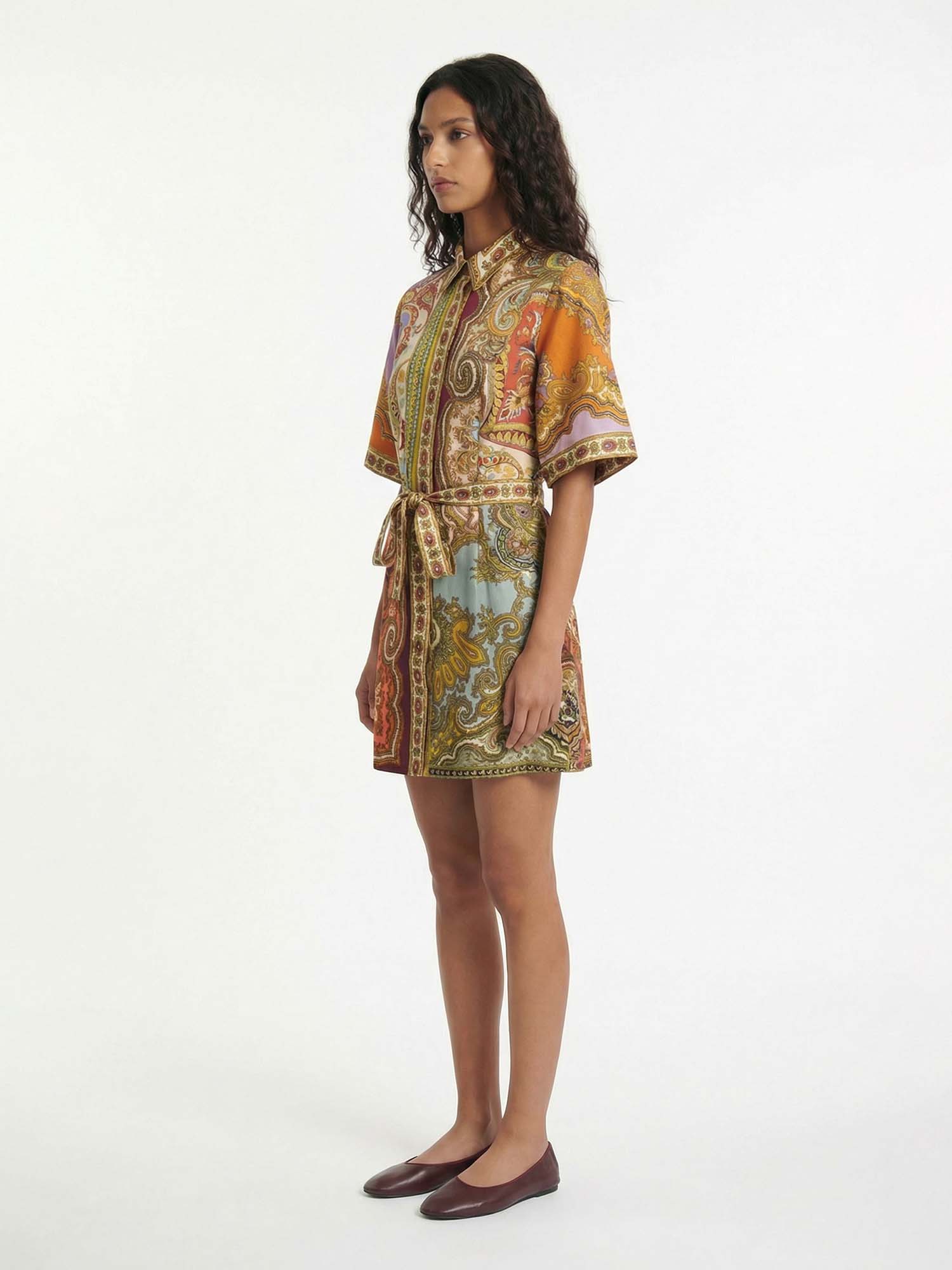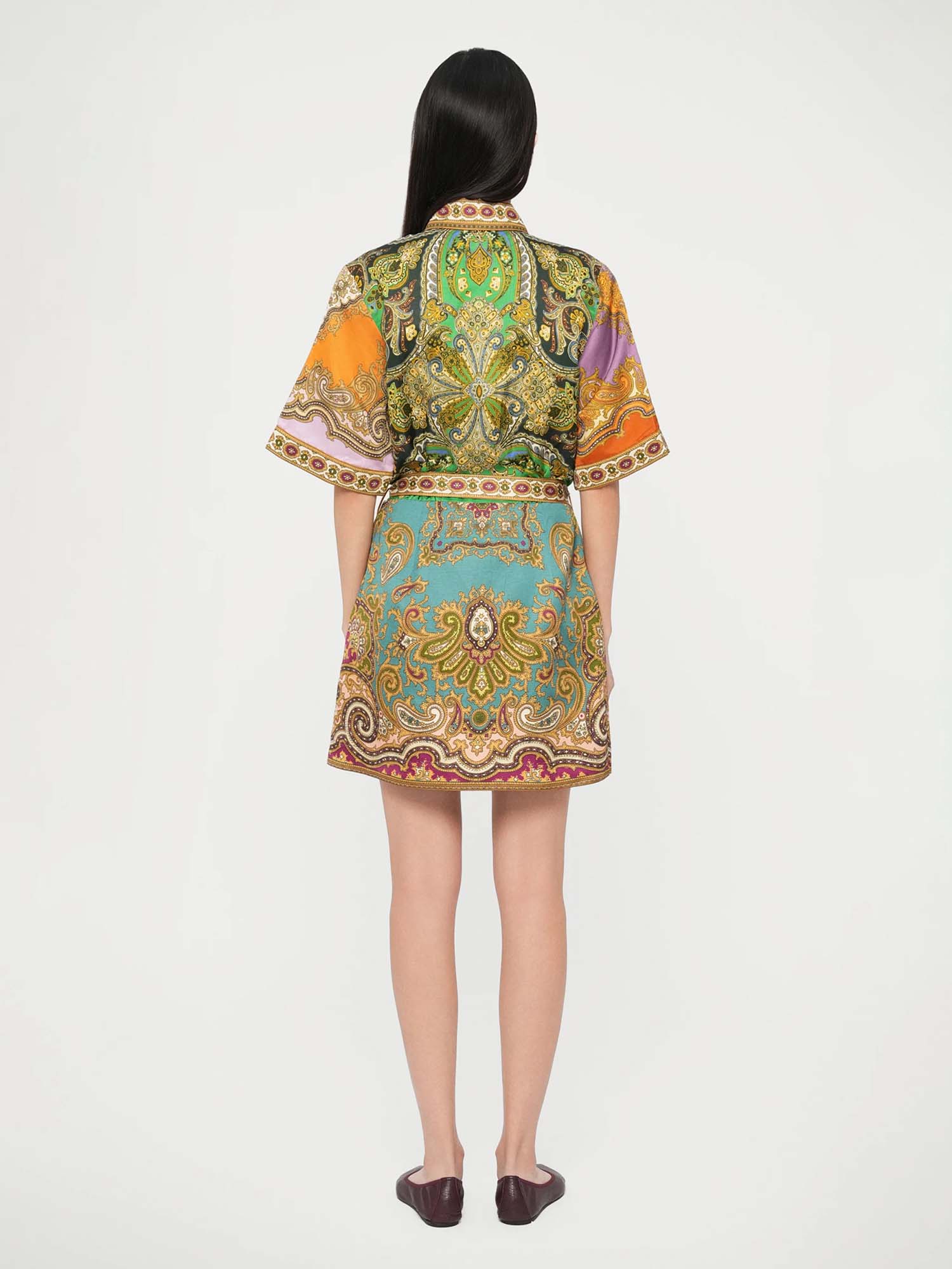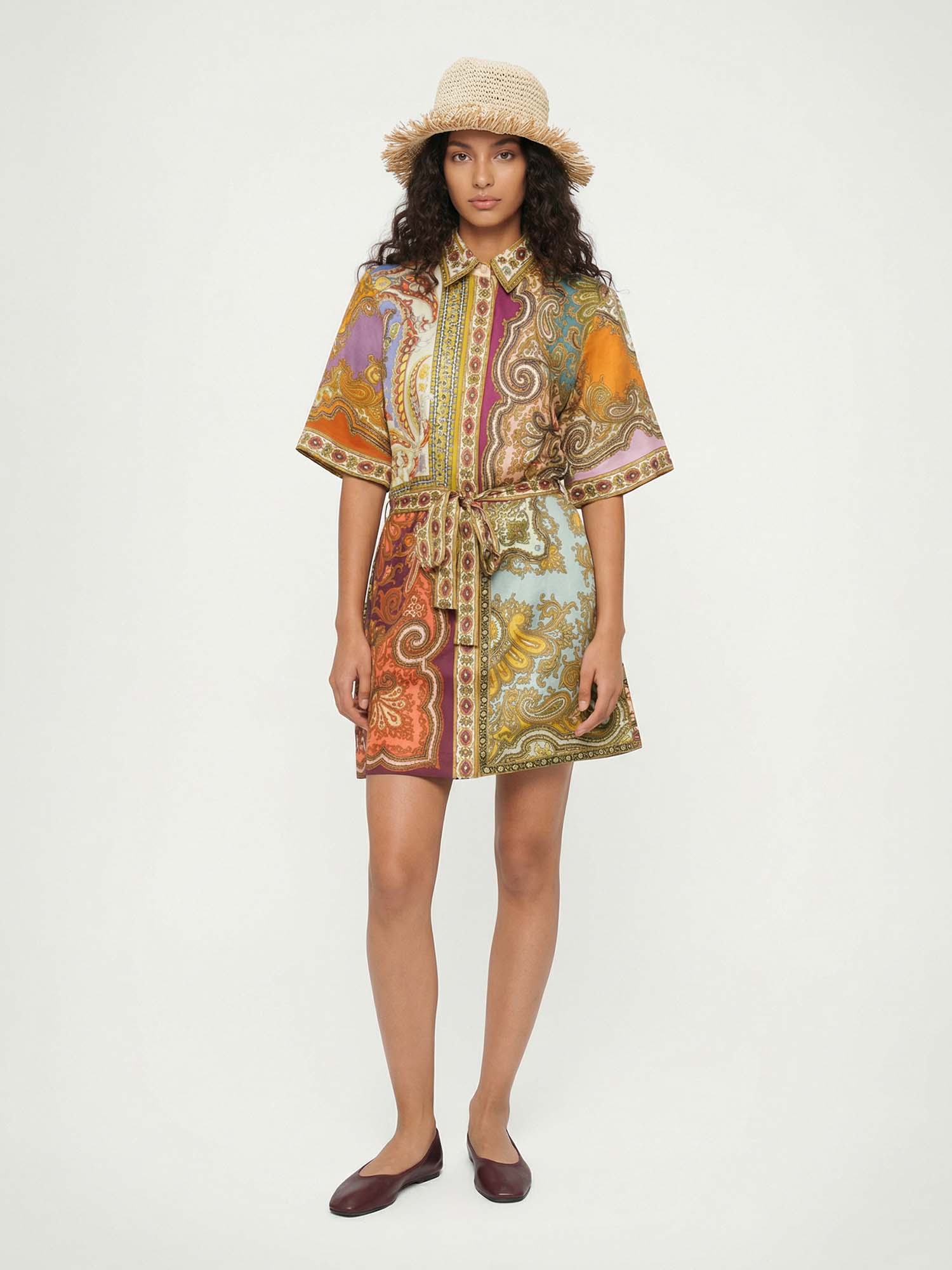 Let intricate tales of distant lands unfold in Dantўўase's Paisley Reverie Mini Dress, where swirling paisleys, ornate florals, and golden motifs entwine in vibrant, rhythmic symmetry across the fabric. The collared neckline opens to delicate buttons, short puffed sleeves frame effortless ease, and a draped waist knot cinches into a tiered, flouncy hem that twirls above the knee with playful volume. For sun-drenched escapes or twilight gatherings, it becomes minimalist women's portable dreamscape—lush, whimsical, and eternally enchanting.
