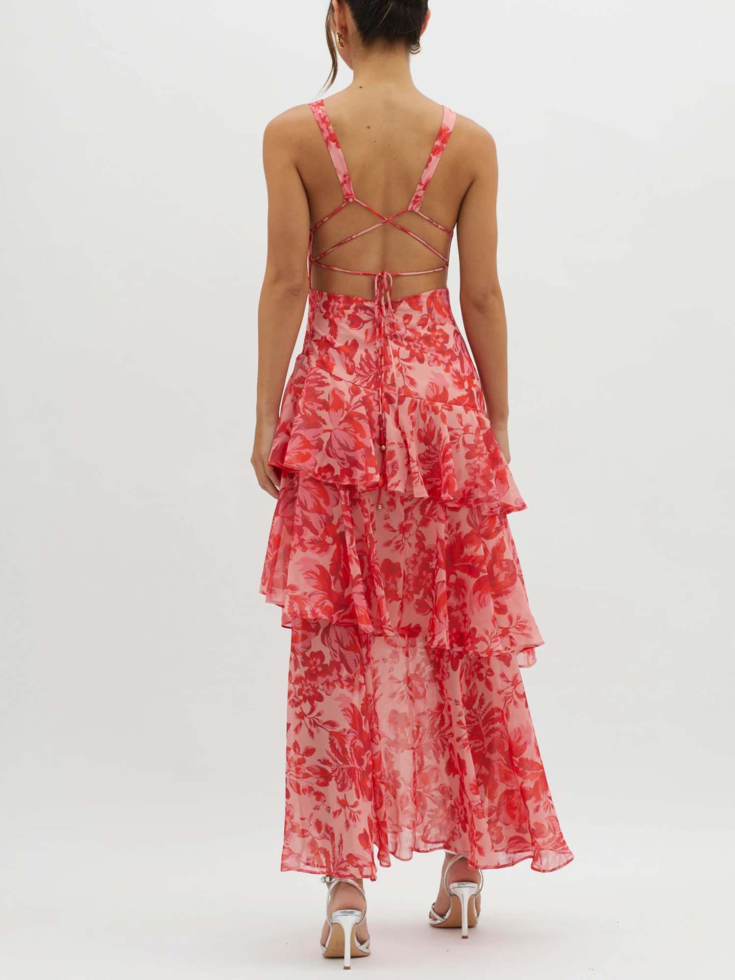 A captivating red maxi dress featuring the same plunging neckline and romantic layered ruffles, perfect for festive parties and statement occasions.