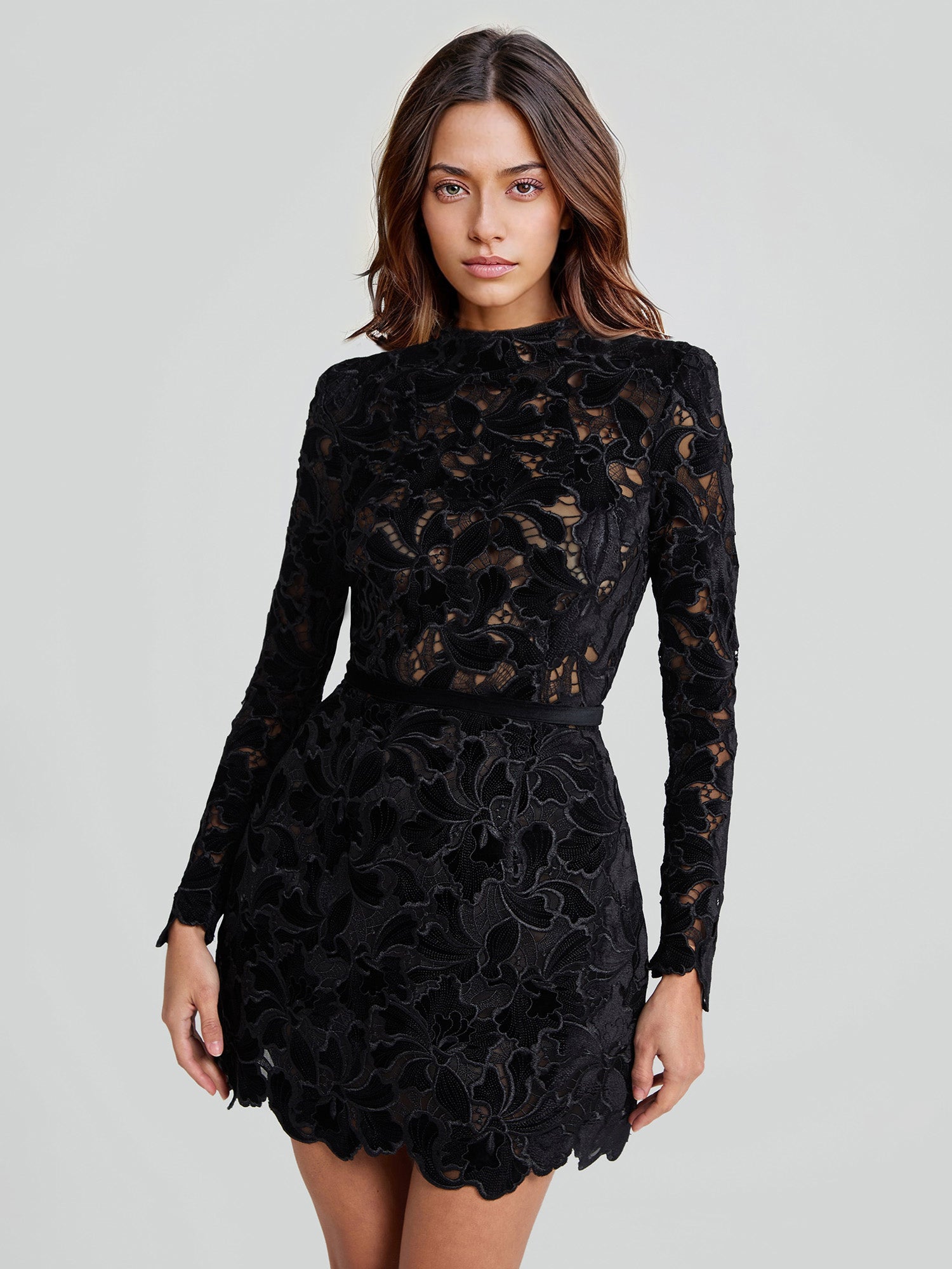 Lace Long Sleeve Mini Dress with Scalloped Hem