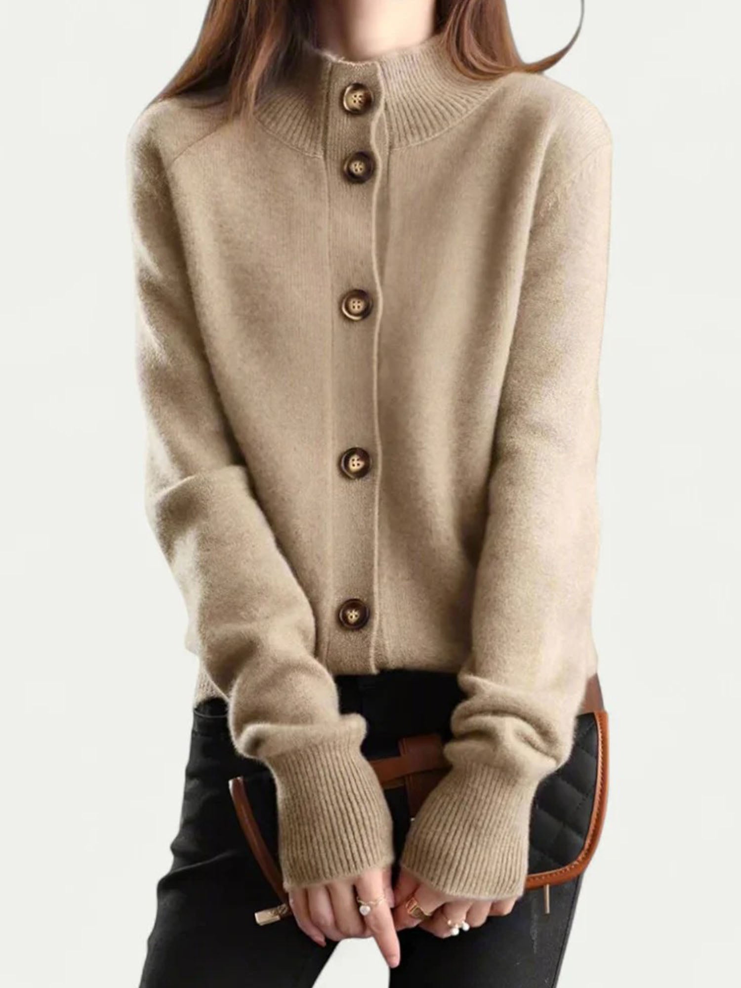A cozy knit cardigan with a refined vintage mood. The structured silhouette and soft texture make it perfect for layering through the seasons.
