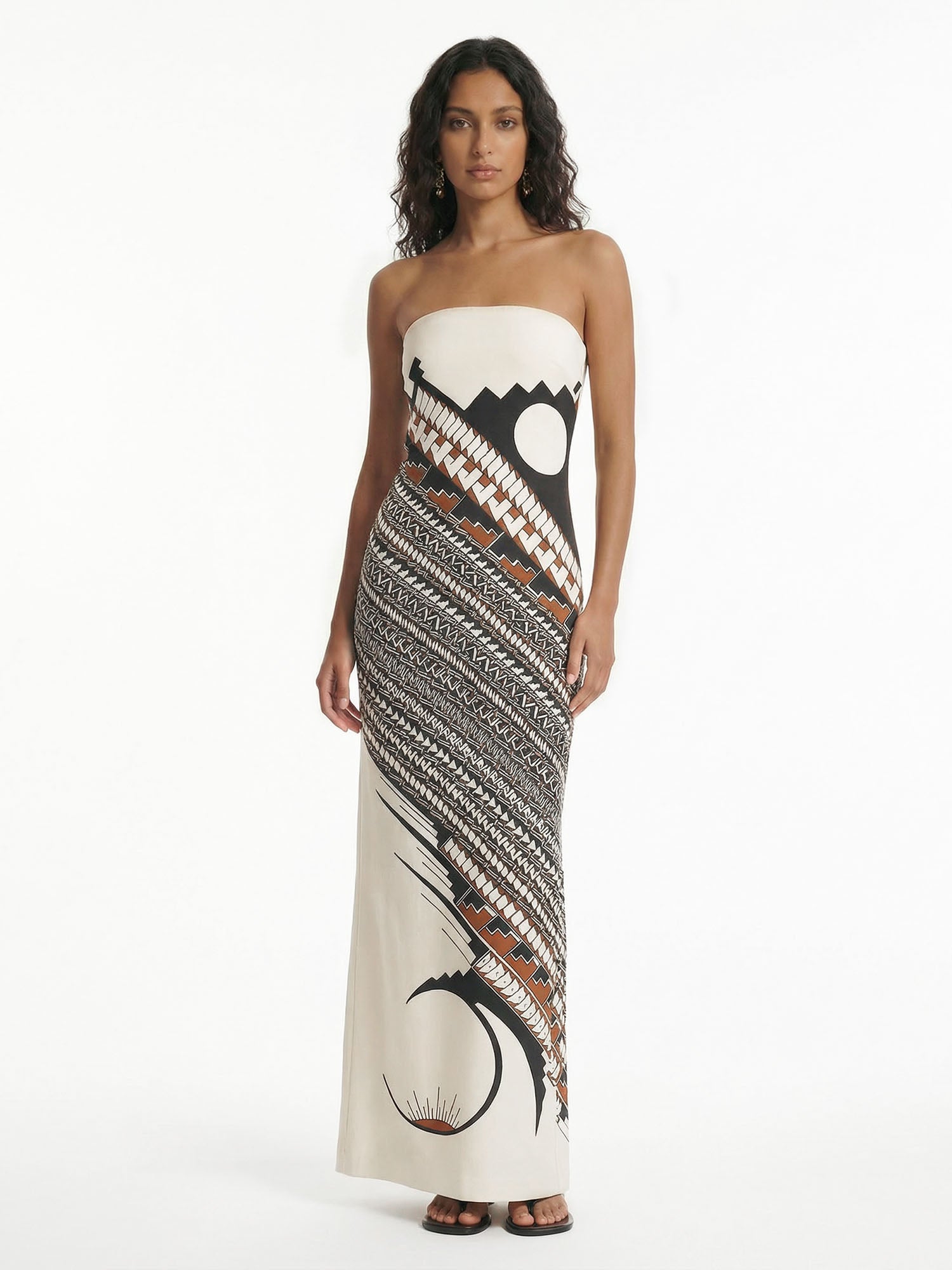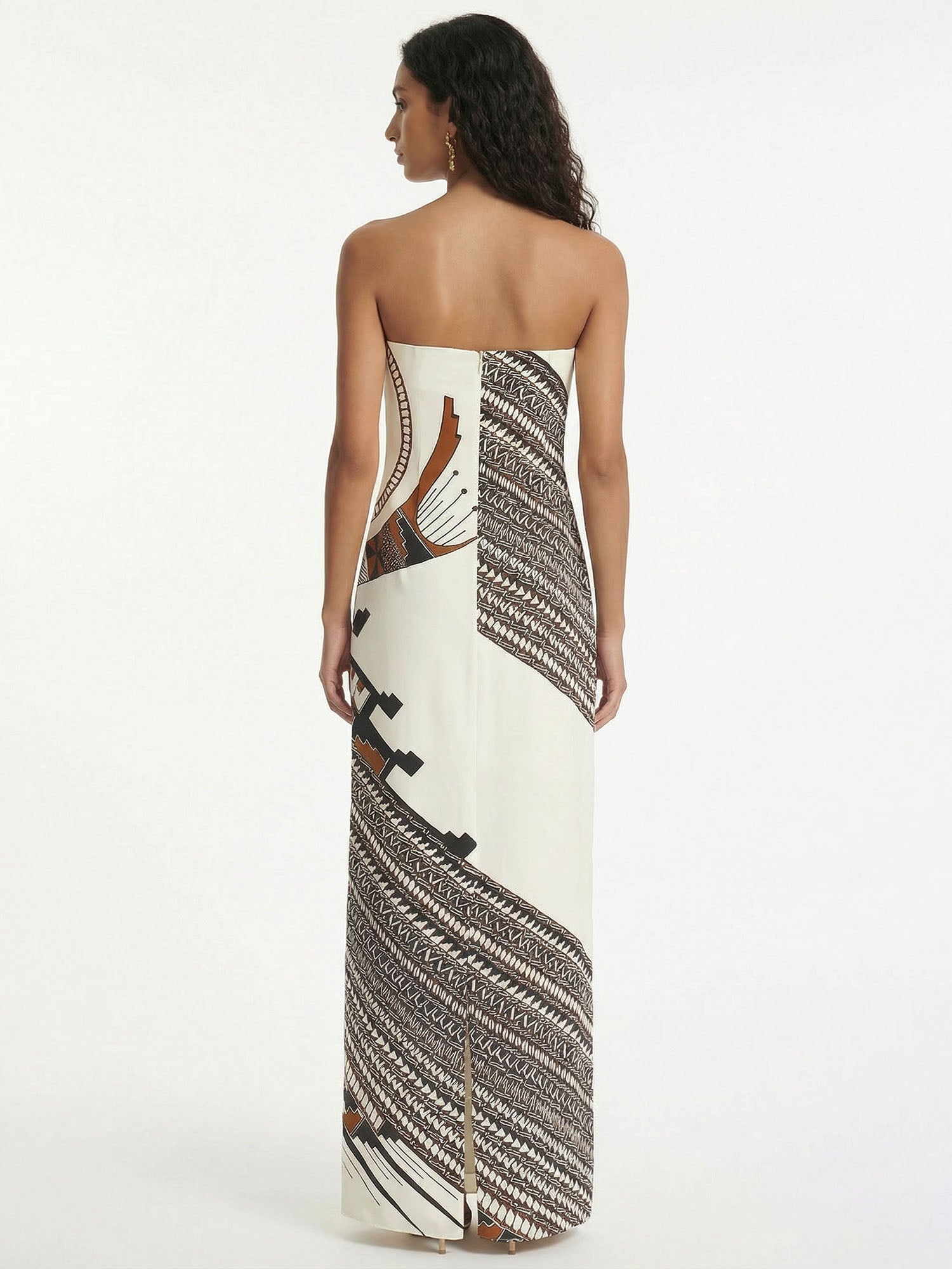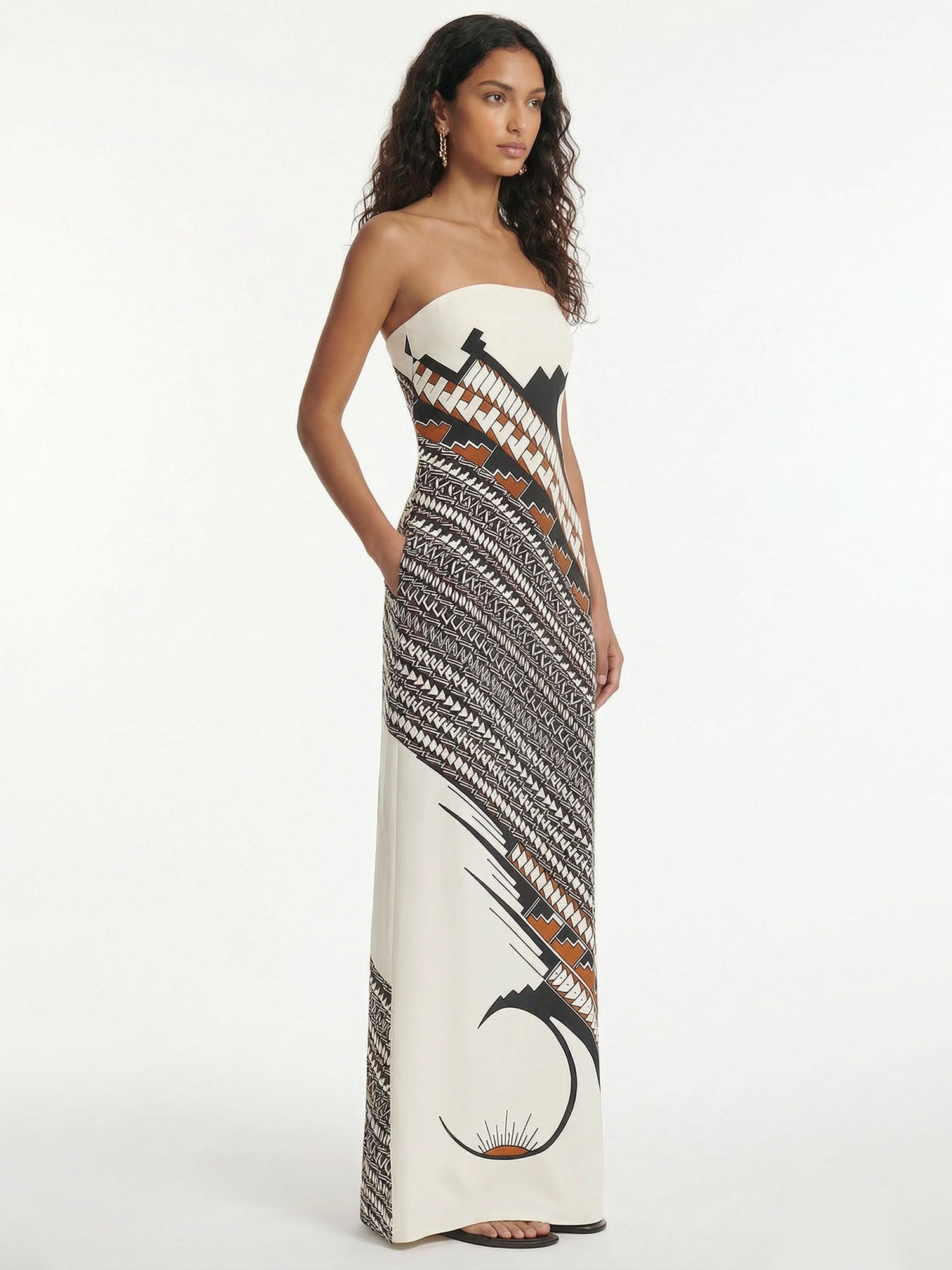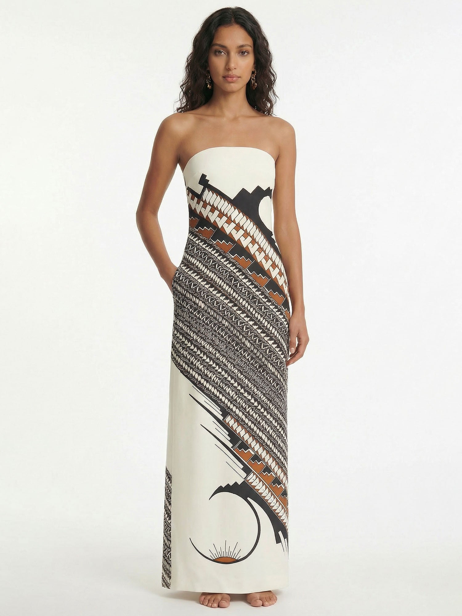 Let ancient rhythms unfold where intricate lines and forms intertwine in quiet harmony across the flowing silhouette. The strapless neckline frames effortless grace as the skirt sways with balanced movement, inviting serenity and timeless poise with every step.
