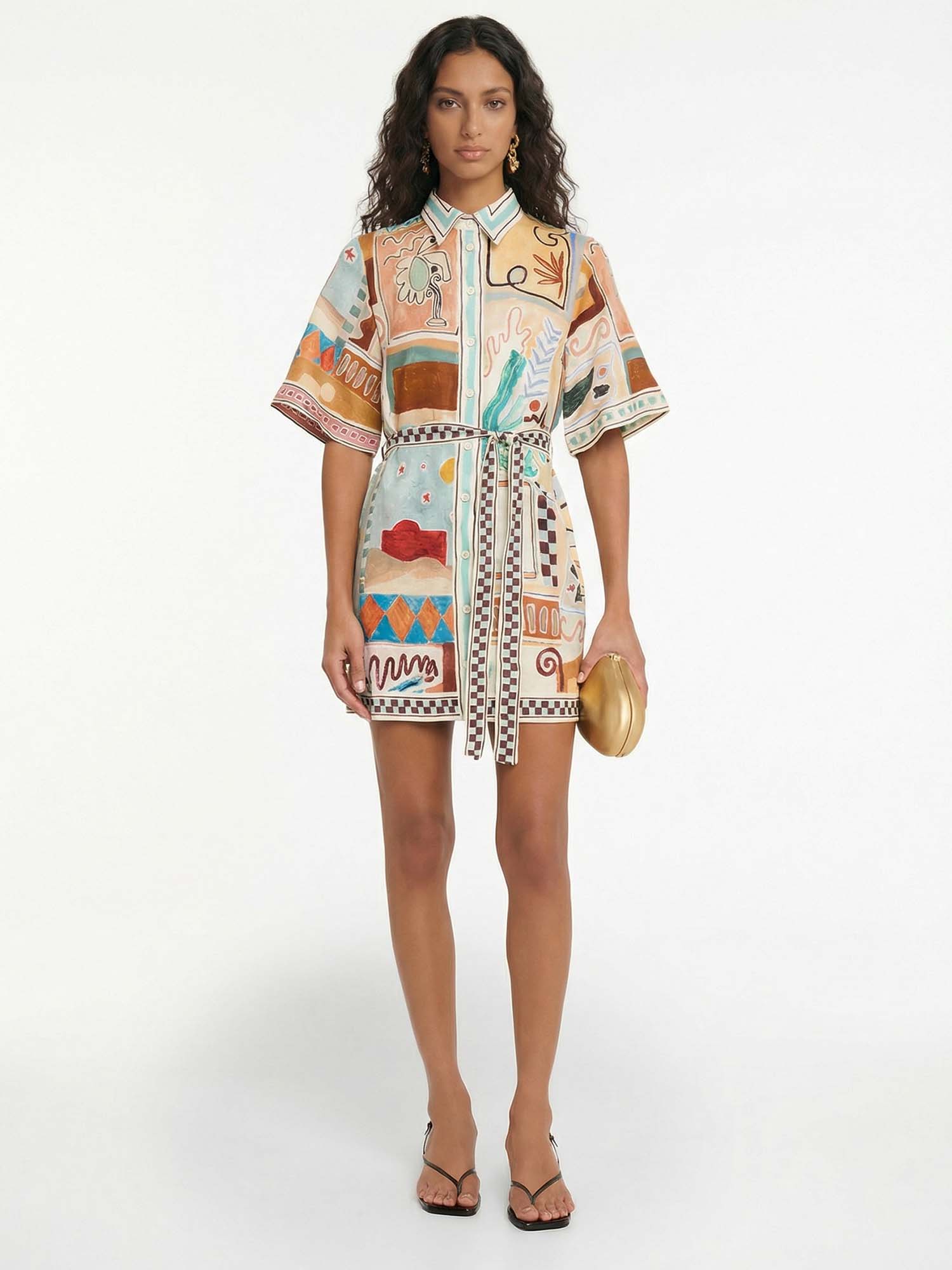 A vibrant blend of artistic expression and structured elegance. This Dantўўase mini dress features a bold abstract mural print that transforms a classic shirt silhouette into a wearable piece of art. Complete with a coordinated checkerboard belt to accentuate the waist, this versatile piece offers a chic, modern look for any occasion. Dantўўase is dedicated to crafting high-fashion staples for the contemporary woman, focusing on unique designs that balance minimalist sophistication with creative flair. Whether for a stylish city brunch or a gallery event, this dress makes a confident, fashion-forward statement.