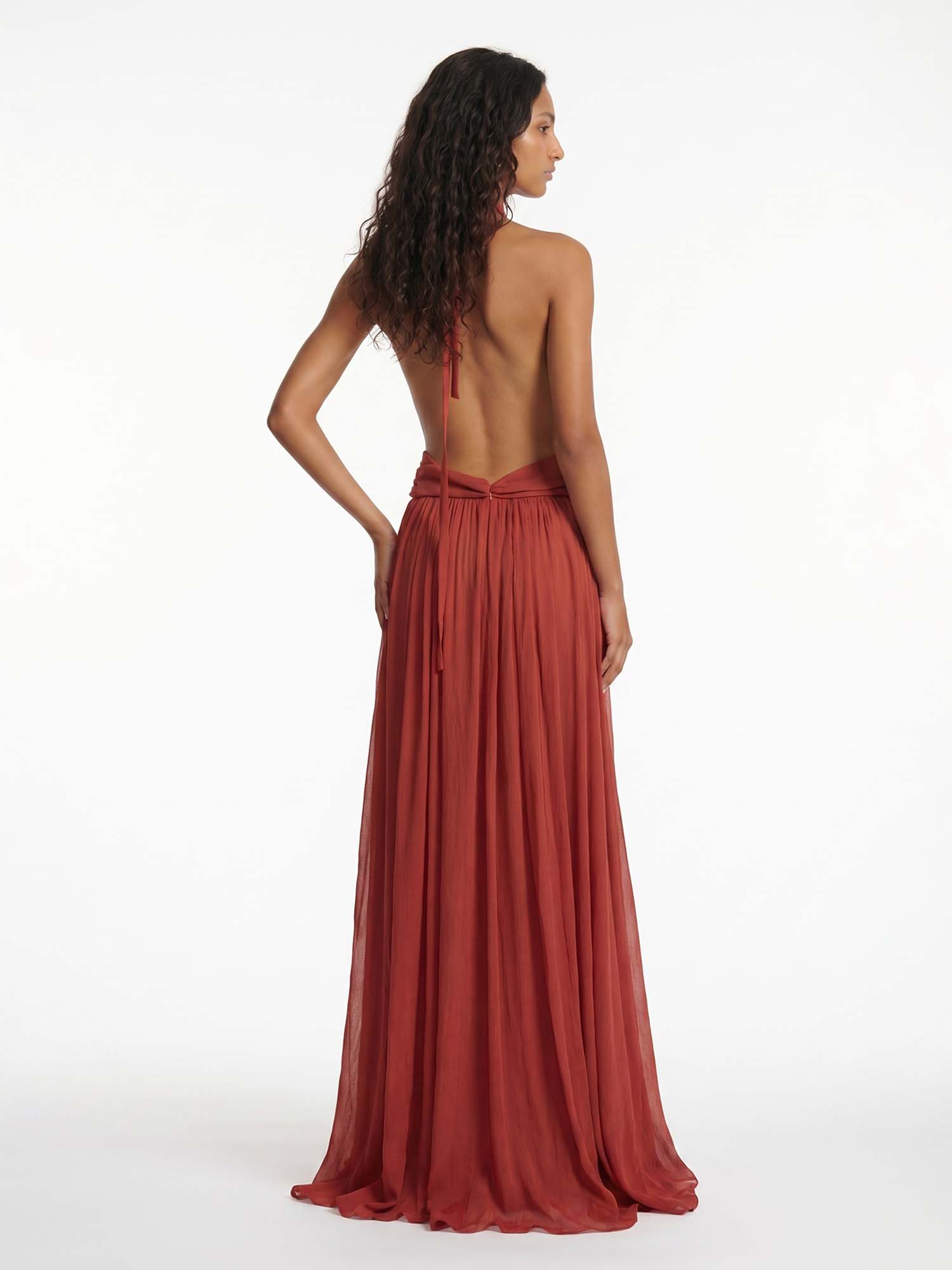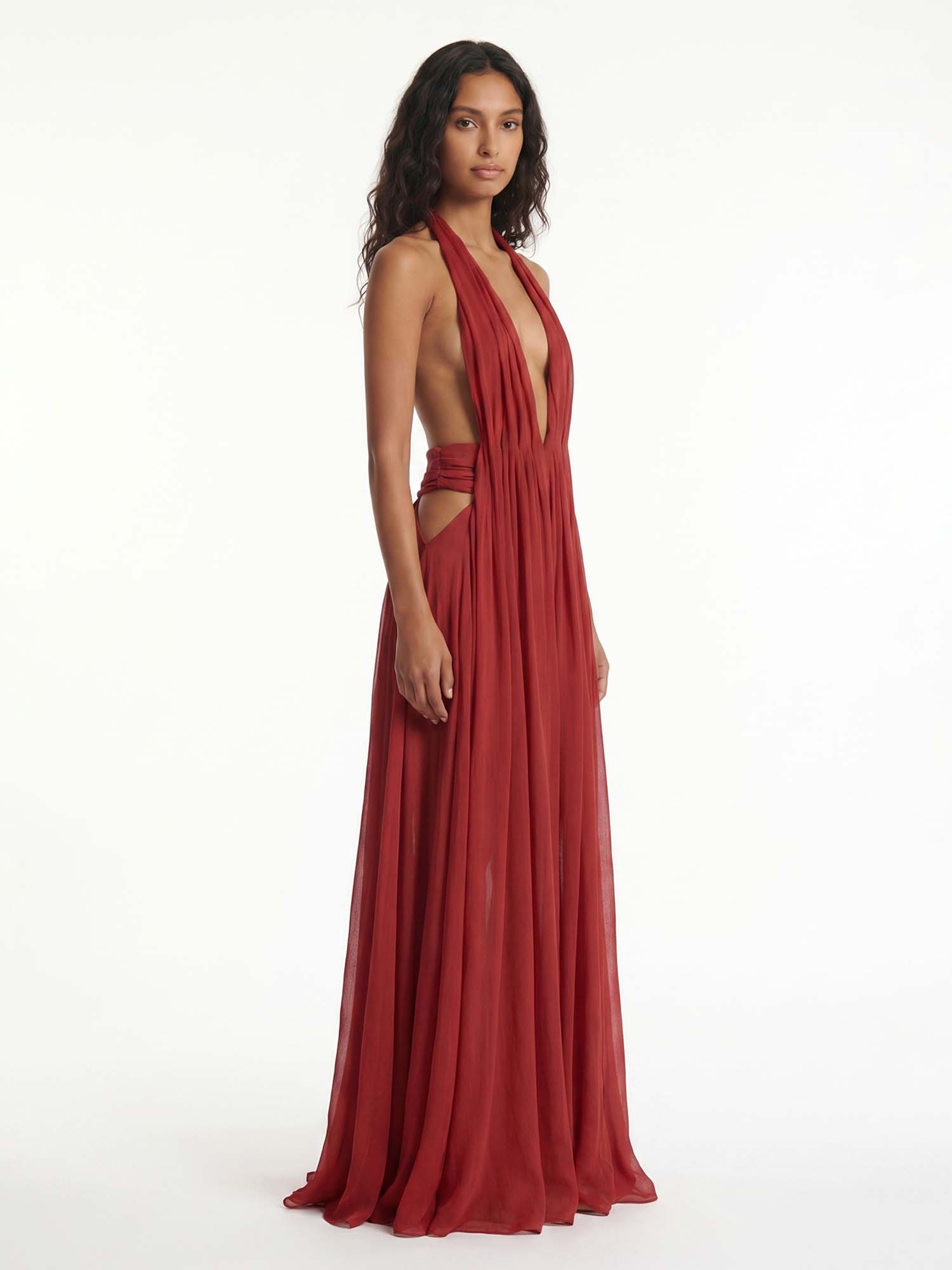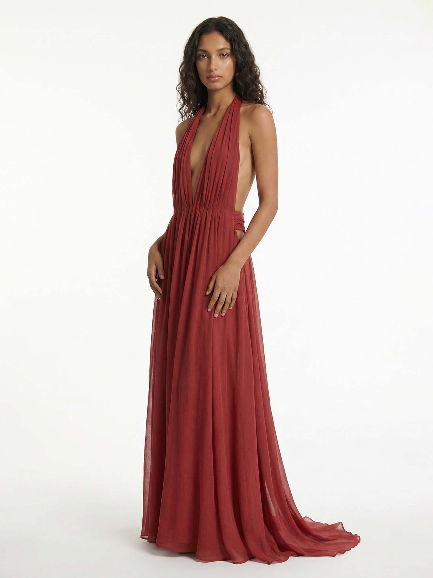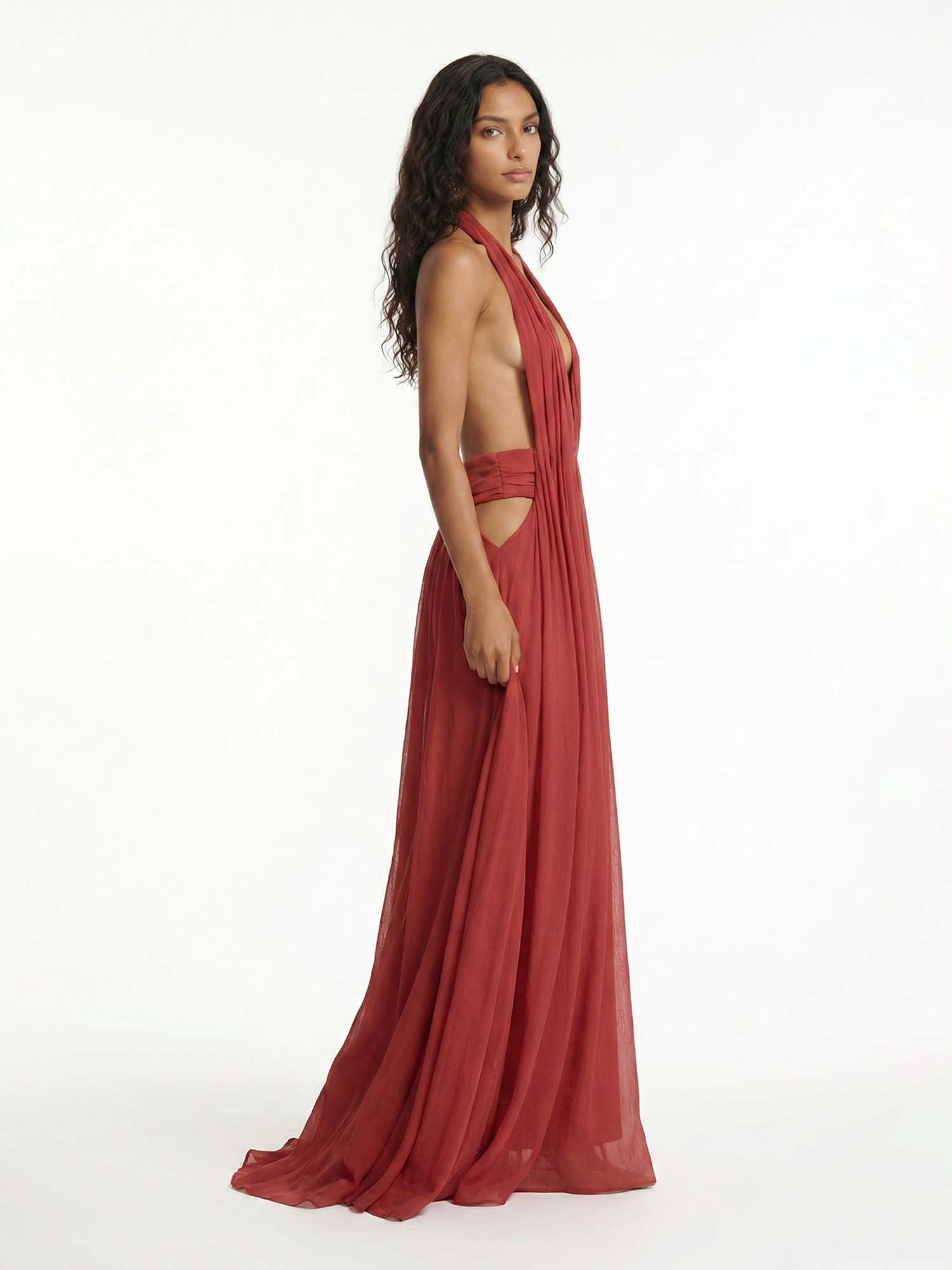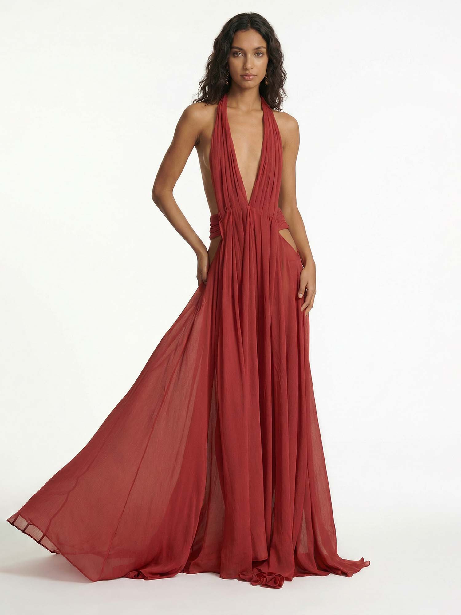 Let deep lines unfold where the halter neckline flows into liquid movement, embracing strength and softness in timeless poise with every gentle sway.