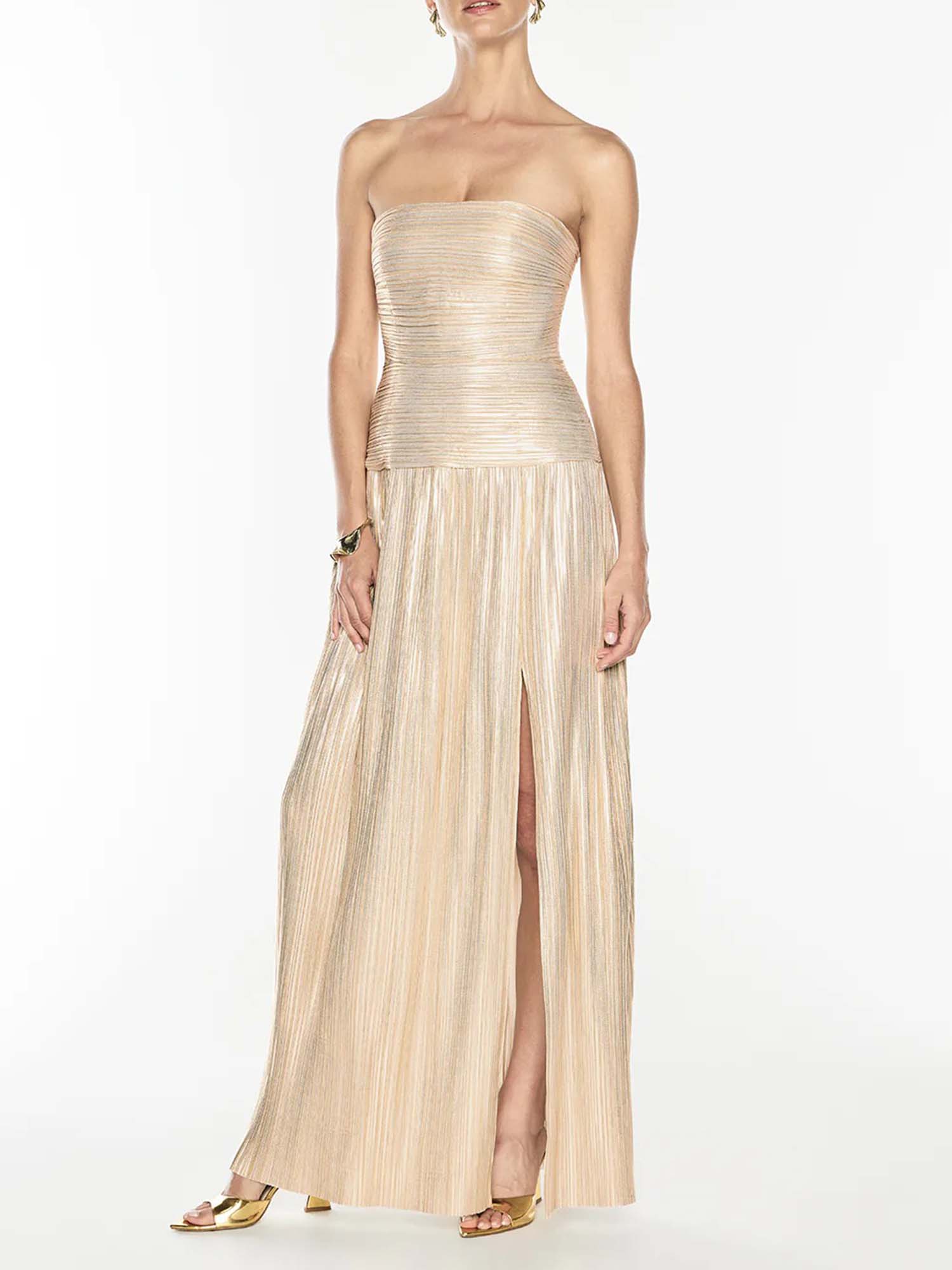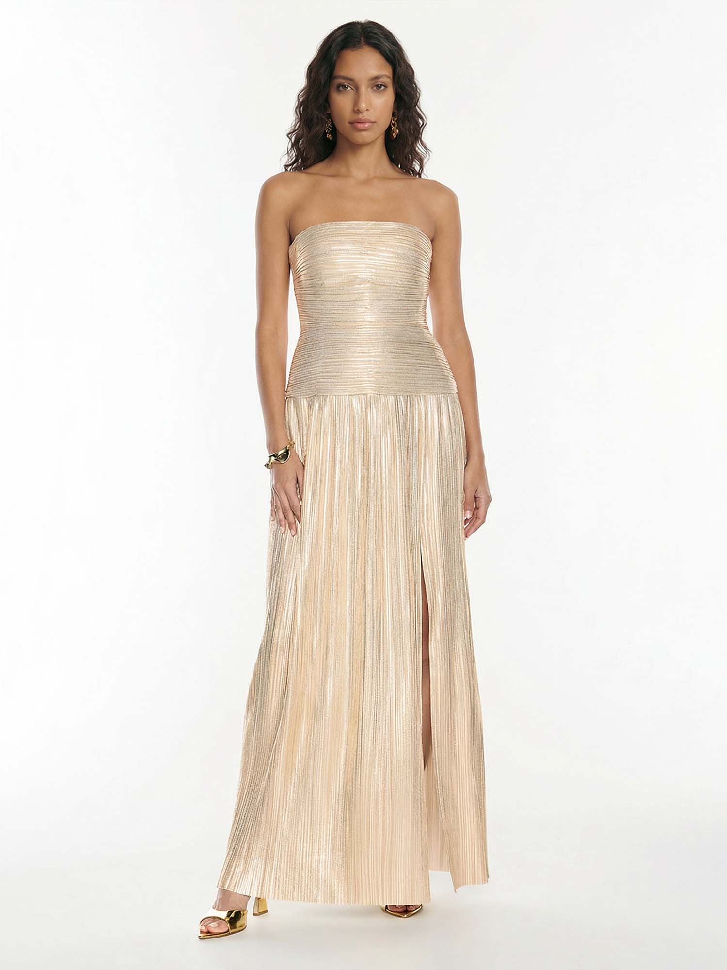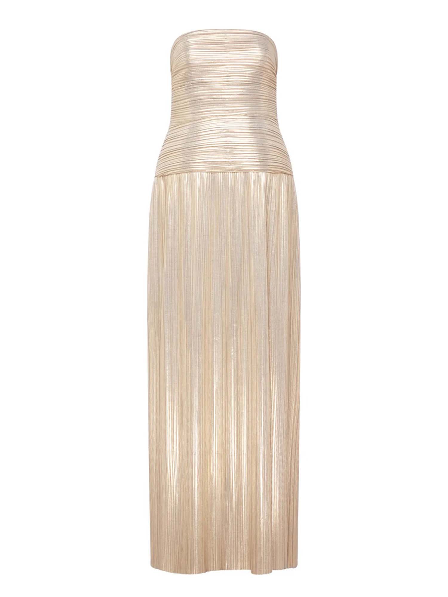 Golden Radiance Strapless Pleated Maxi Dress