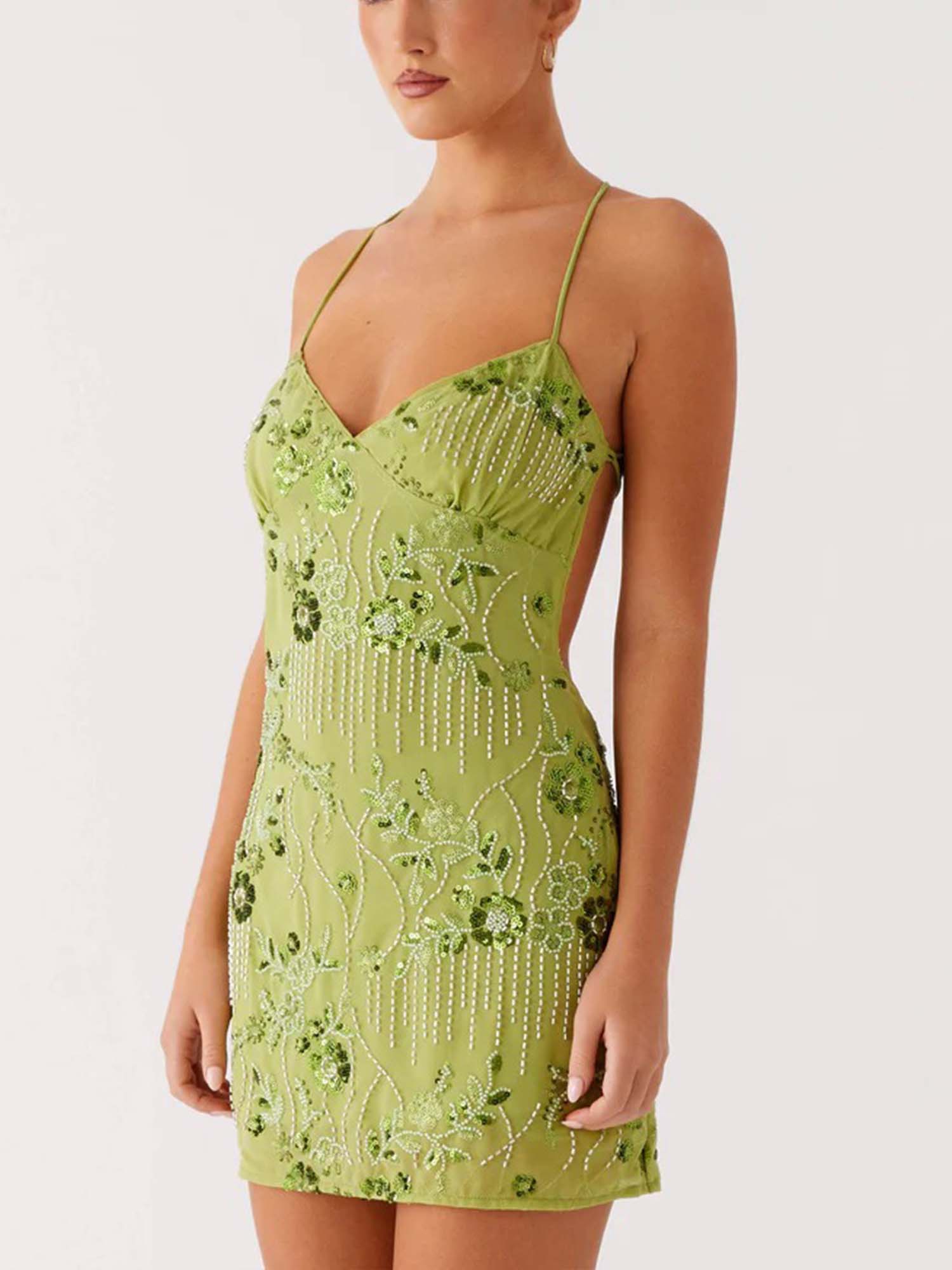 Delicate yet daring, this Green mini dress features intricate lacework and a structured corset bodice. The perfect pick for bachelorette nights or romantic date nights on holiday.