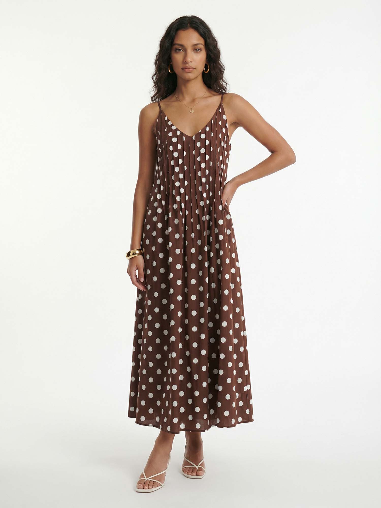 Let playful dots float in effortless rhythm in Dantўўase's Polka Strap Maxi Dress, where crisp circles scatter across the lightweight fabric in timeless, rhythmic repetition. Delicate spaghetti straps frame a softly gathered V-neckline, while the ruched bodice flows into a full, floor-skimming silhouette with gentle pleats and side slits for graceful movement. For golden-hour strolls or candlelit evenings, it becomes minimalist women's quiet reverie—airy, flirtatious, eternally charming.