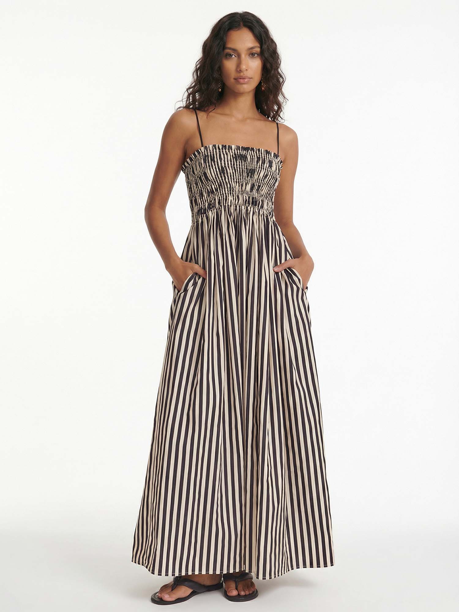 Let effortless rhythm flow in Dantўўase's Striped Breeze Maxi Dress, where crisp vertical stripes alternate in clean, timeless contrast across the lightweight fabric. The square neckline gathers softly into delicate spaghetti straps, while the ruched bodice cinches at the waist before flaring into a full, floor-skimming silhouette with deep side slits for graceful movement. For sun-drenched days or golden-hour evenings, it becomes minimalist women's quiet elegance—airy, poised, eternally serene.