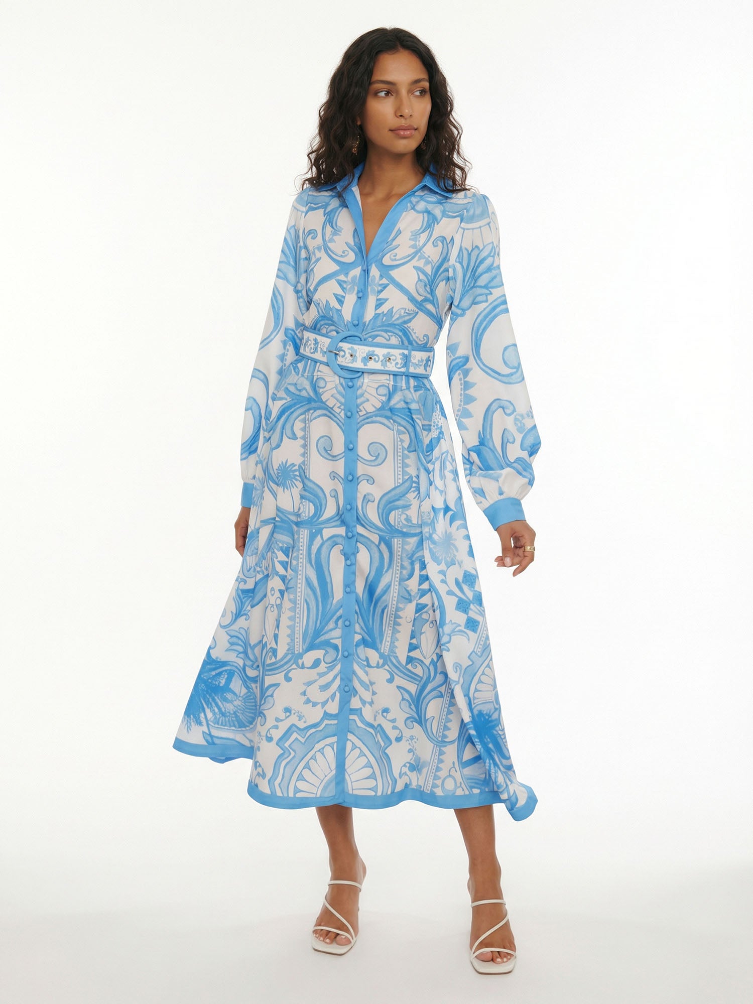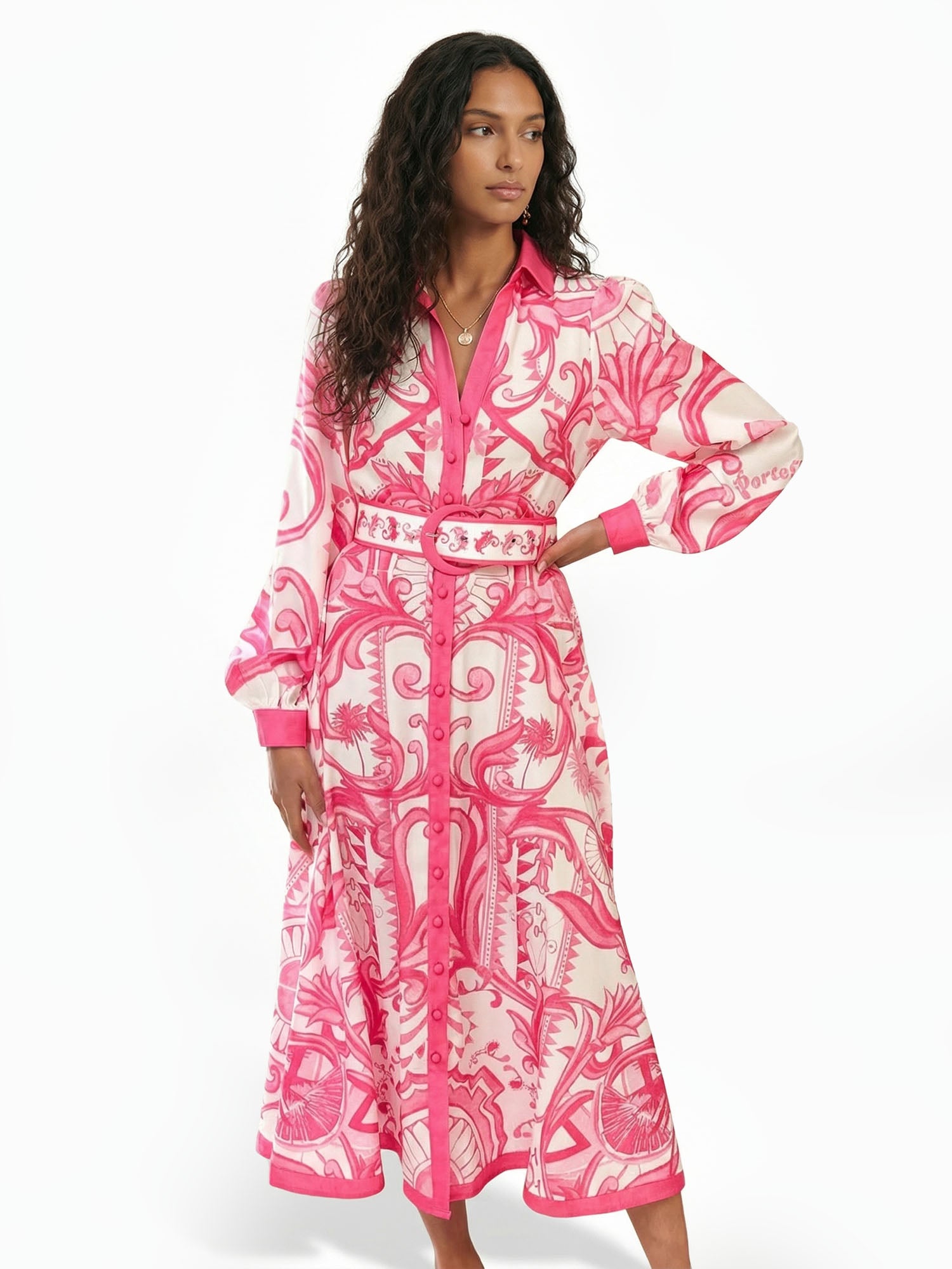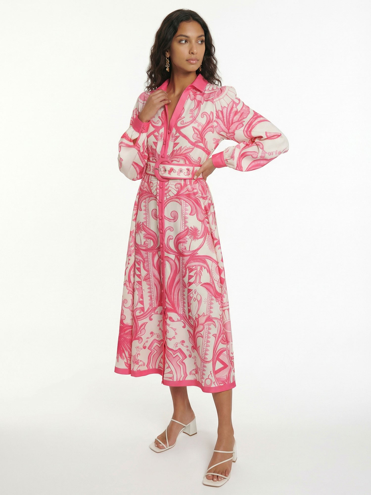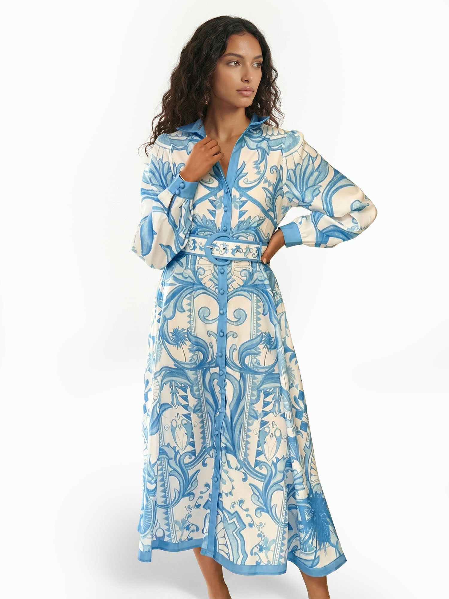 Let opulent symmetry awaken in Dantўўase's Baroque Petal Midi Dress, where mirrored floral mandalas and swirling acanthus vines entwine across the fabric in perfect harmony. The collared neckline opens to a deep V, framed by puffed sleeves that gather softly at the cuffs; a wide belt cinches the waist, while the midi hem flows with graceful volume. For twilight gatherings or sunlit promenades, it becomes minimalist women's living ornament—lush, balanced, and eternally captivating.