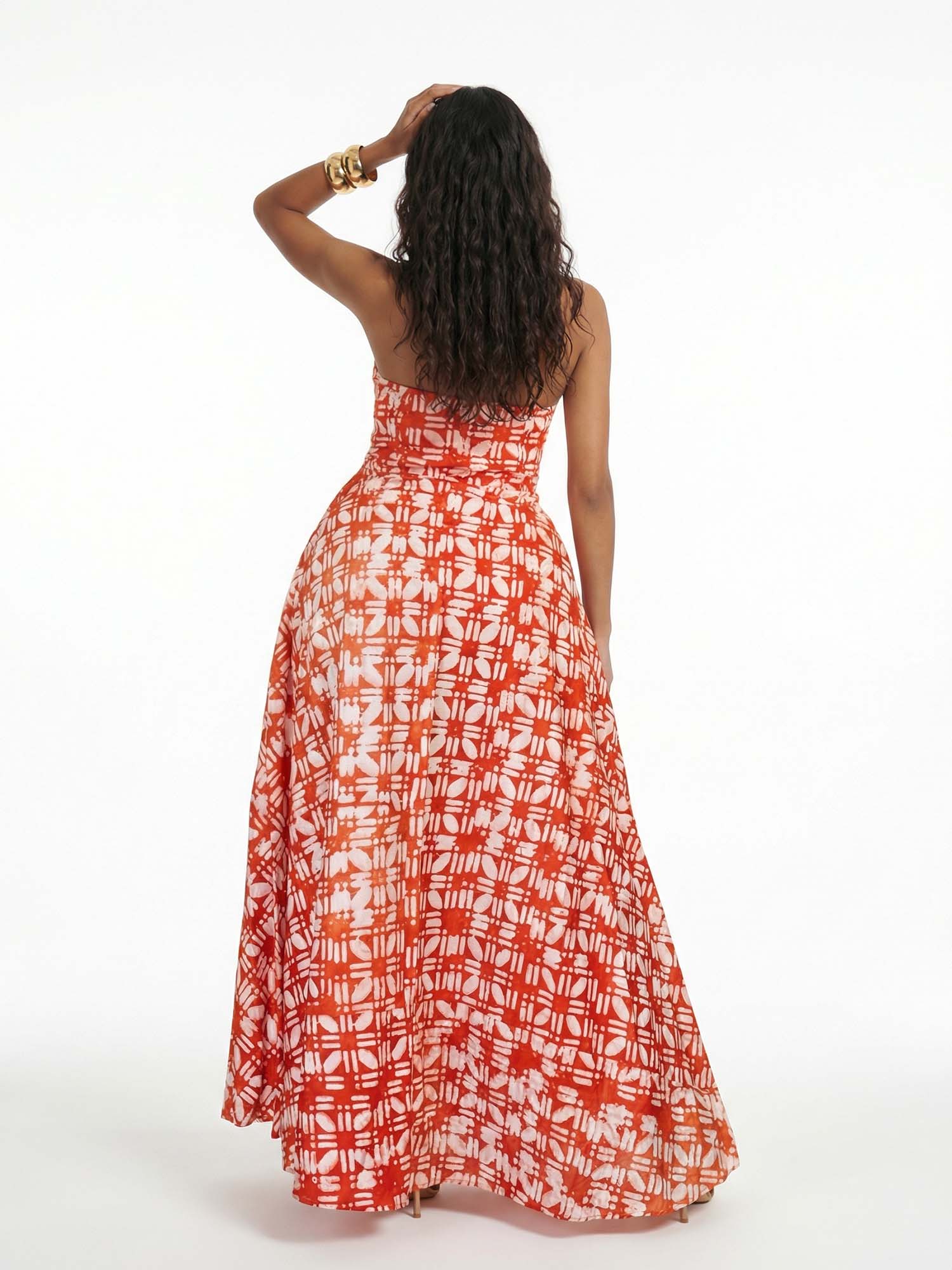 Let woven warmth unfold in Dantўўase's Coral Lattice Maxi Dress, where interlocking geometric motifs and subtle floral echoes form a rhythmic lattice across the fabric in harmonious repetition. The halter neck ties softly at the nape, framing a deep plunge that flows into a fitted bodice before cascading into generous volume at the floor-skimming hem. For sun-drenched ceremonies or twilight gatherings, it becomes minimalist women's quiet radiance—elegant, structured, and eternally poised.