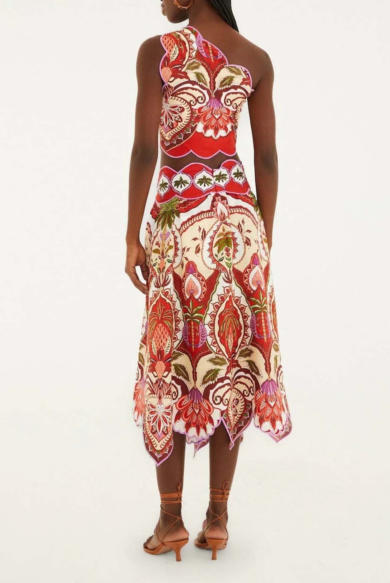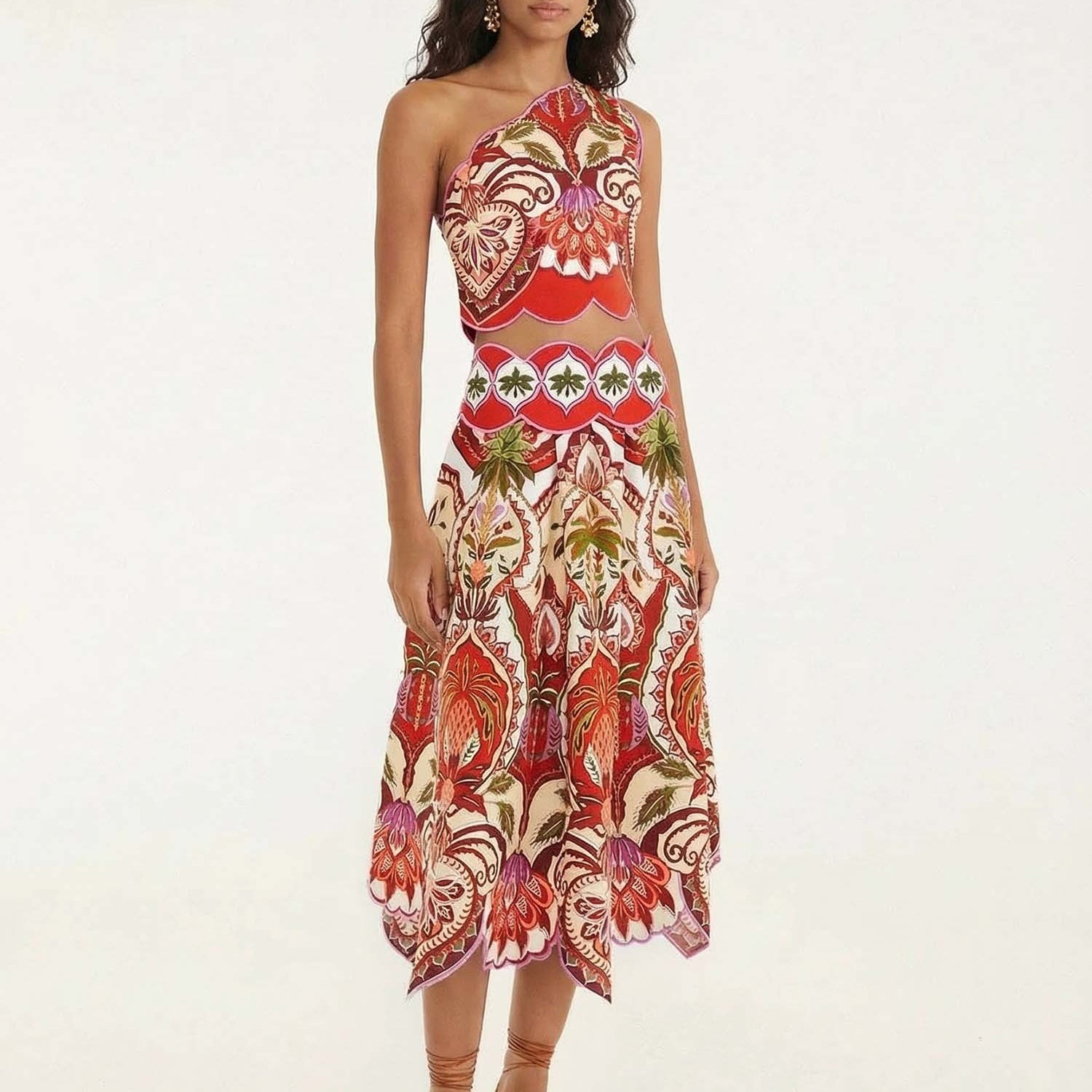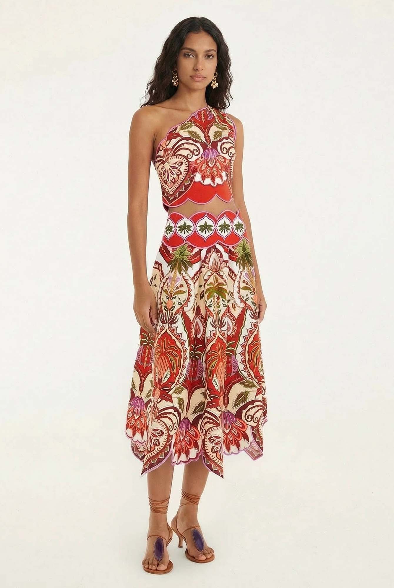 Flowing with energy, this vibrant red maxi dress showcases a bold artistic print and flattering neckline—made for dancing under the stars.