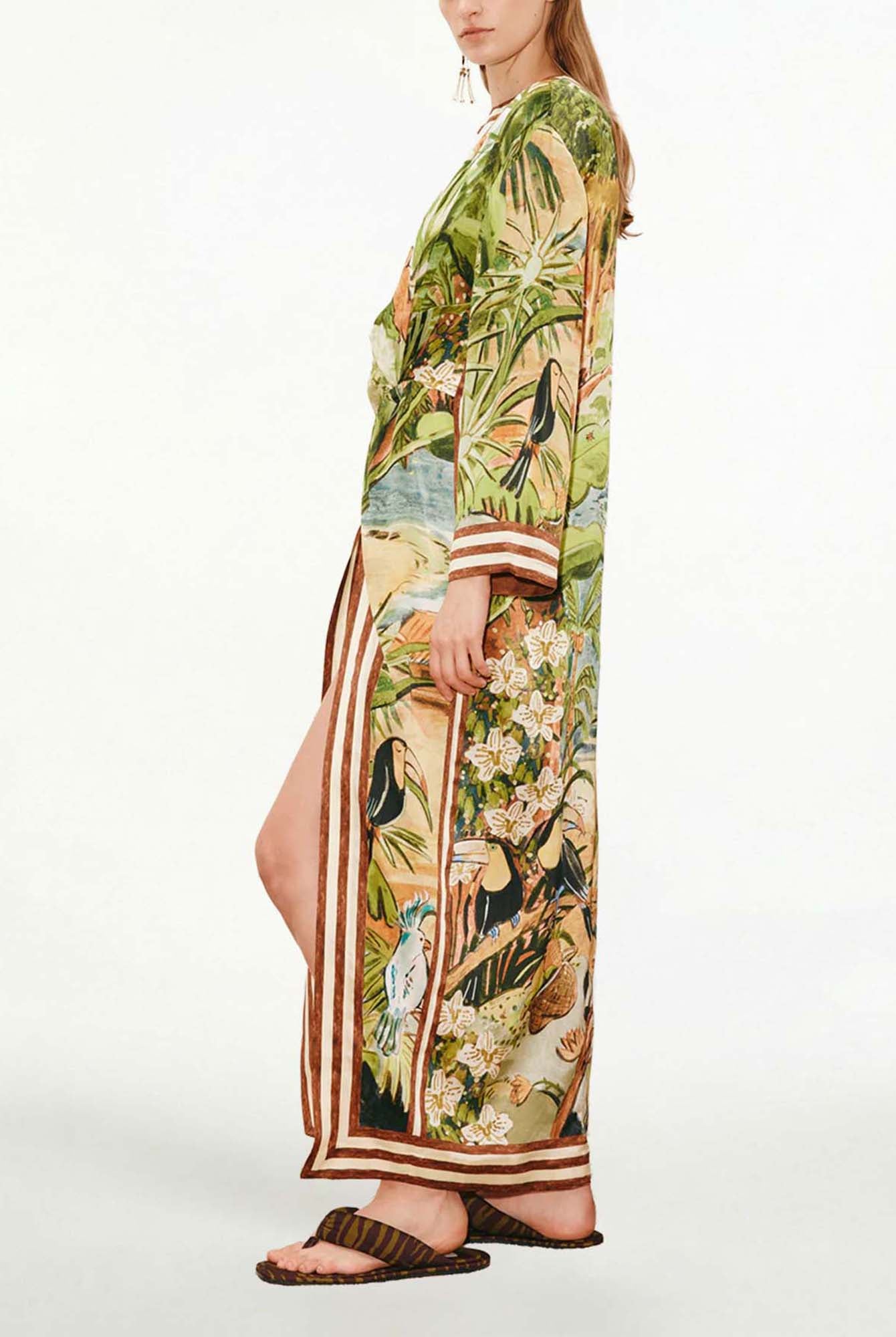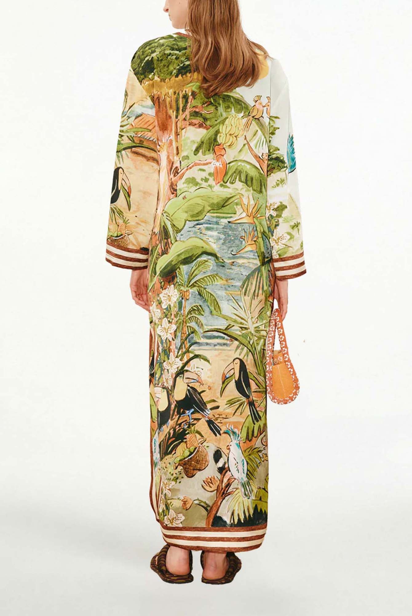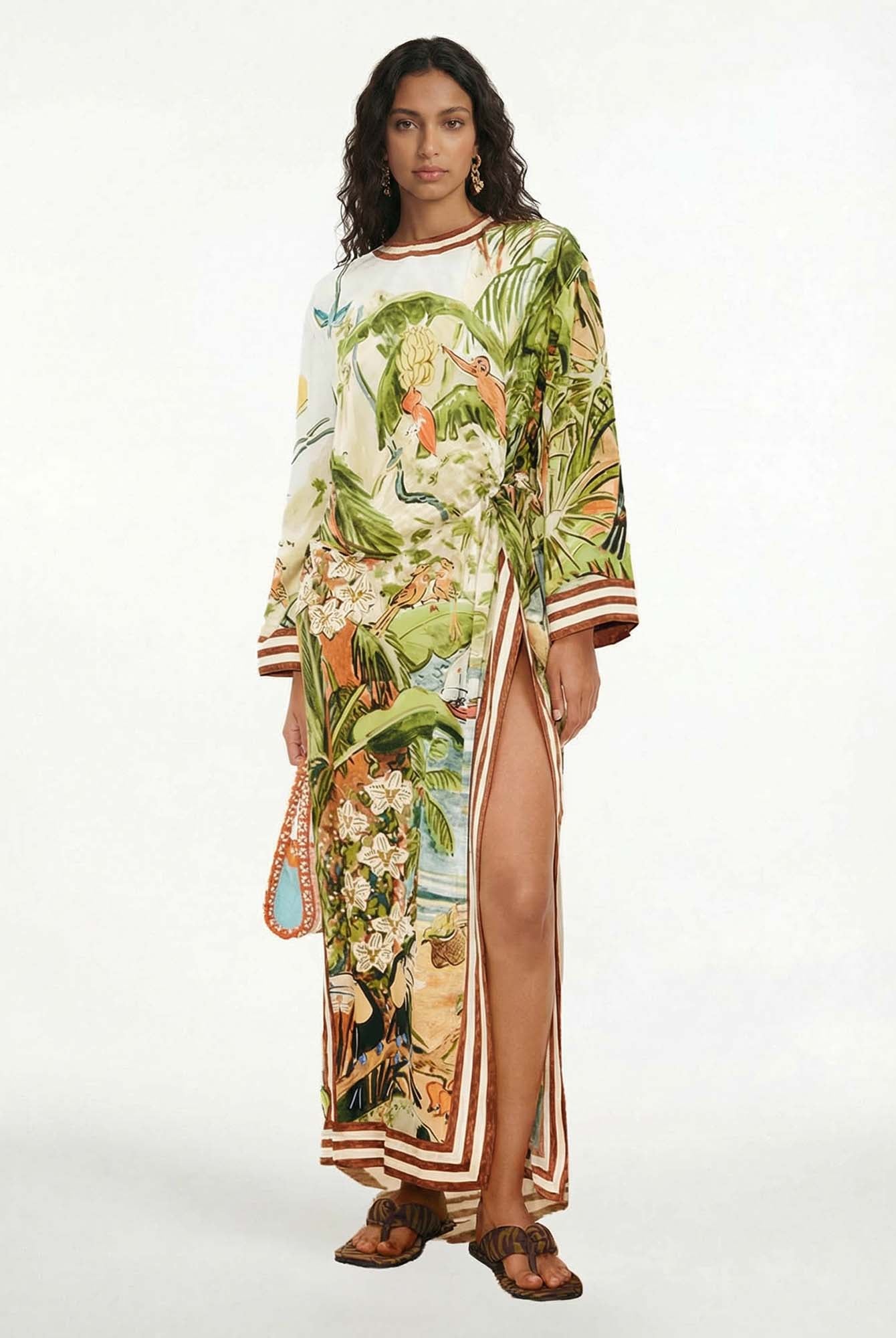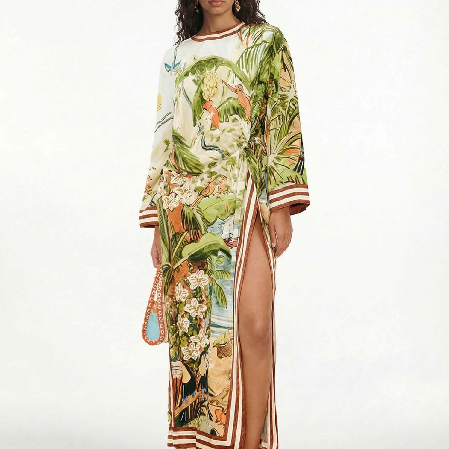 Flowing with energy, this vibrant red maxi dress showcases a bold artistic print and flattering neckline—made for dancing under the stars.