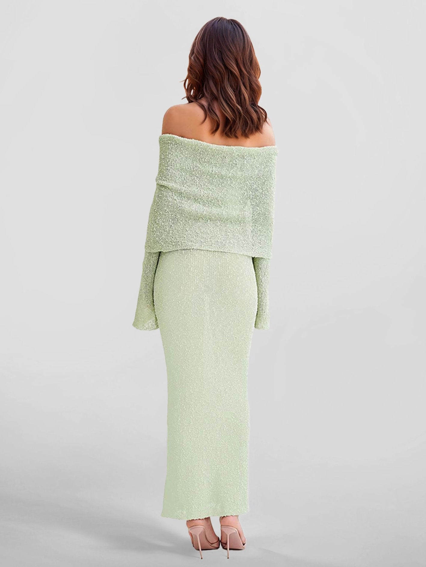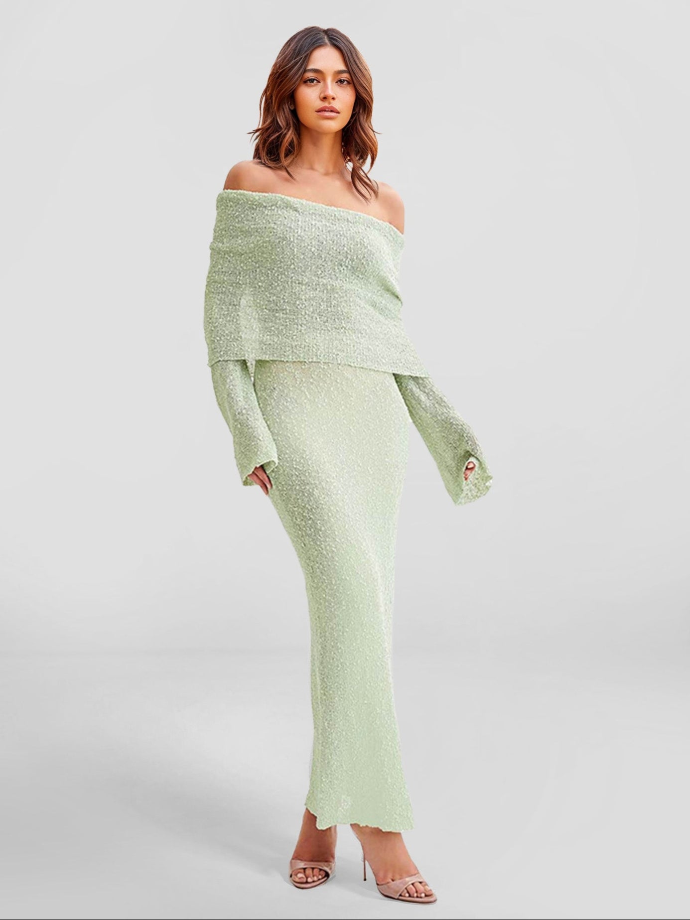 Step into elegance with this Elegant Off-Shoulder Knit Midi Dress. The flowing design and off-shoulder neckline make it perfect for a formal event or a chic evening out.