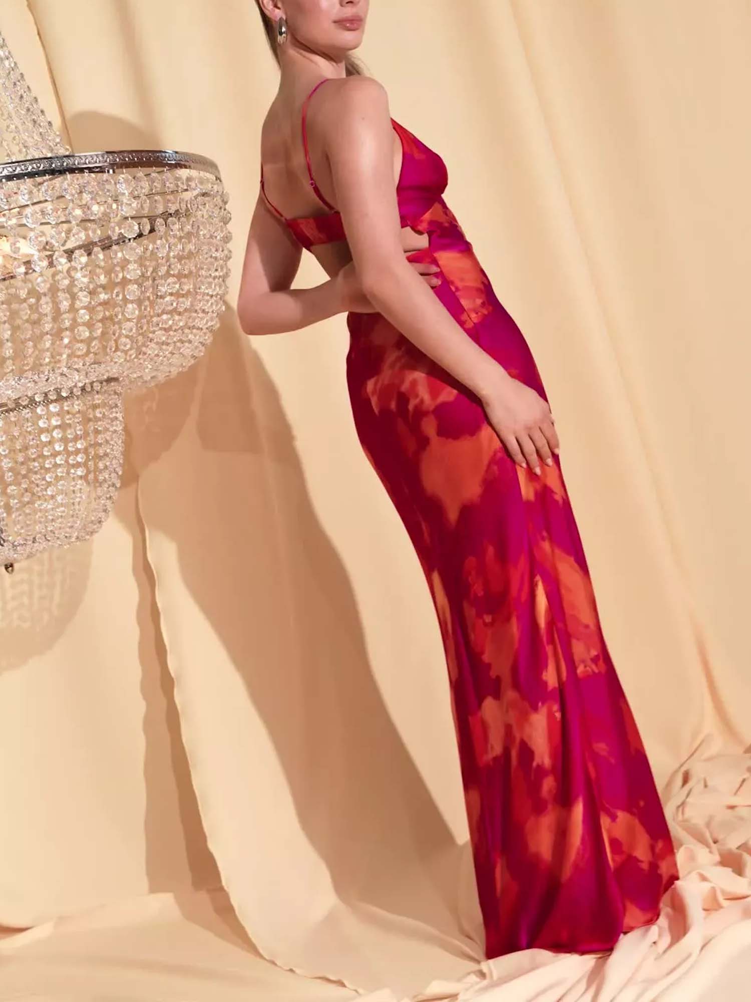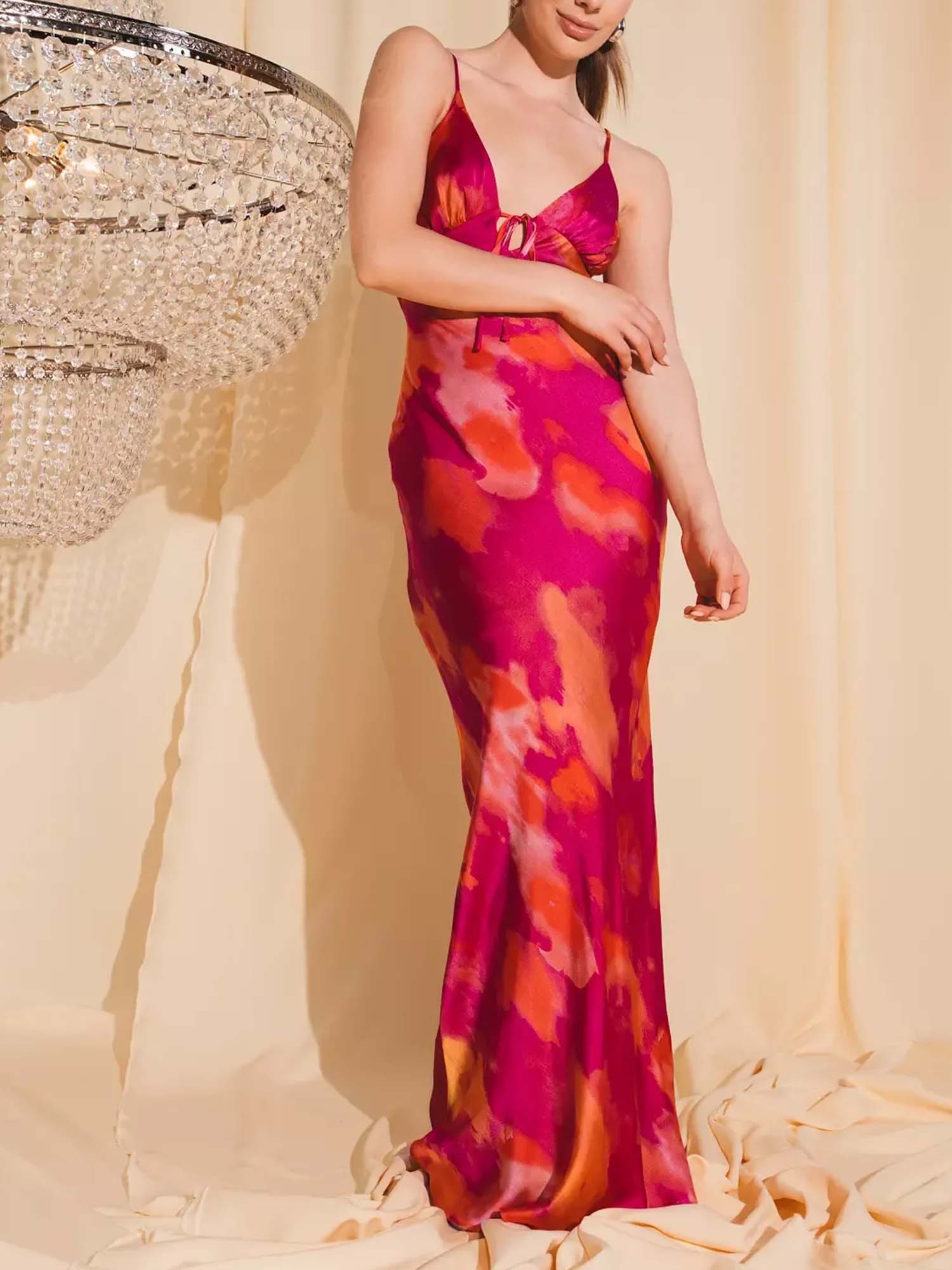 Let hidden flames dance beneath the surface in Dantўûase's Ember Veil Maxi Dress, where warm tones and abstract strokes blur like embers glowing through sheer mist. The soft spaghetti straps and fluid layers move with whispered intensity. It becomes minimalist women's quiet fire—passionate, ethereal, eternally captivating.