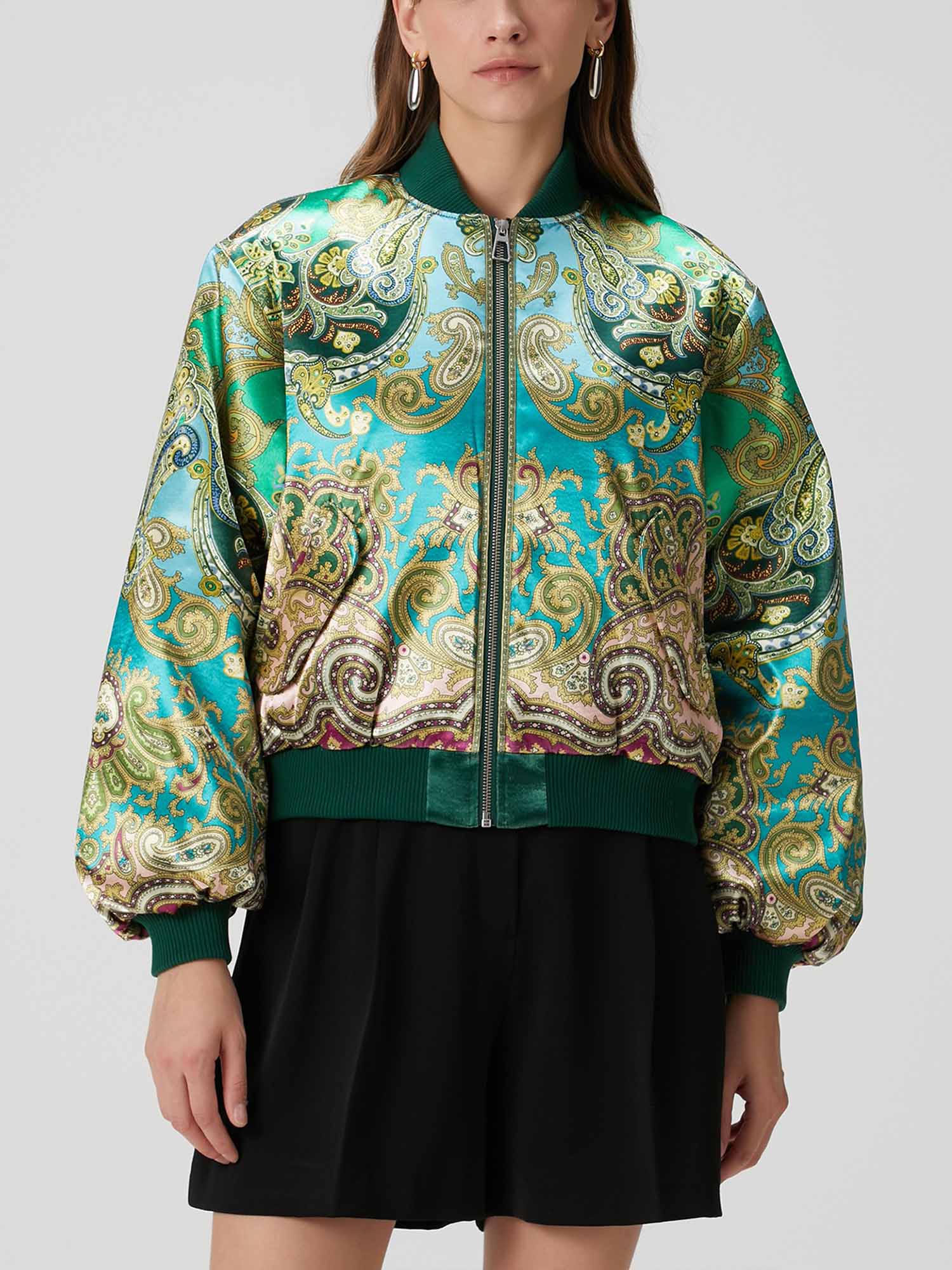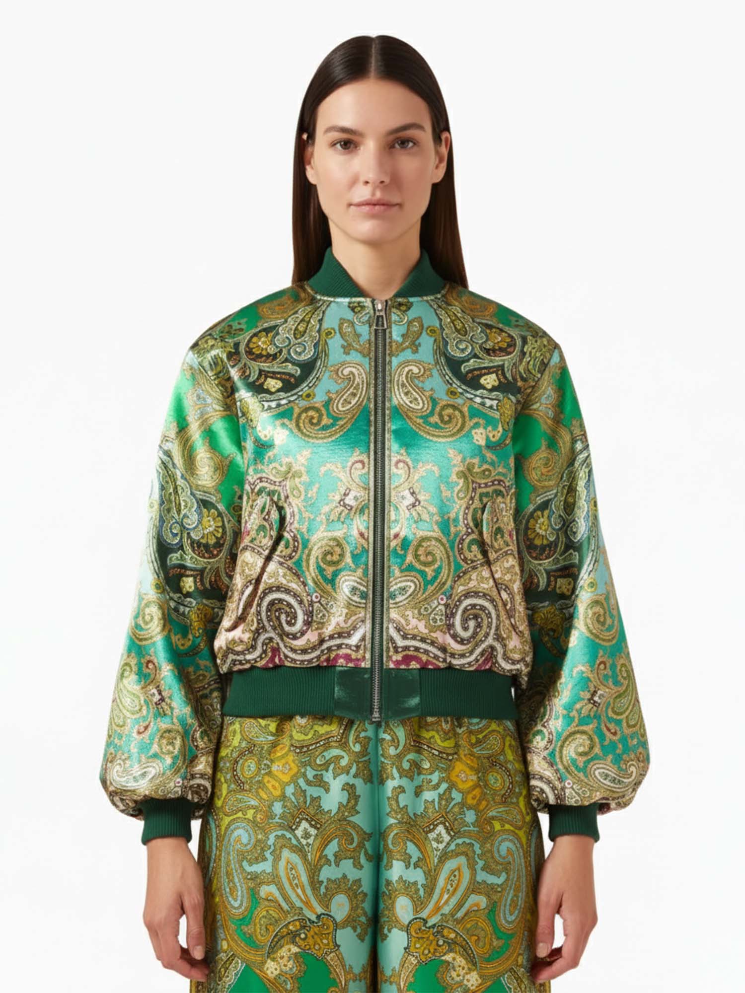 This vibrant emerald green satin bomber jacket bursts with intricate paisley motifs in teal and gold accents, blending Eastern opulence with relaxed street style.