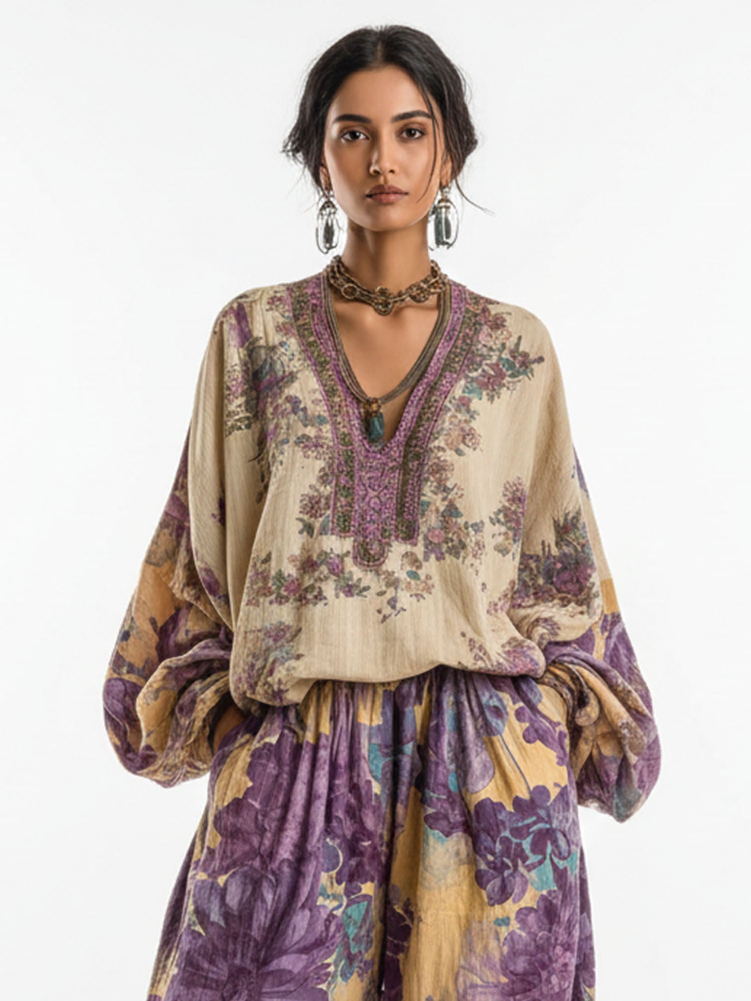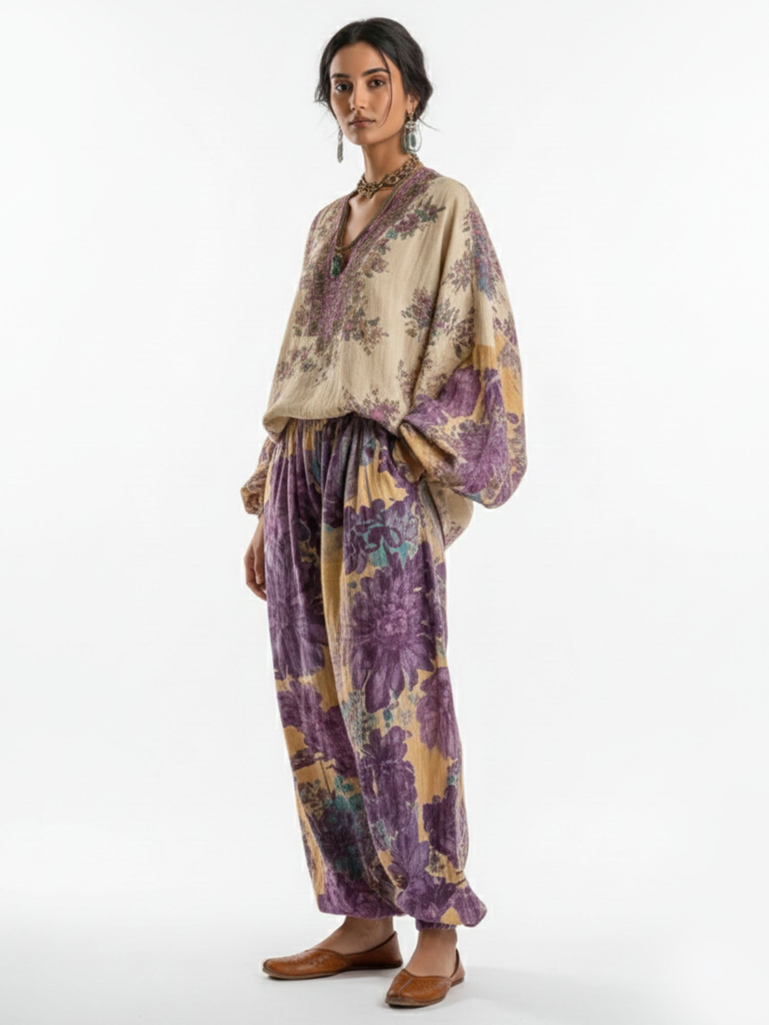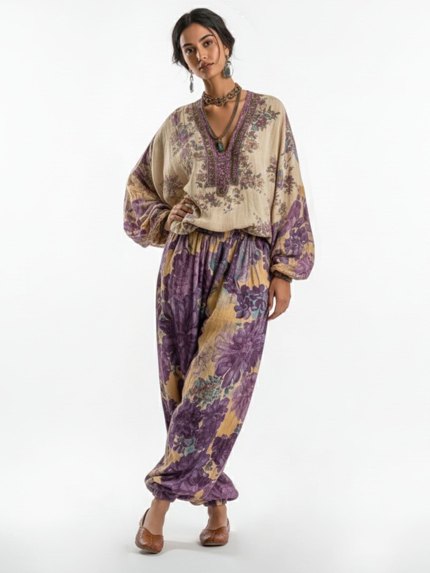 In the cascade of veiled petals, this blouse drapes with voluminous sleeves and a deep V-neck that cradles the form's quiet flourish, where shared floral motifs entwine like hidden gardens in perfect harmony with its companion pants. Its flowing lines summon effortless enigma, a graceful silhouette blending bold blooms with timeless allure.