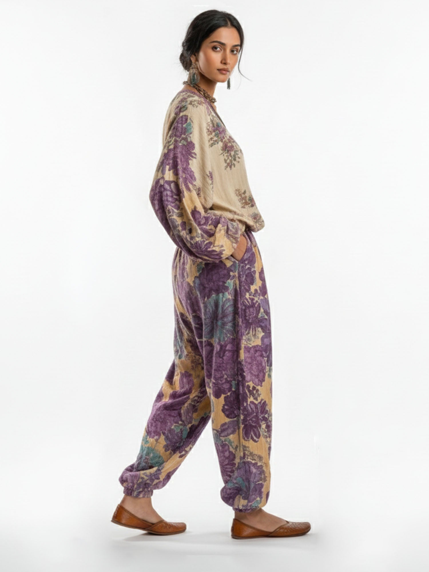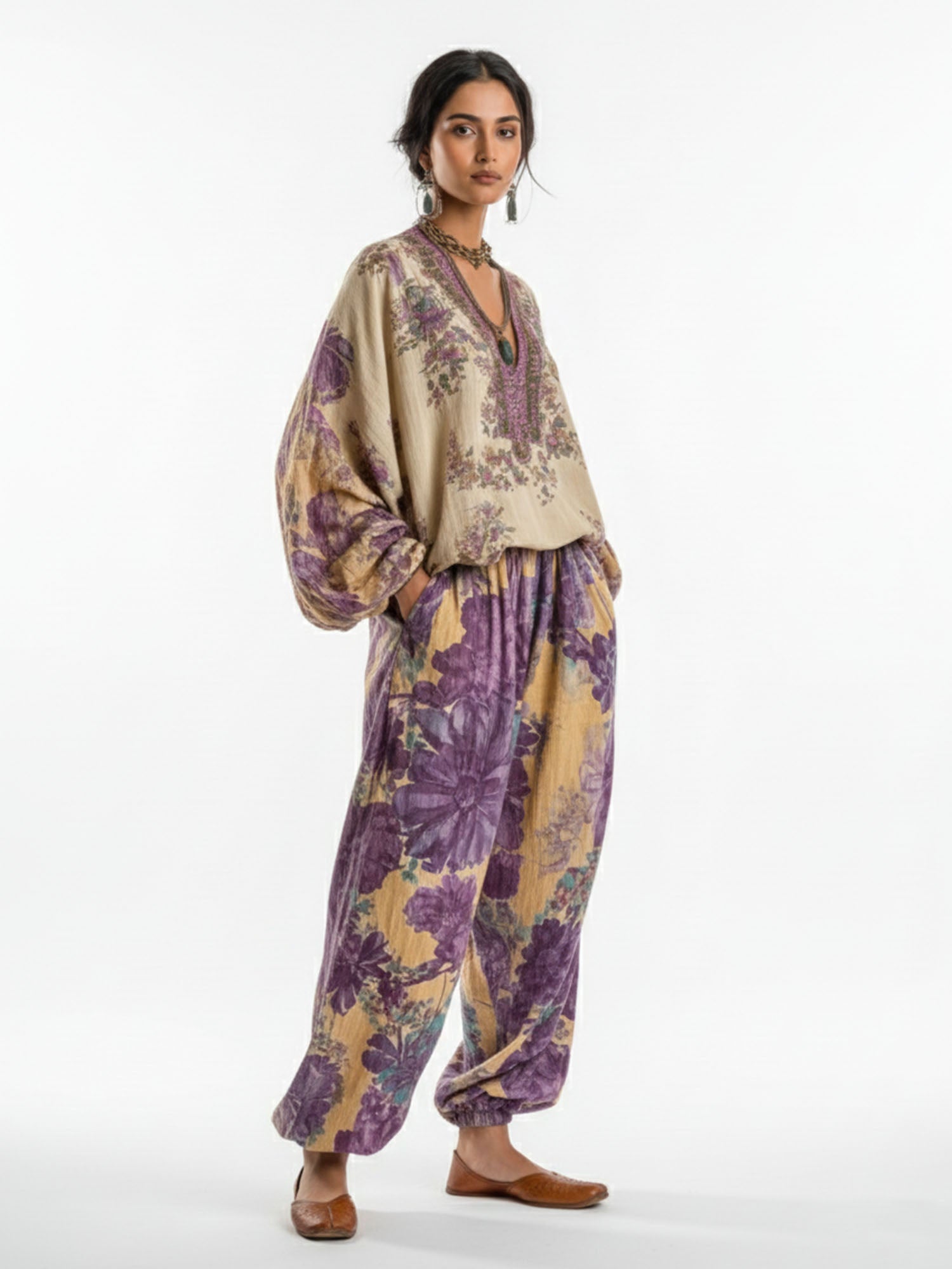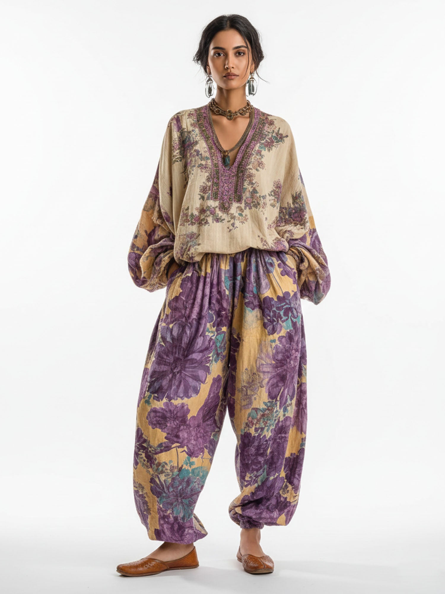 In the cascade of veiled petals, this blouse drapes with voluminous sleeves and a deep V-neck that cradles the form's quiet flourish, where shared floral motifs entwine like hidden gardens in perfect harmony with its companion pants. Its flowing lines summon effortless enigma, a graceful silhouette blending bold blooms with timeless allure.