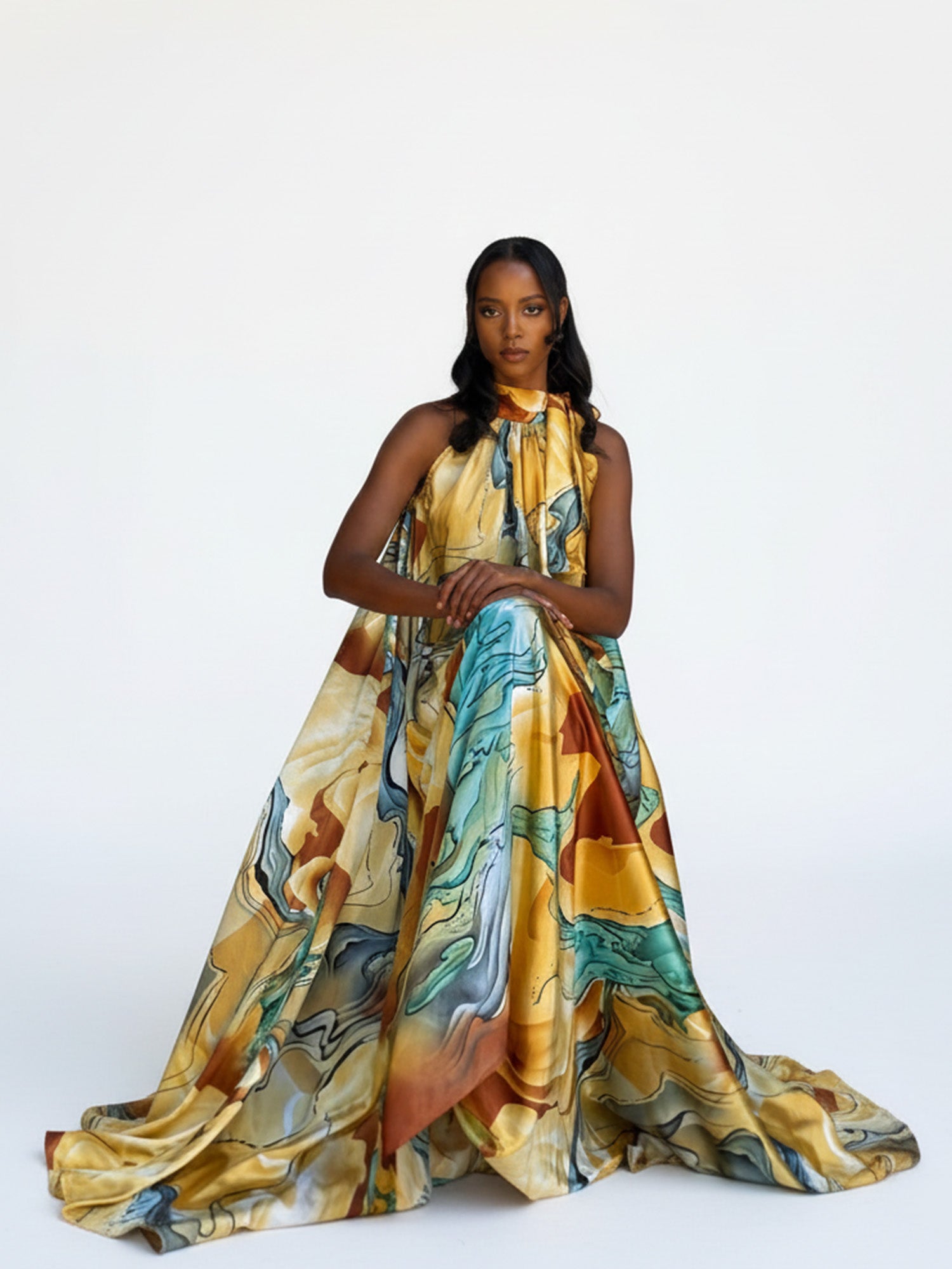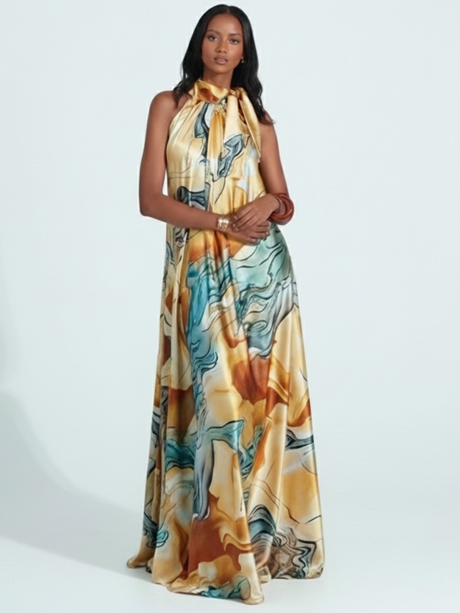 In the swirl of unspoken currents, this maxi dress unfurls like a dream's quiet cascade, where halter ties cradle veiled freedoms amid flowing veils. Its abstract motifs summon twilight drifts, a graceful silhouette for moonlit wanderings or solitary horizons, weaving enigma into the hem's endless murmur.
