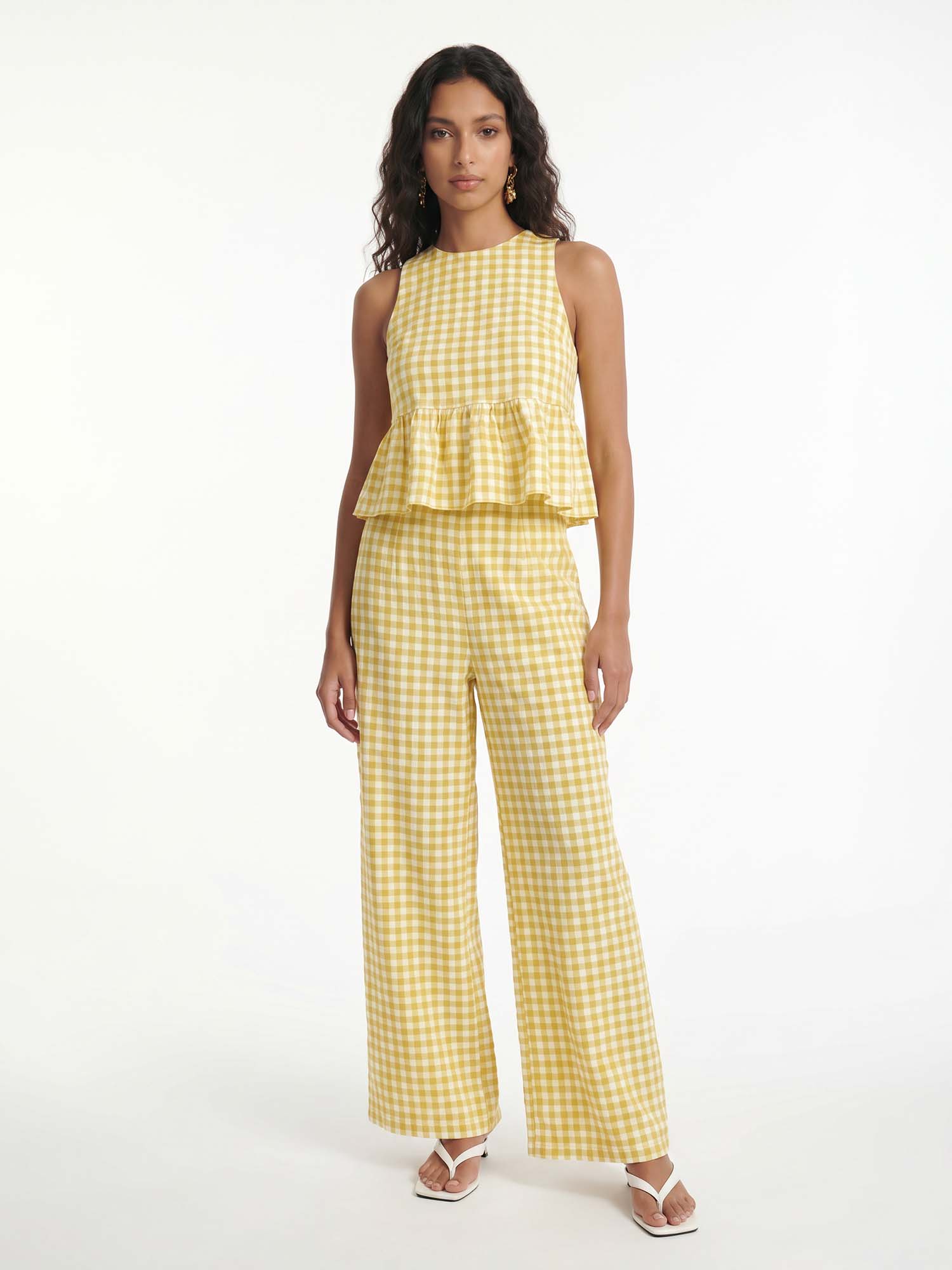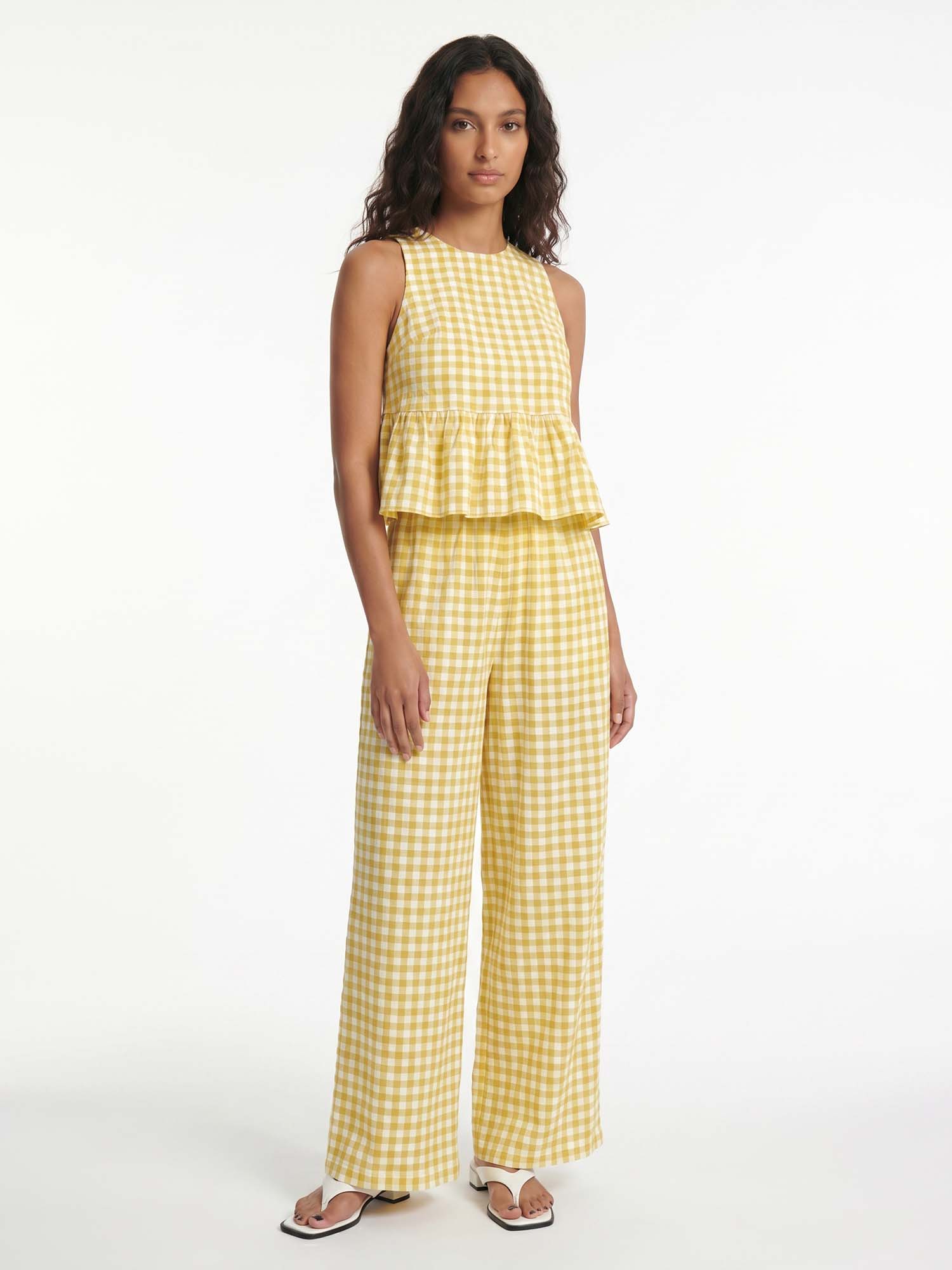 Let soft checks gather where the peplum silhouette creates balanced ease, inviting serene harmony and timeless femininity with every gentle movement.