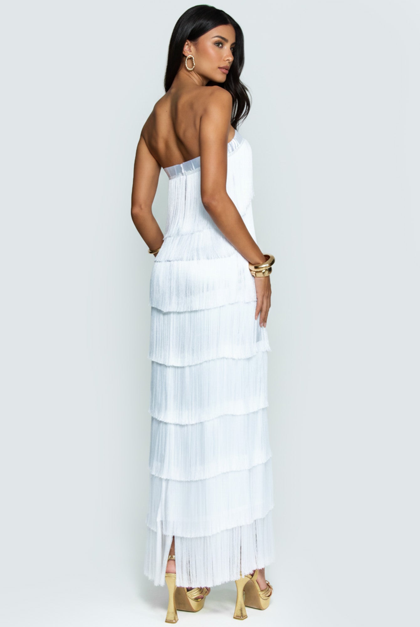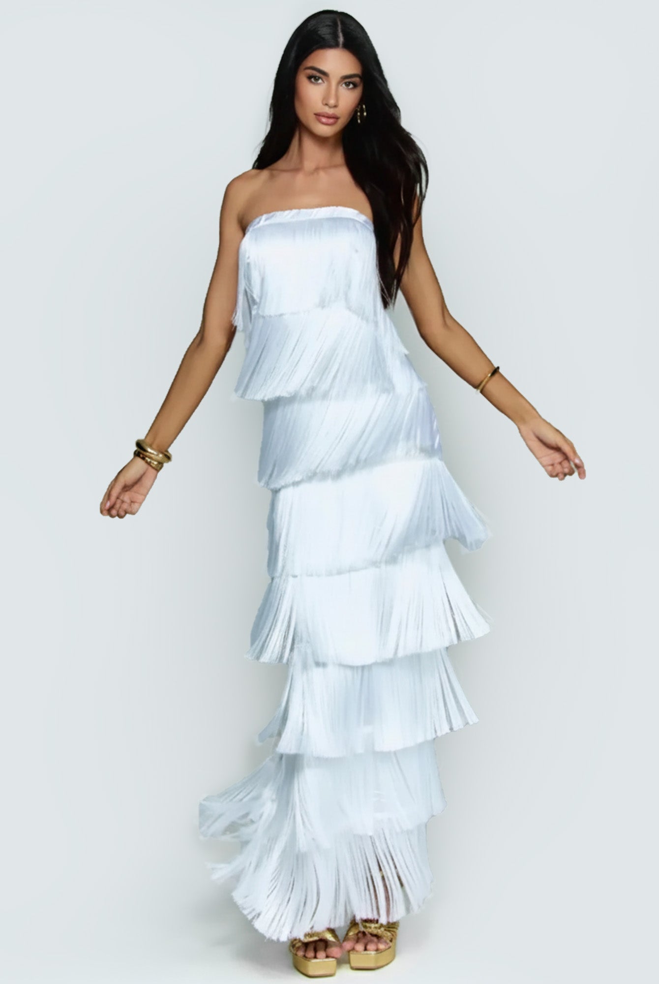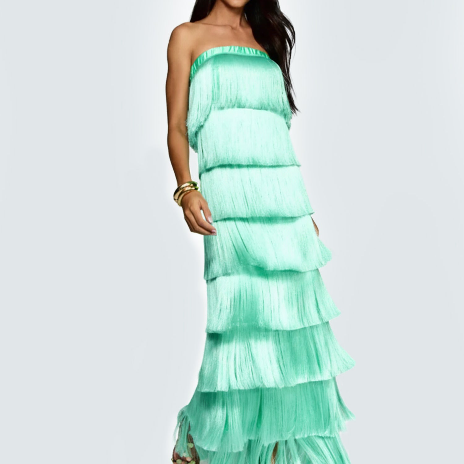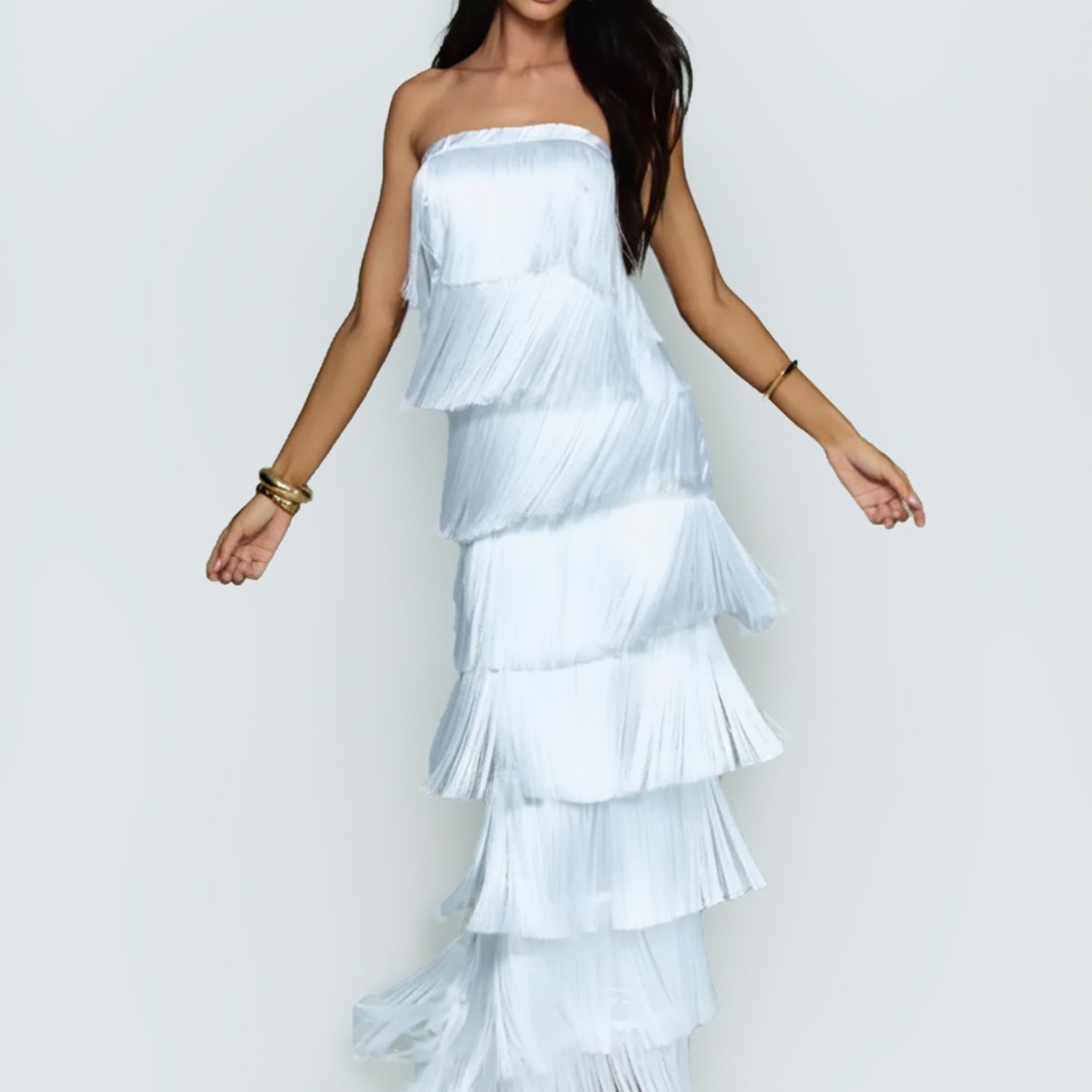 In the hush of layered sighs, this maxi dress unfurls like a waterfall of forgotten dances, where strapless fringes sway in silent rebellion against the form. Its ethereal layers summon moonlit freedoms, a bohemian silhouette for twilight festivals or whispered freedoms, threading wild grace into the hem's endless ripple.