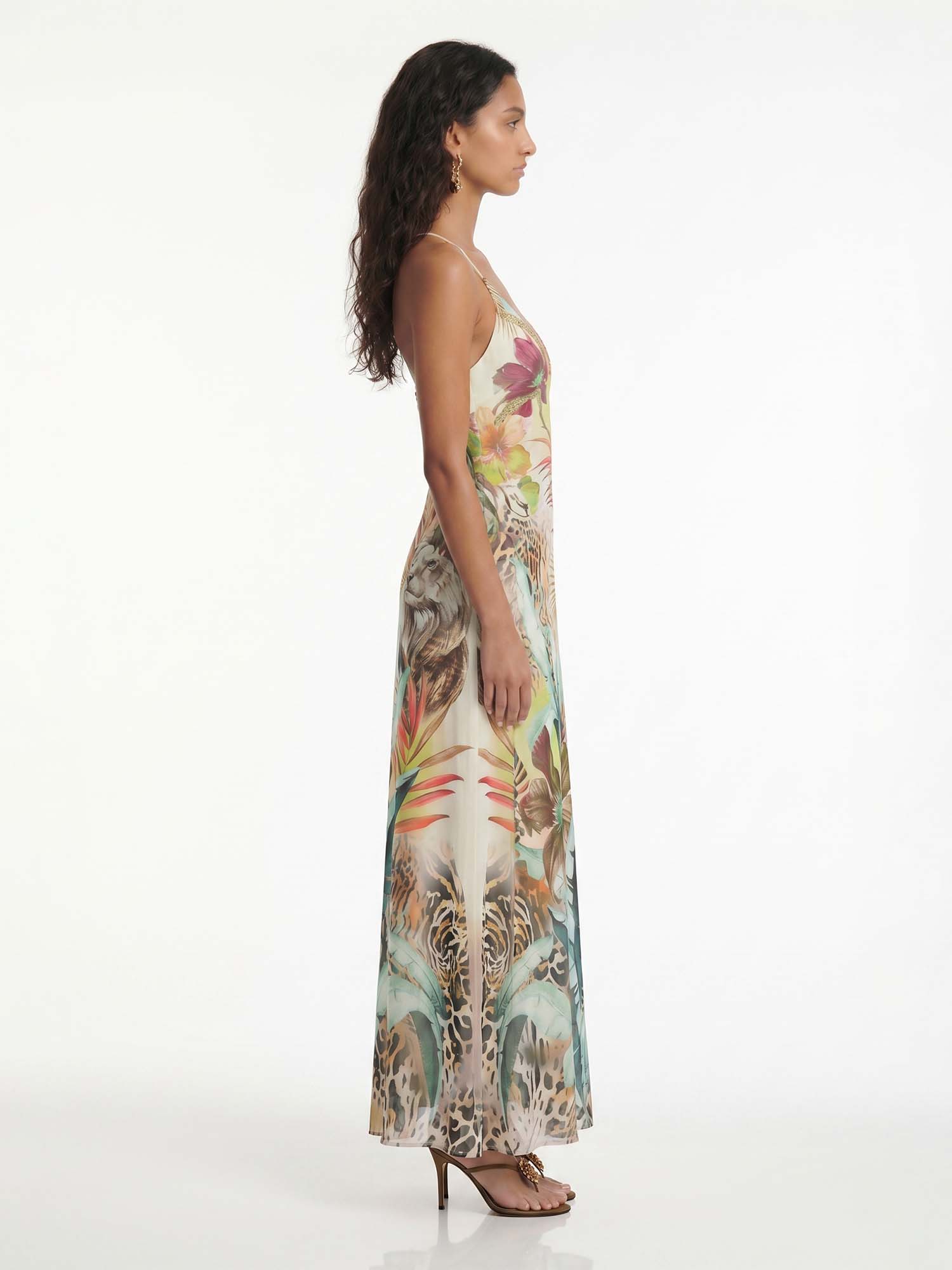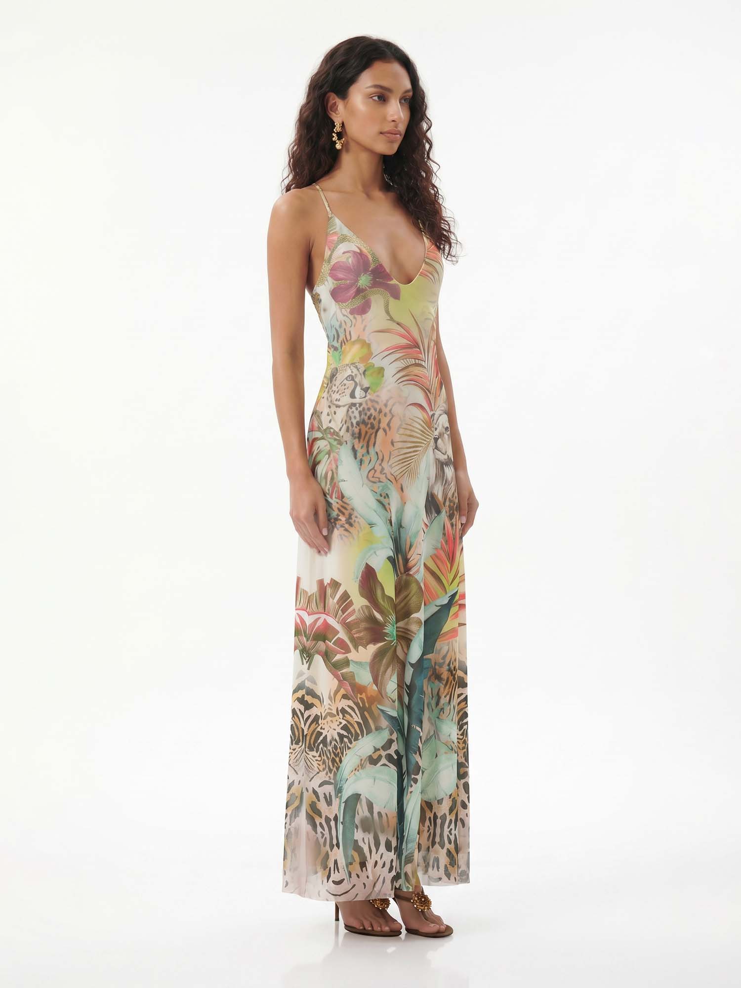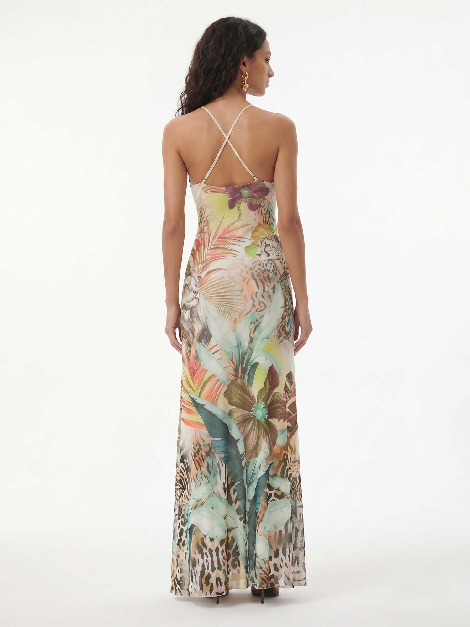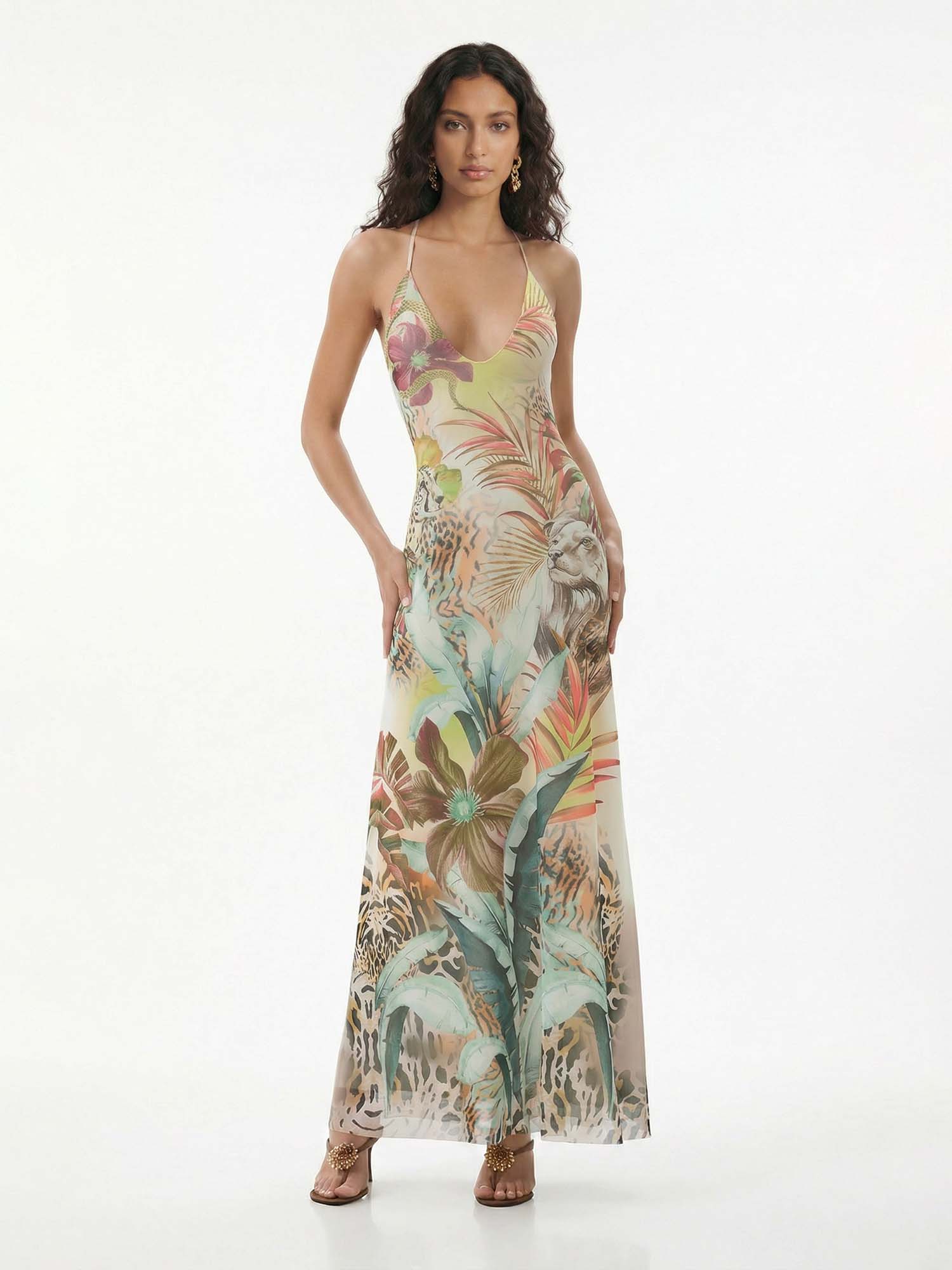 Let vibrant florals unfold across the halter form where soft gathers meet flowing movement, evoking sunlit gardens and timeless delight.
