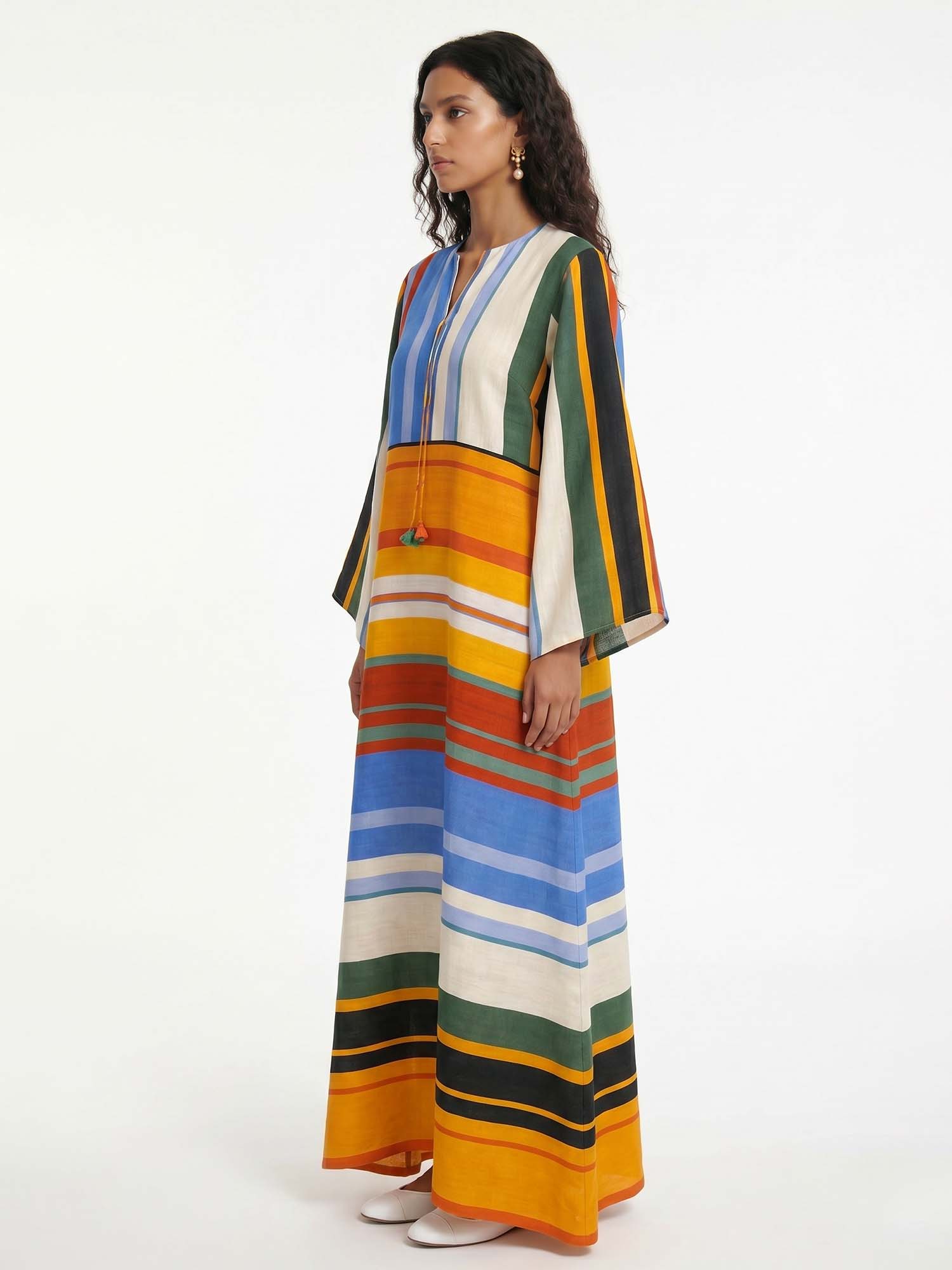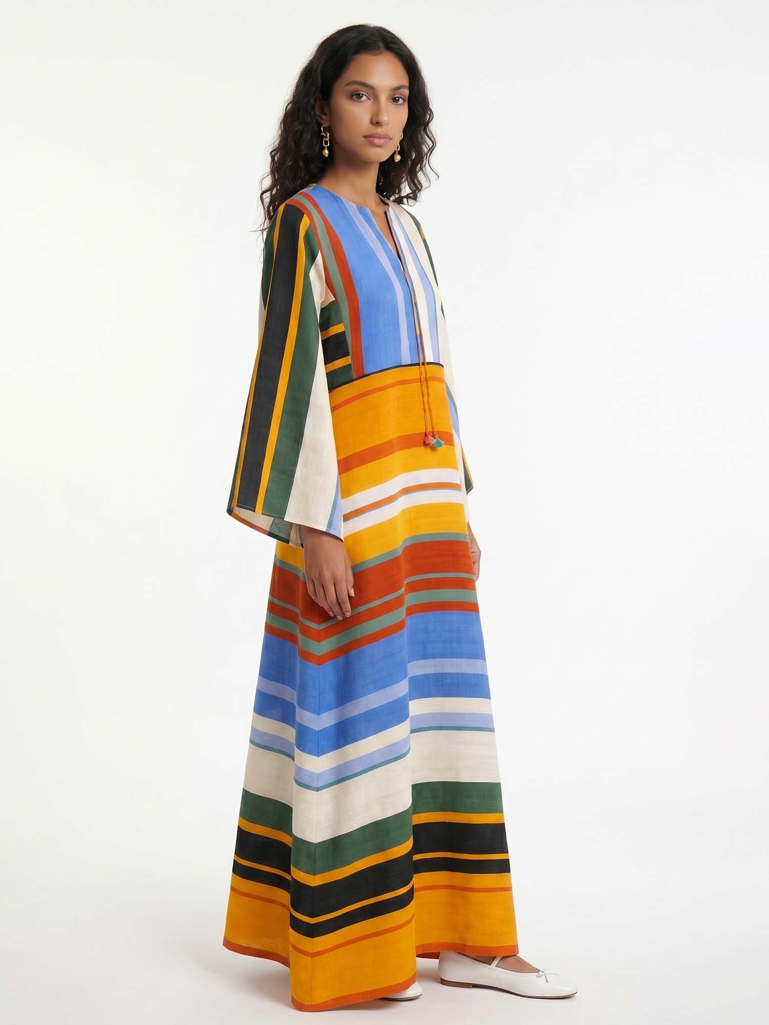 Let colorful bands unfold where the relaxed silhouette moves in balanced rhythm, inviting serene harmony and timeless femininity with every gentle step.