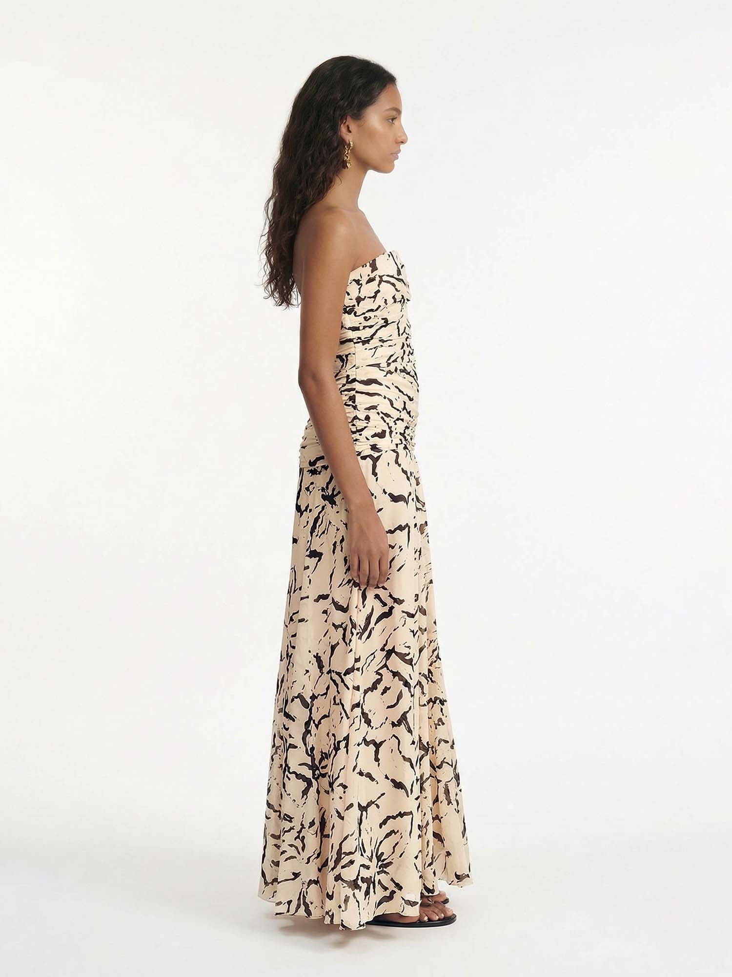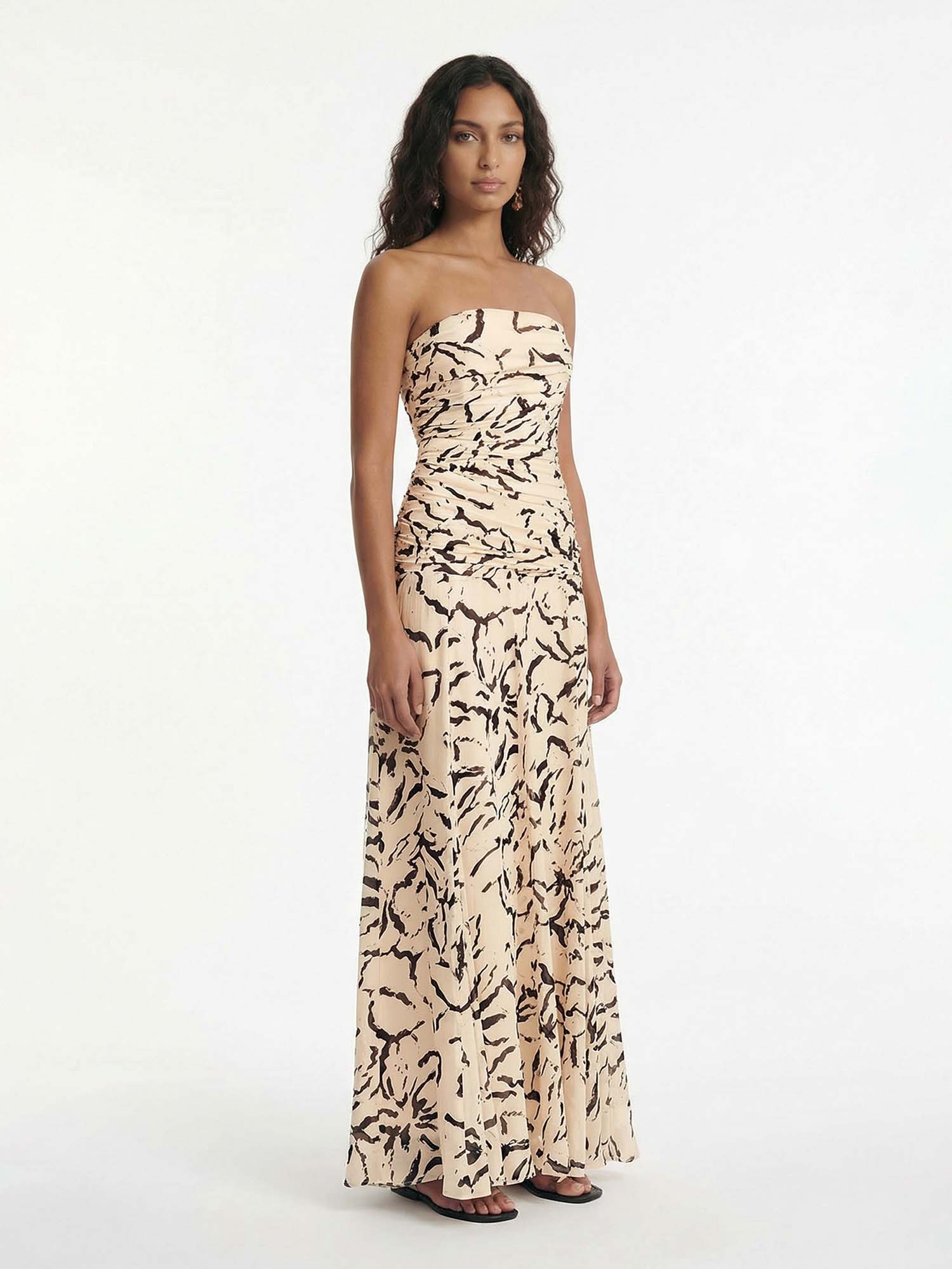 Let fluid shadows dance in Dantўўase's Ink Marble Maxi Dress, The strapless neckline sculpts into a ruched bodice that gathers softly at the waist, flowing into a draped, floor-skimming silhouette with gentle asymmetry and effortless movement. For candlelit evenings or sun-drenched ceremonies, it becomes minimalist women's quiet intensity—elegant, sensual, and eternally captivating.