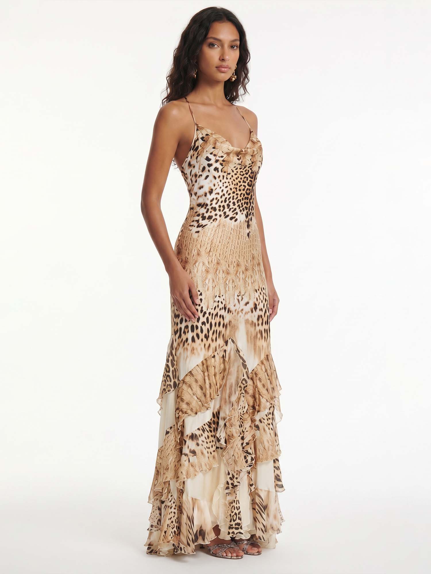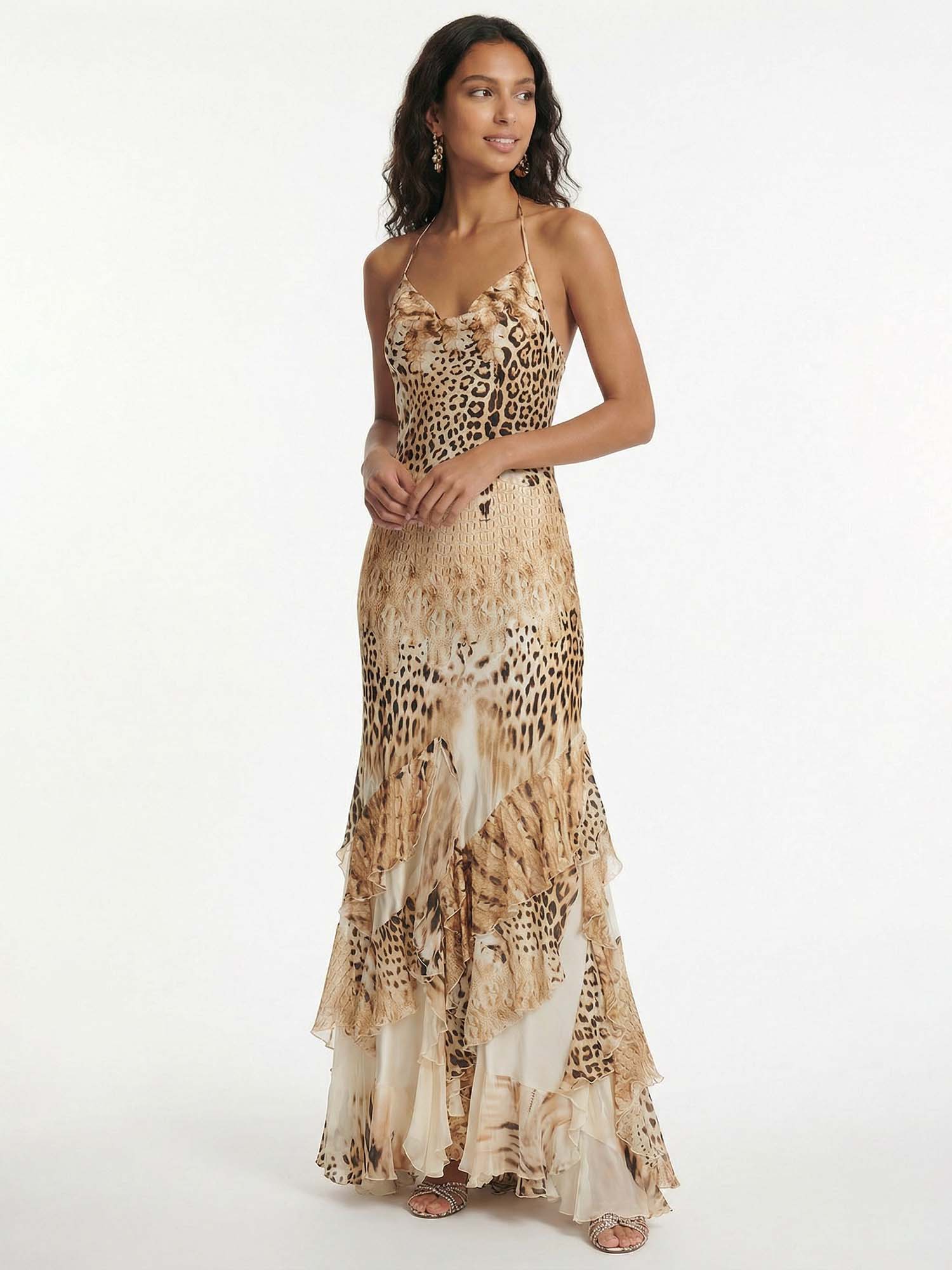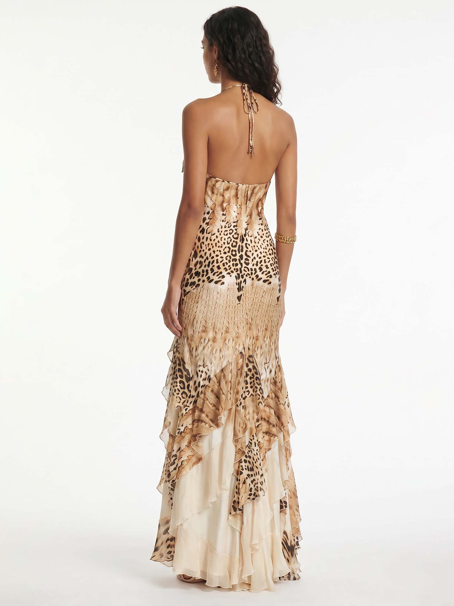Let bold patterns unfold in cascading ruffles and asymmetric flow, where the halter form meets dramatic grace with balanced intensity.