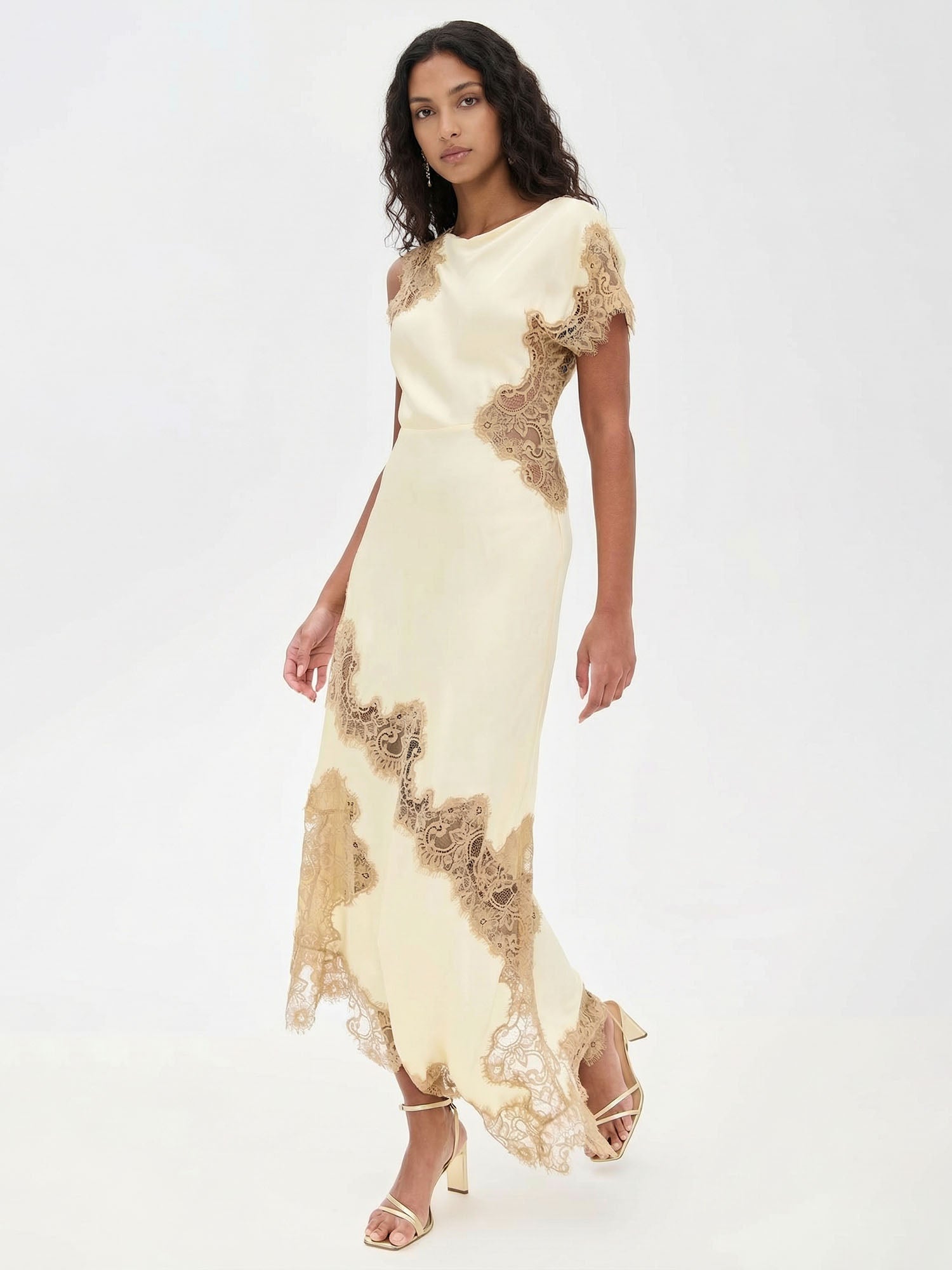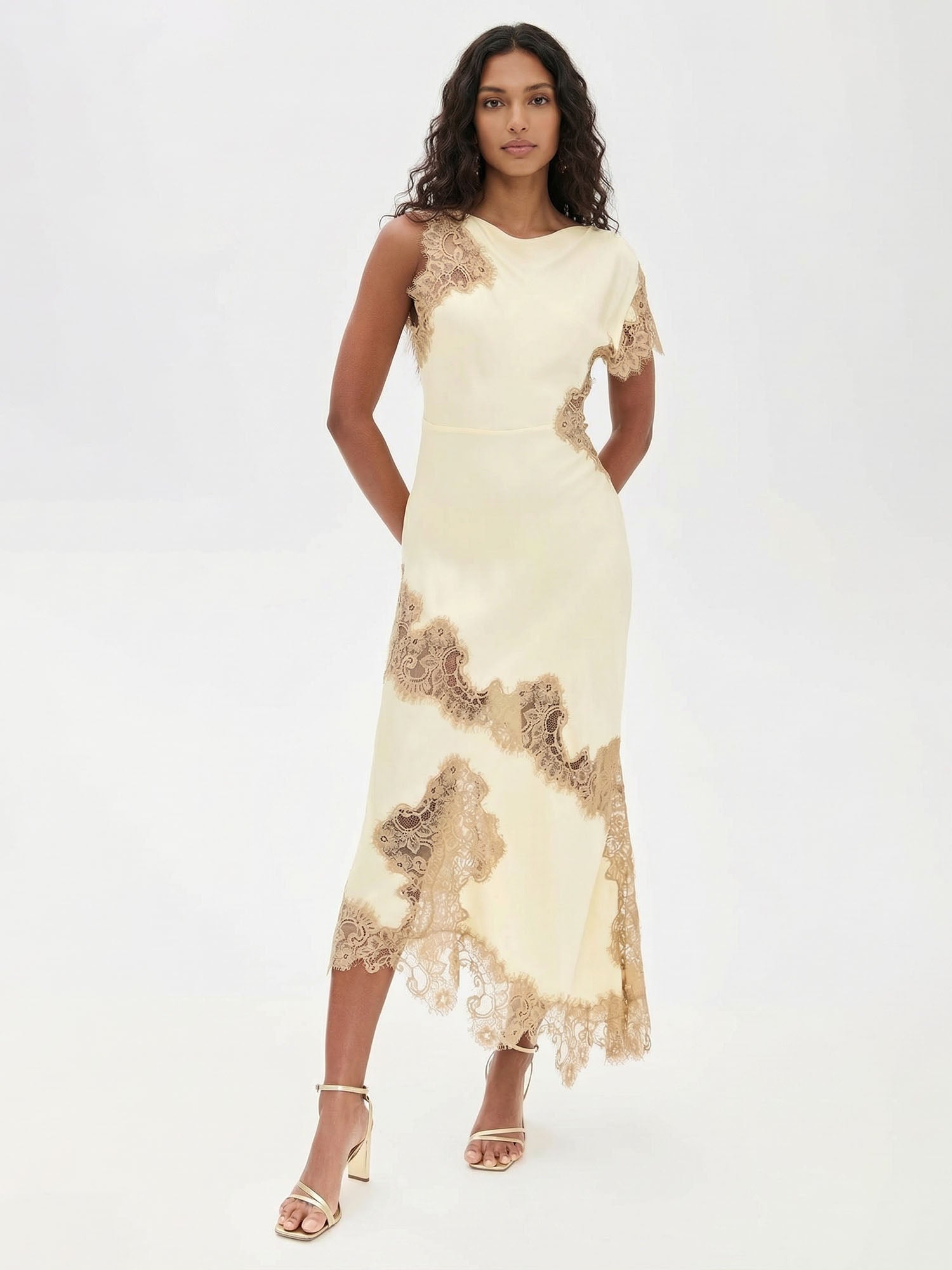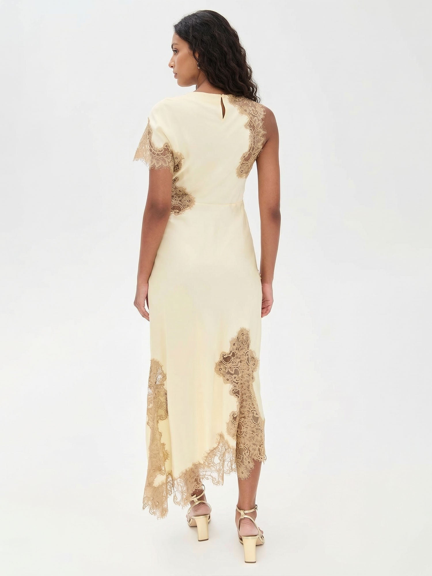Let moonlight trace delicate paths across Dantўўase's Lace Whisper Midi Dress, Sleeveless silhouette flows into an asymmetrical hem that sways with every step, a quiet dance of elegance and edge. For evenings of subtle radiance or days kissed by golden light, it becomes a sonnet in minimalist women's wardrobe—ethereal, layered, and forever luminous.