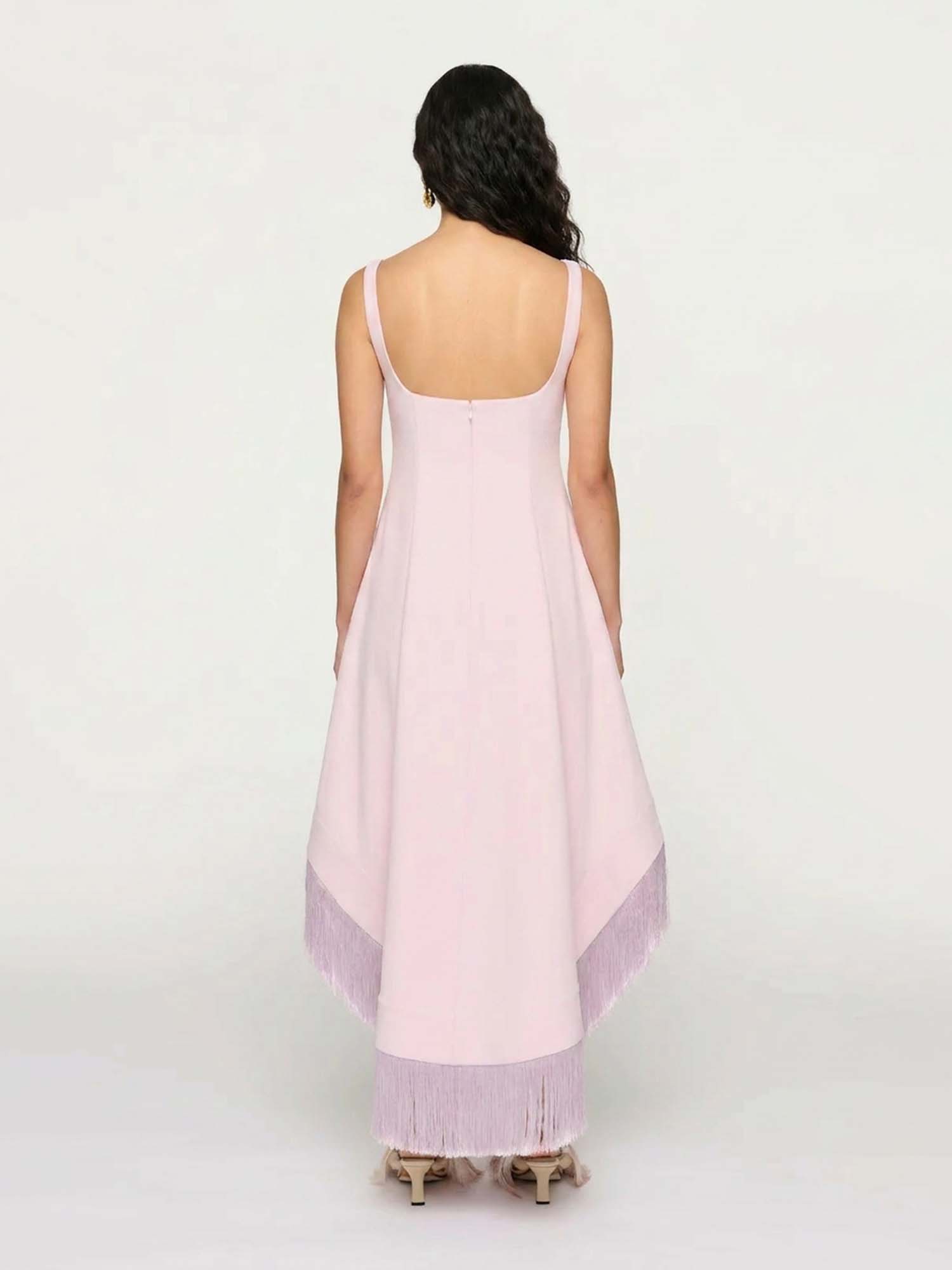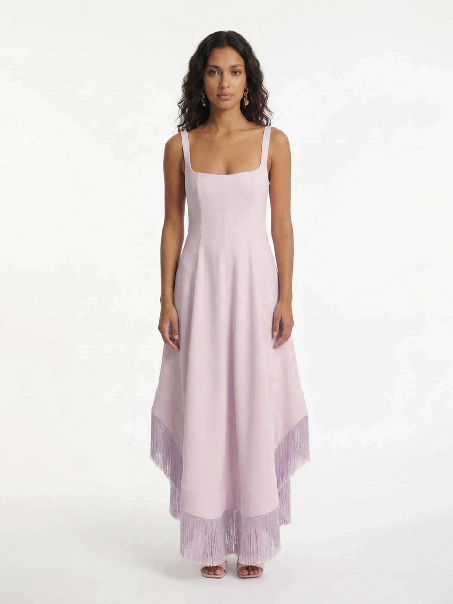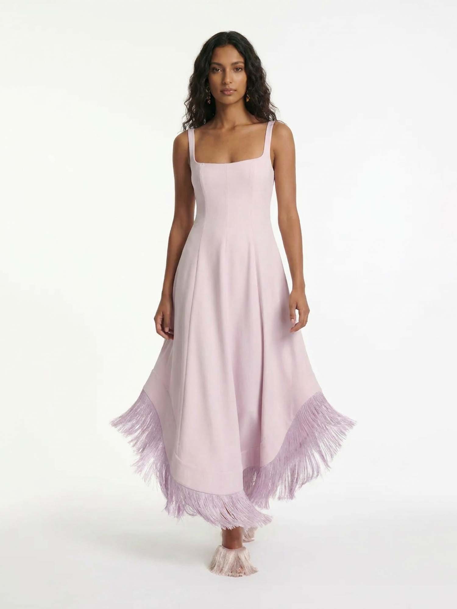 Let soft lilac tones drift where the flowing silhouette sways with delicate grace, inviting serene harmony and timeless femininity with every gentle step.