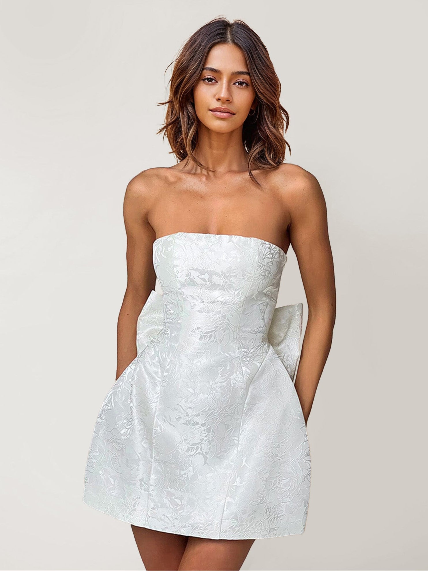 Elevate your style with this Luxe Jacquard Mini Dress, featuring an elegant bow detail at the back. This dress is perfect for special occasions, combining sophistication with a touch of playful charm.