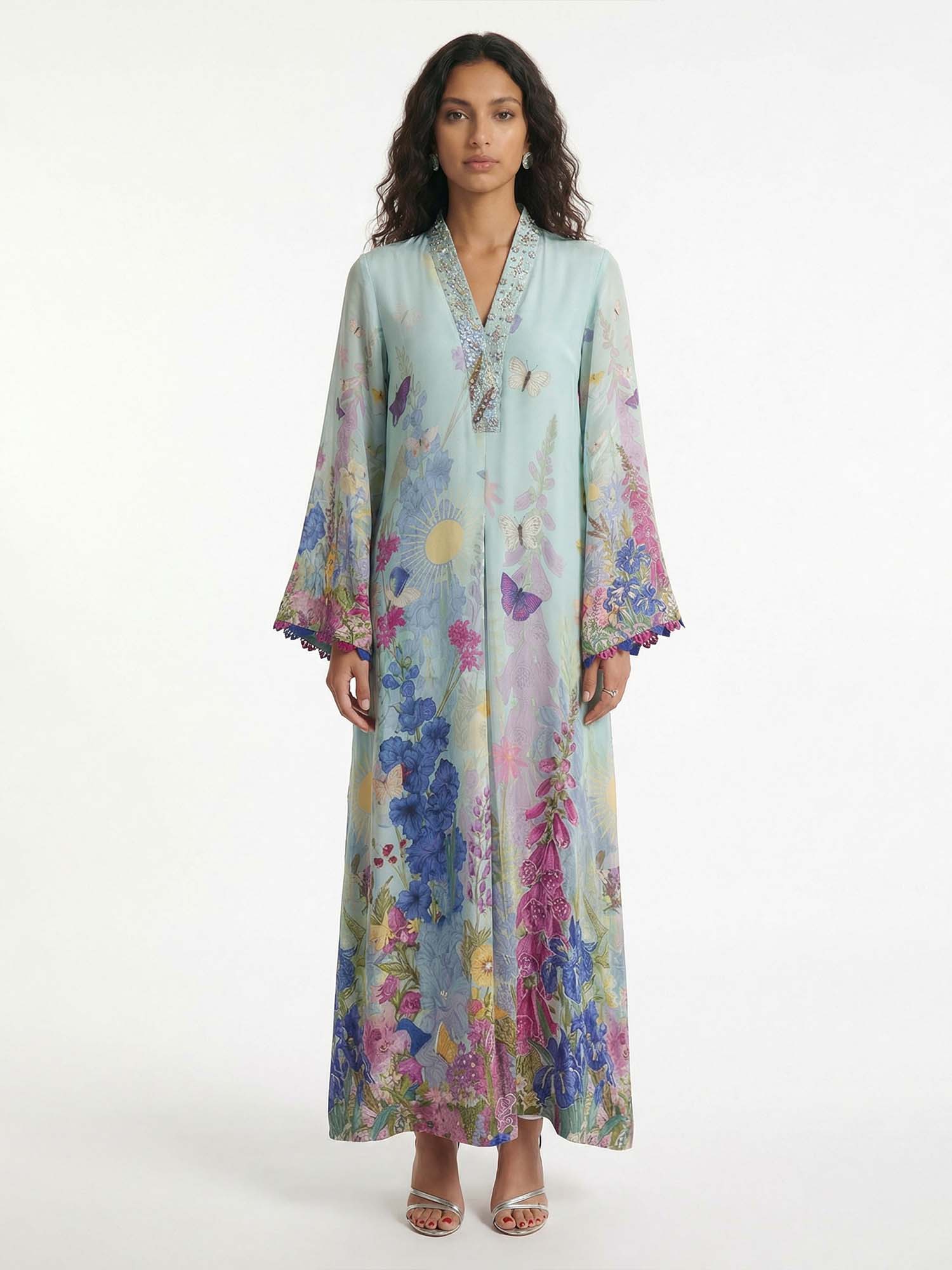Let ethereal blossoms float like a fleeting dream in Dantўўase's Meadow Mirage Maxi Dress, where wild poppies, irises, foxgloves, and delicate butterflies drift across the sheer fabric in painterly, layered abundance. The deep V neckline gathers softly into a relaxed fit, voluminous bishop sleeves cascade with romantic volume, while the flowing maxi hem sways with gentle asymmetry and subtle ruffles for effortless grace. For moonlit garden walks or golden-hour escapes, it becomes minimalist women's living reverie—romantic, luminous, eternally enchanting.