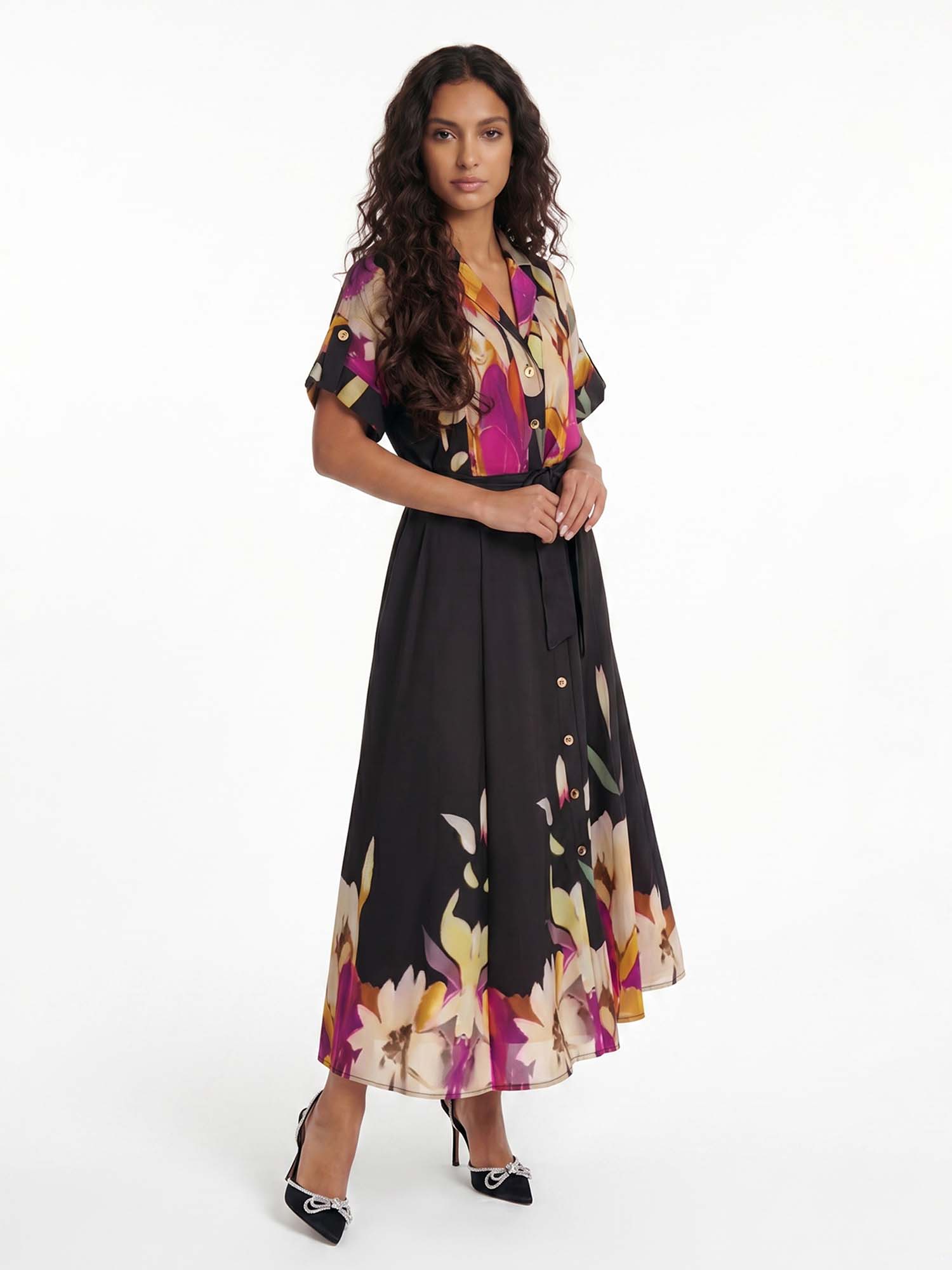 Let rich blooms awaken where the silhouette moves with quiet intensity, inviting serene harmony and timeless femininity with every gentle step.