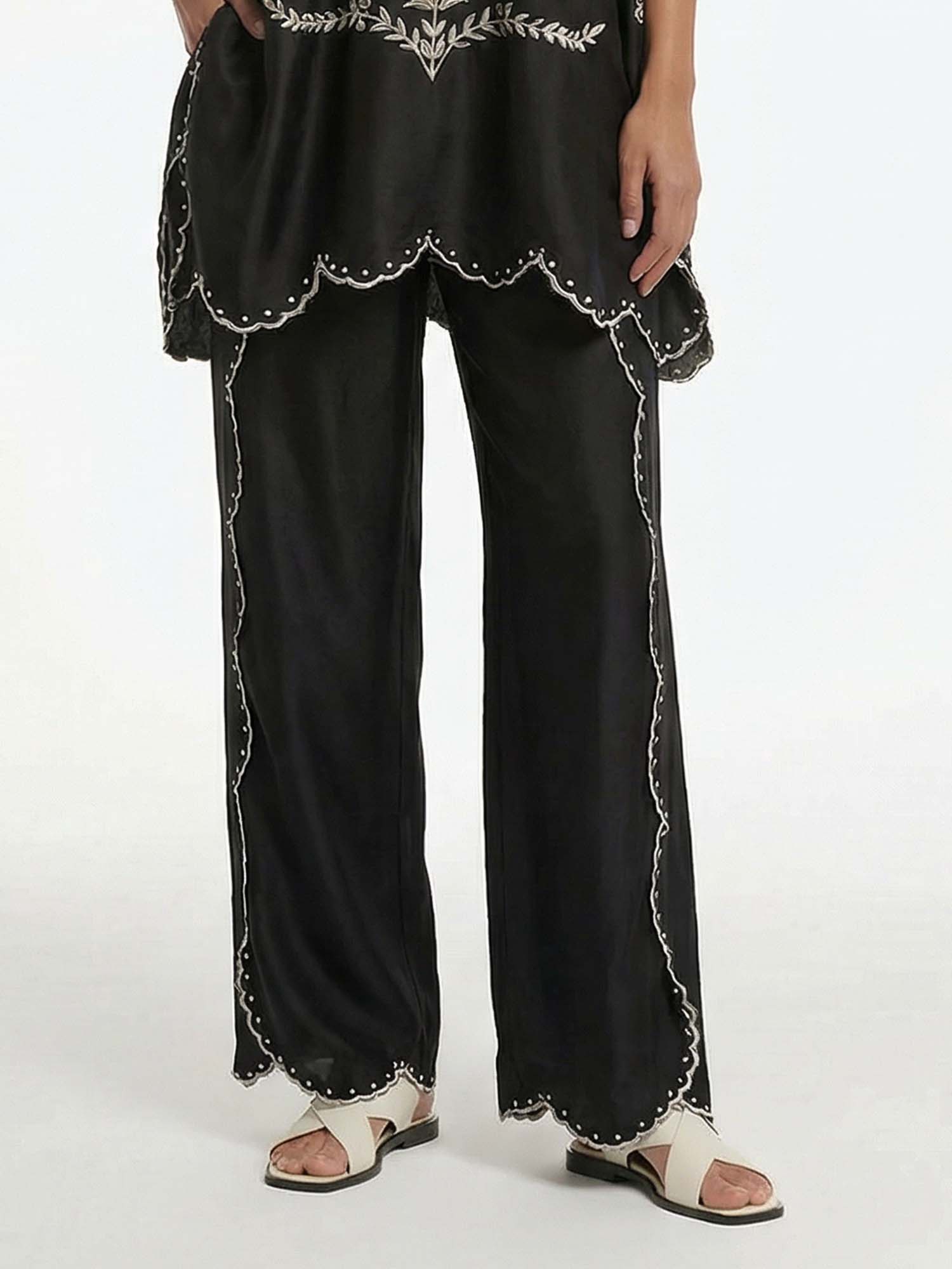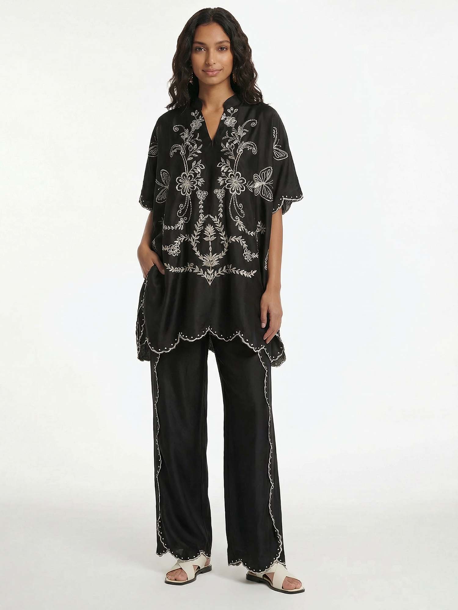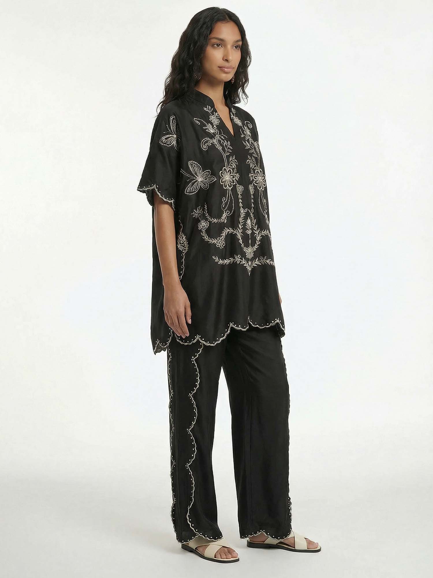 Flow with shadowed poetry in Dantўўase's Midnight Butterfly Pants, where wide legs descend in matching silver embroidery along the sides and hems, echoing the shirt's luminous artistry in harmonious detail. High-waisted comfort meets fluid drape, carrying quiet luxury from dusk to dawn. Beyond lingerie, Dantўўase crafts enduring women's presence—voluminous, refined, and indelibly poised.
