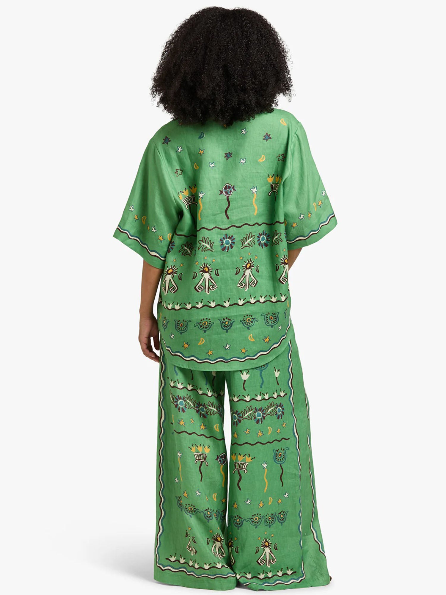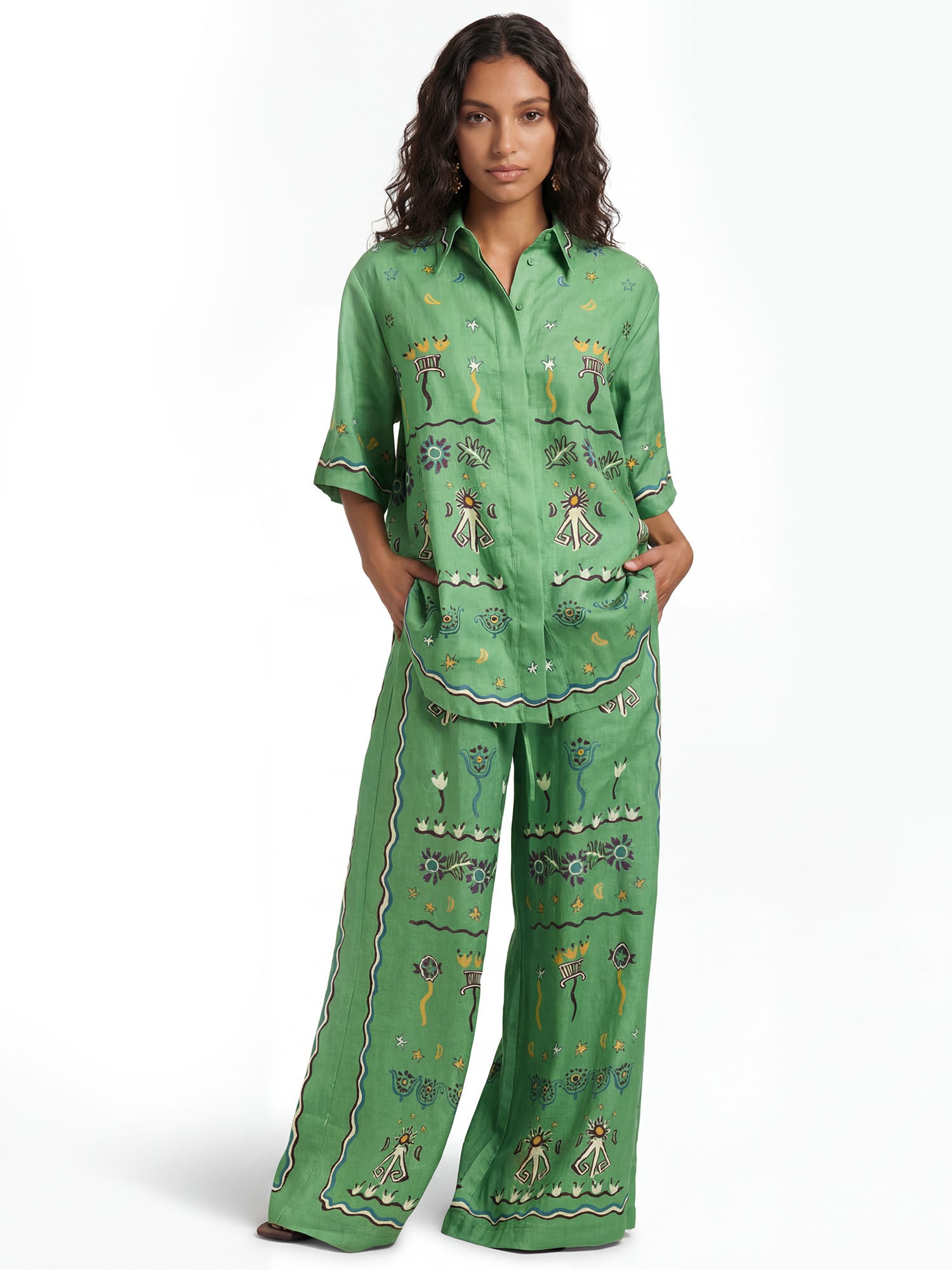 Move with dreamy rhythm in Dantўўase's Mystic Garden Wide-Leg Pants, high-waisted and bordered with flowing talismanic borders and starry blooms. They cascade from morning rituals to evening glow. Beyond lingerie.