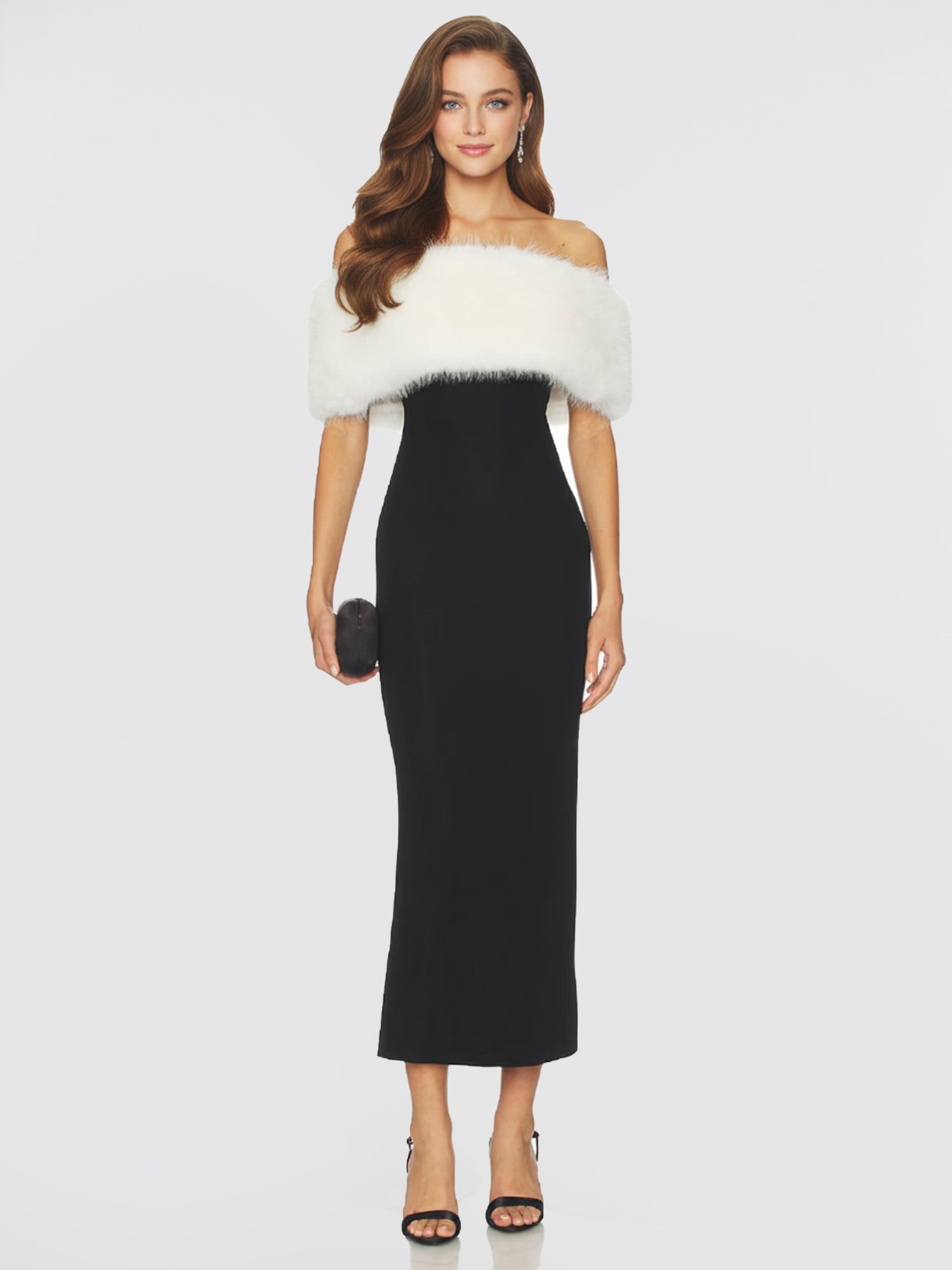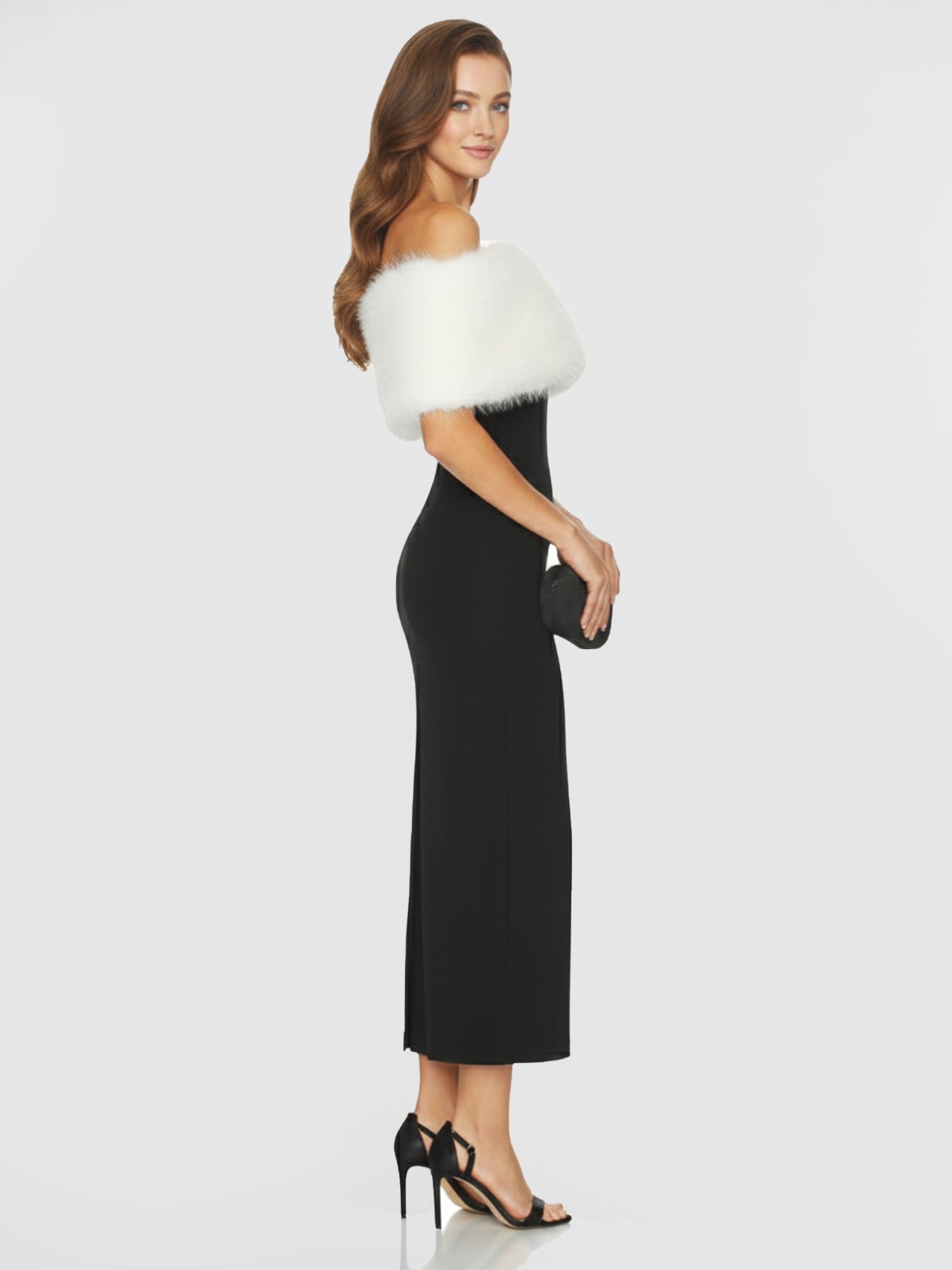 In the hush of bare shoulders crowned with ethereal veils, this midi dress descends in shadowed poise, where a soft horizon frames the form's quiet command. Its fitted cascade summons twilight enigmas, a dramatic silhouette for nocturnal graces or veiled revelations, threading lightness into the hem's silent defiance.