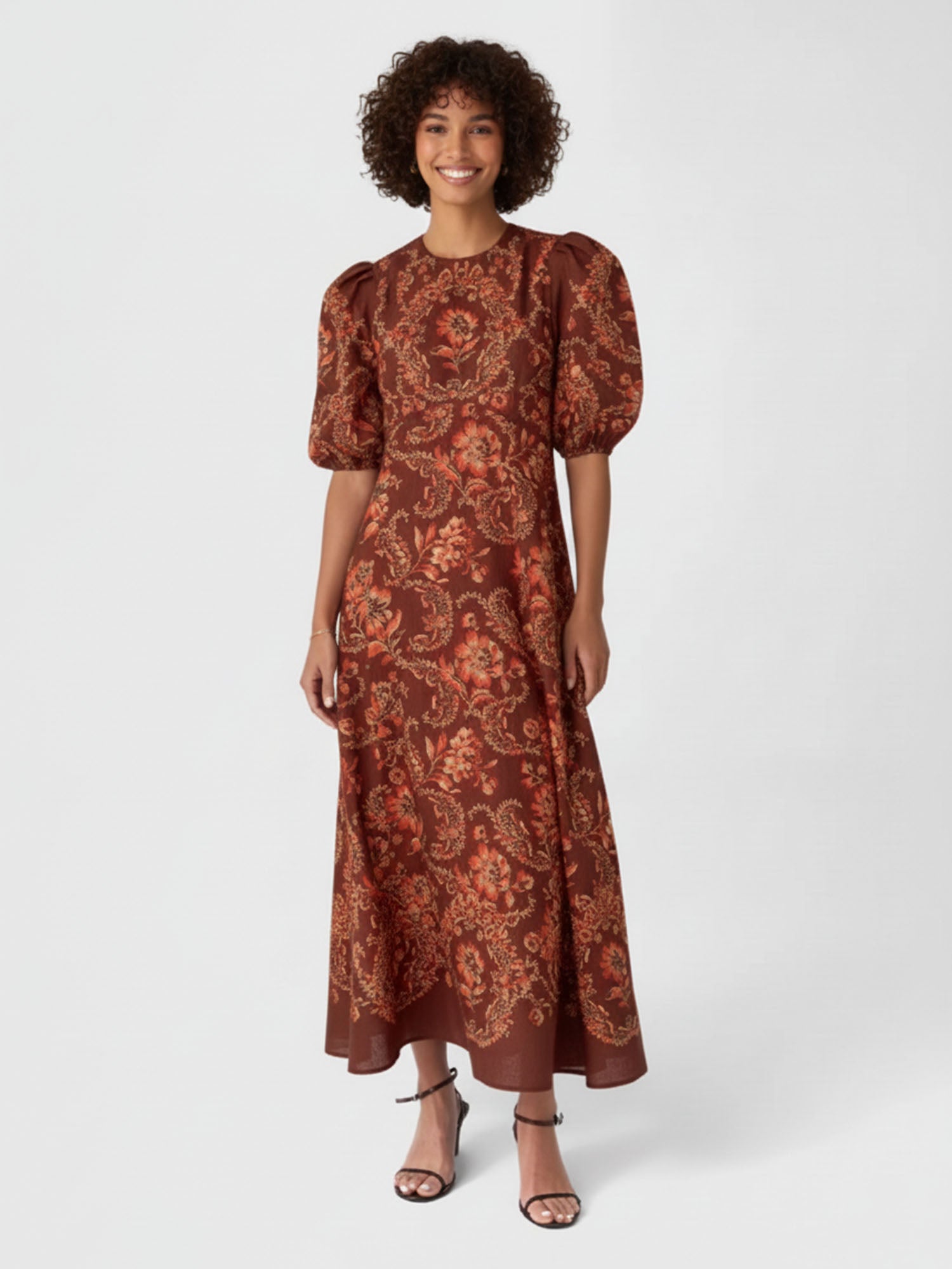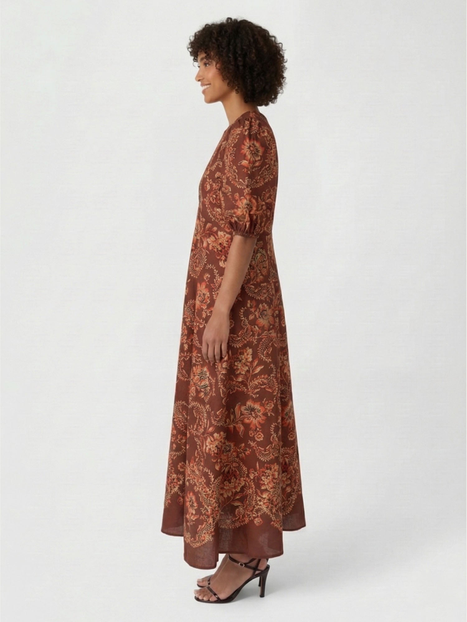 In the swell of veiled ardor, this maxi dress blooms with puffed sleeves that cradle the form's quiet flame, where intricate floral motifs entwine like hidden embers across flowing layers. Its round neck summons effortless poise, a graceful silhouette for twilight gatherings or whispered passions, threading intensity into the hem's endless sway.