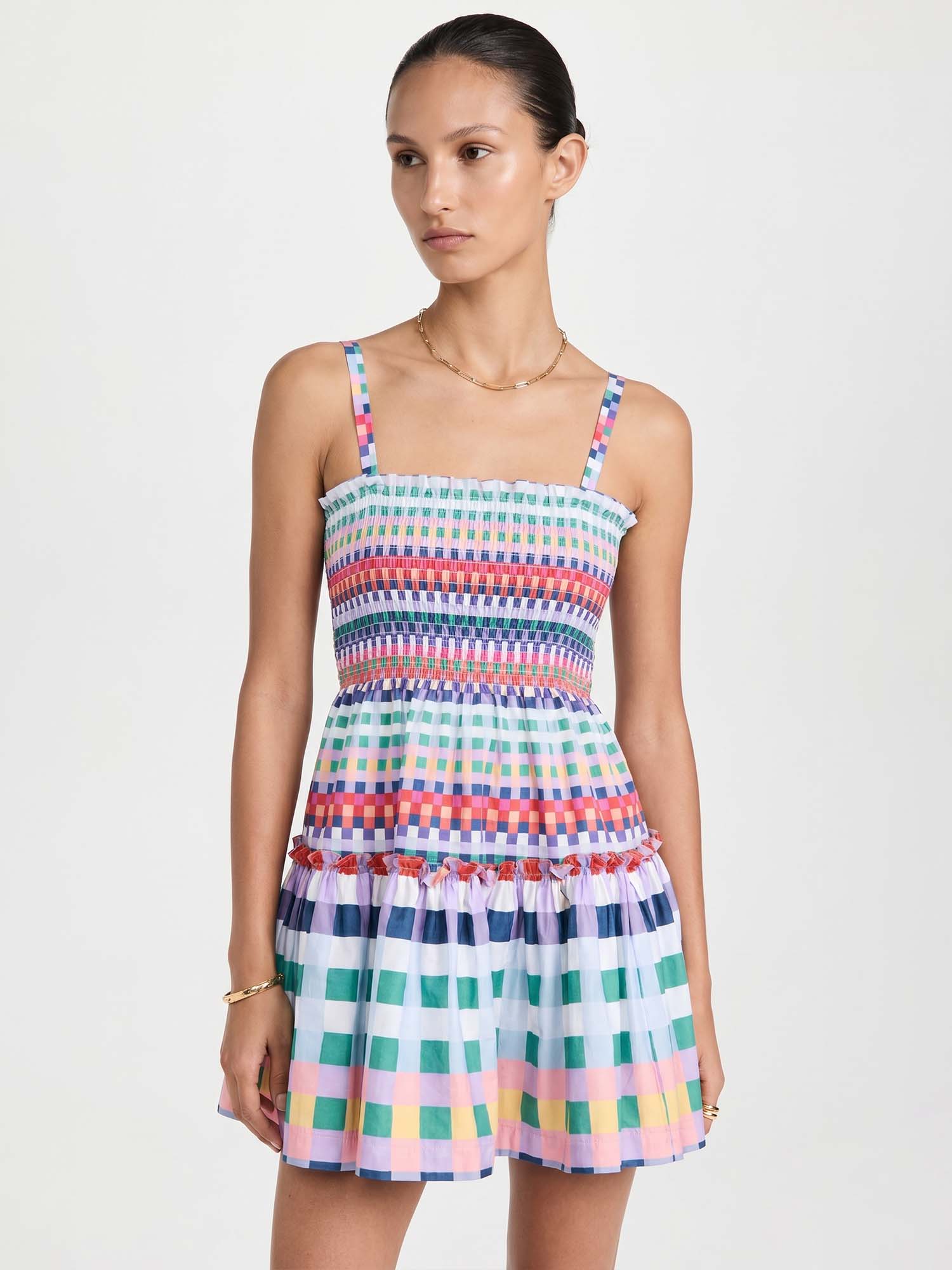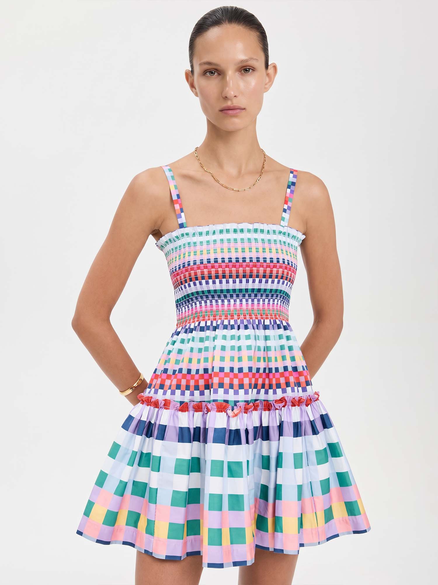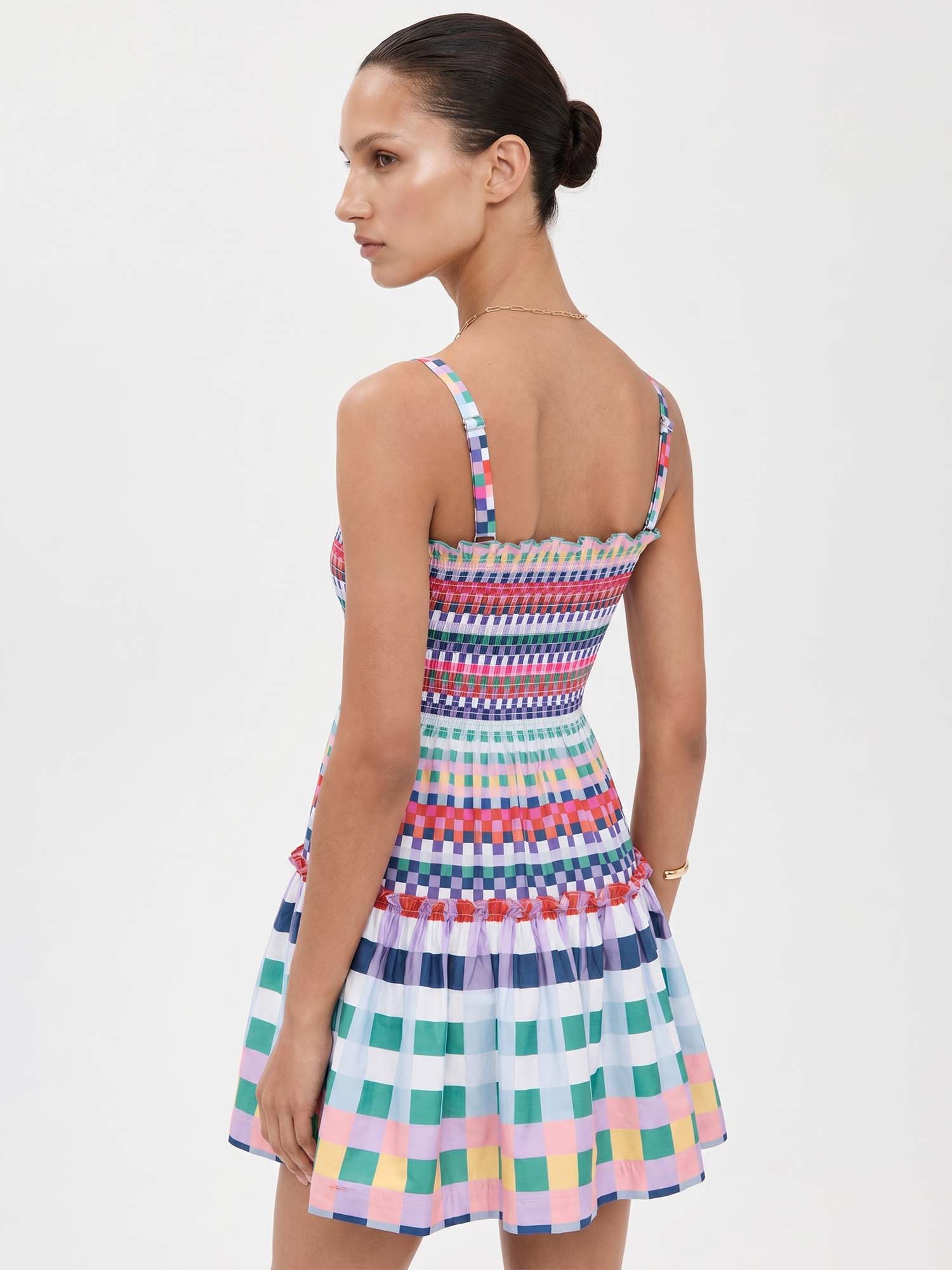 Let vibrant colors intertwine where playful checks meet soft gathers, creating joyful lightness and quiet harmony with every gentle step.