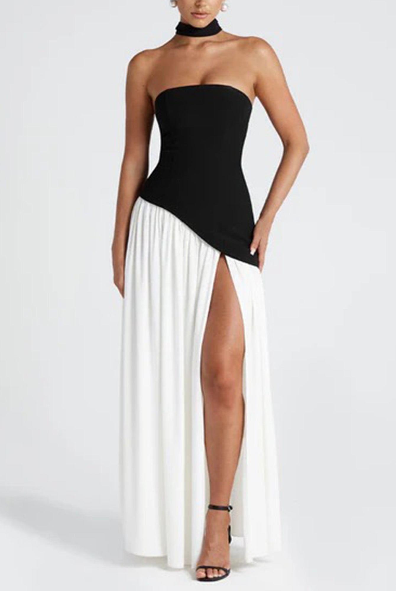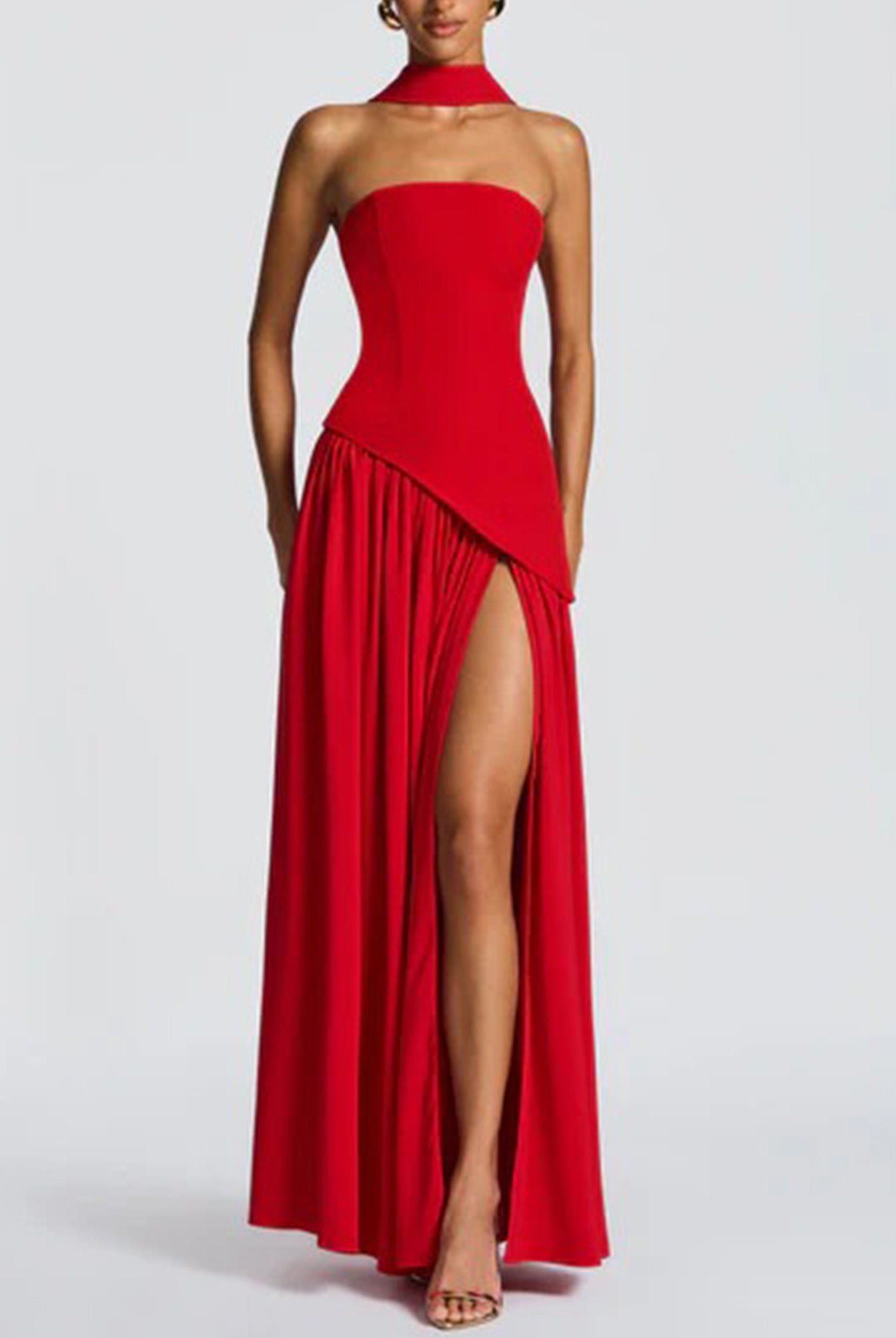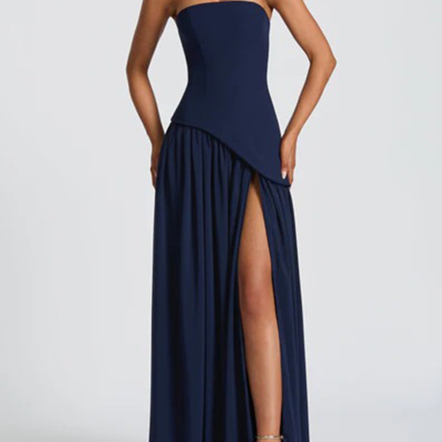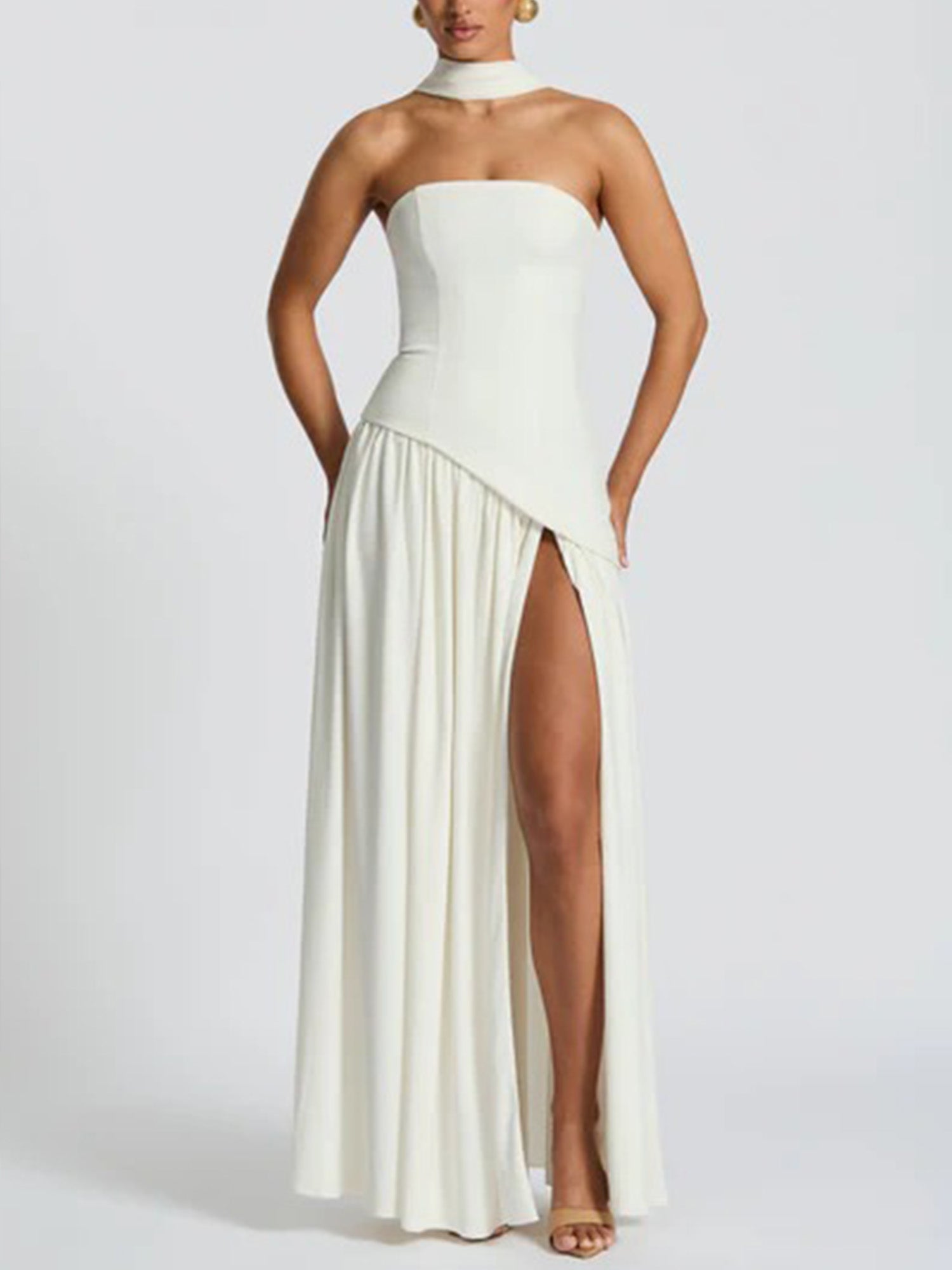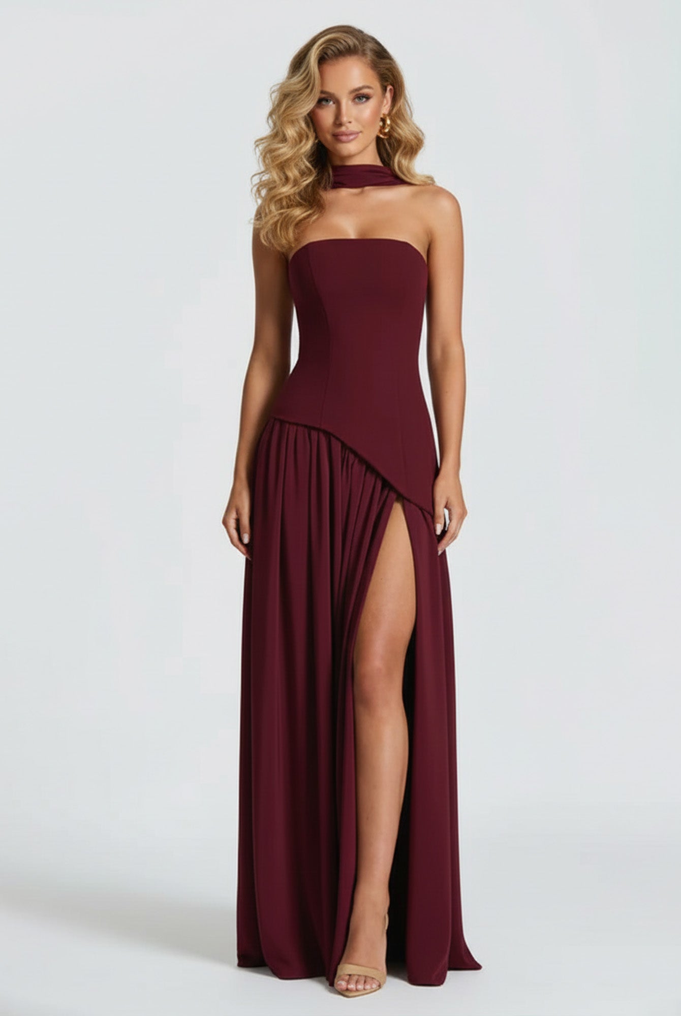 In the hush of parted horizons, this maxi dress veils the form with a choker's quiet decree, where one bold slit summons unspoken freedoms amid cascading folds. Its tube silhouette cradles poised mystery, a dramatic veil for nocturnal rites or shadowed graces, threading enigma into the hem's defiant whisper.
