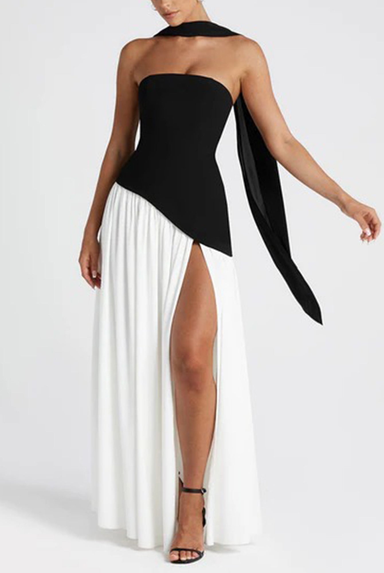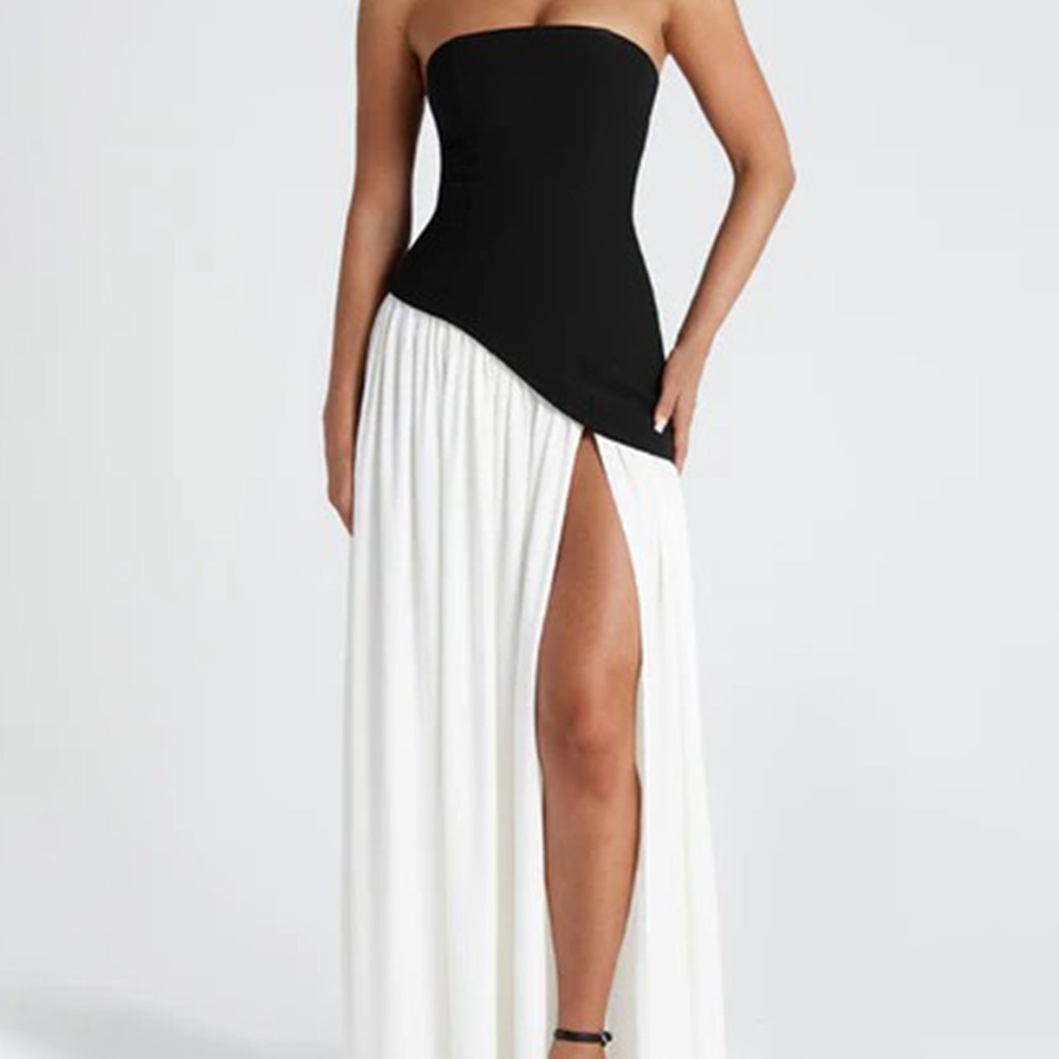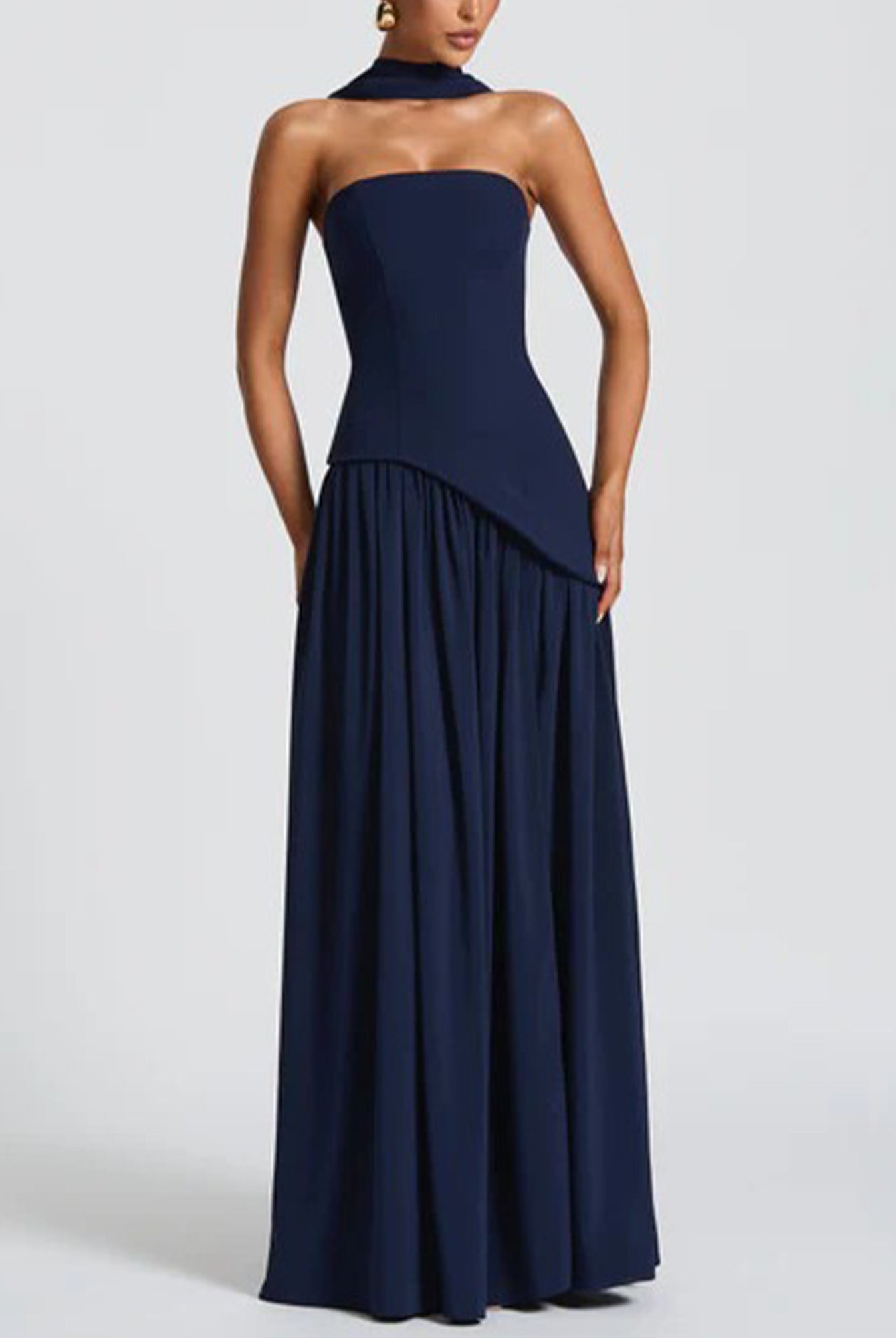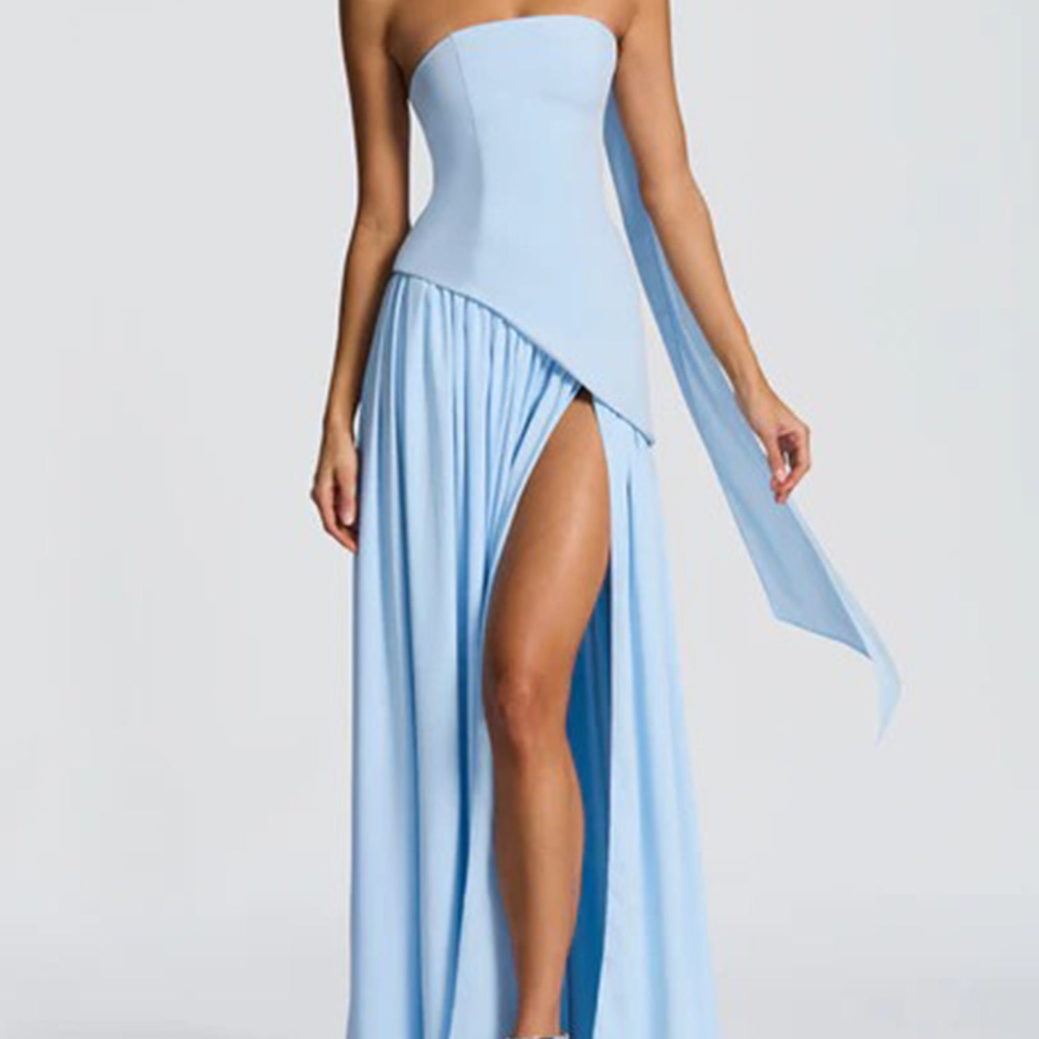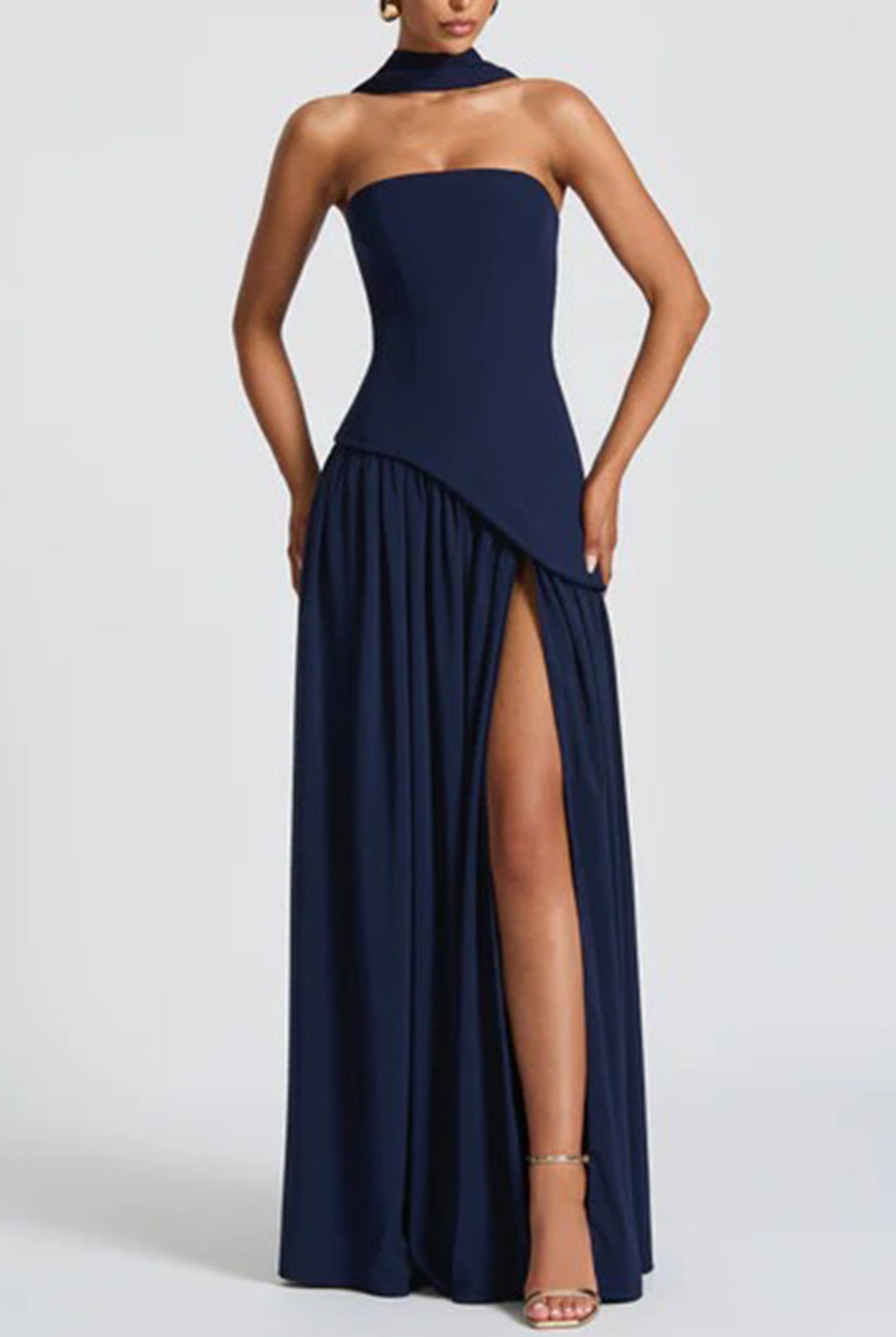 In the hush of parted horizons, this maxi dress veils the form with a choker's quiet decree, where one bold slit summons unspoken freedoms amid cascading folds. Its tube silhouette cradles poised mystery, a dramatic veil for nocturnal rites or shadowed graces, threading enigma into the hem's defiant whisper.
