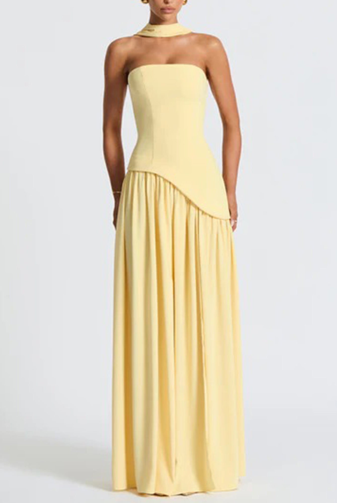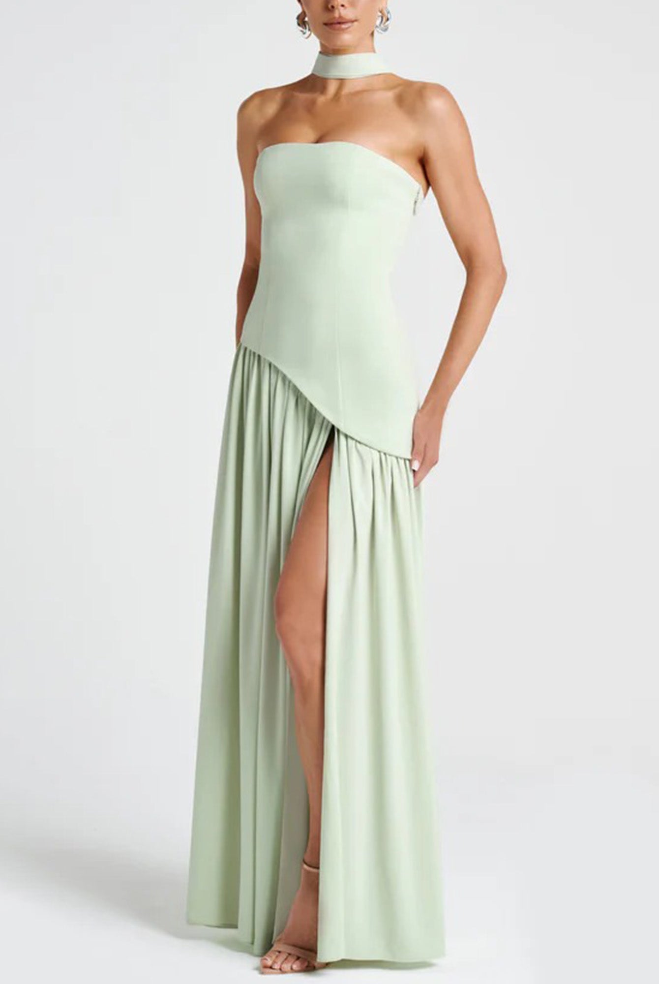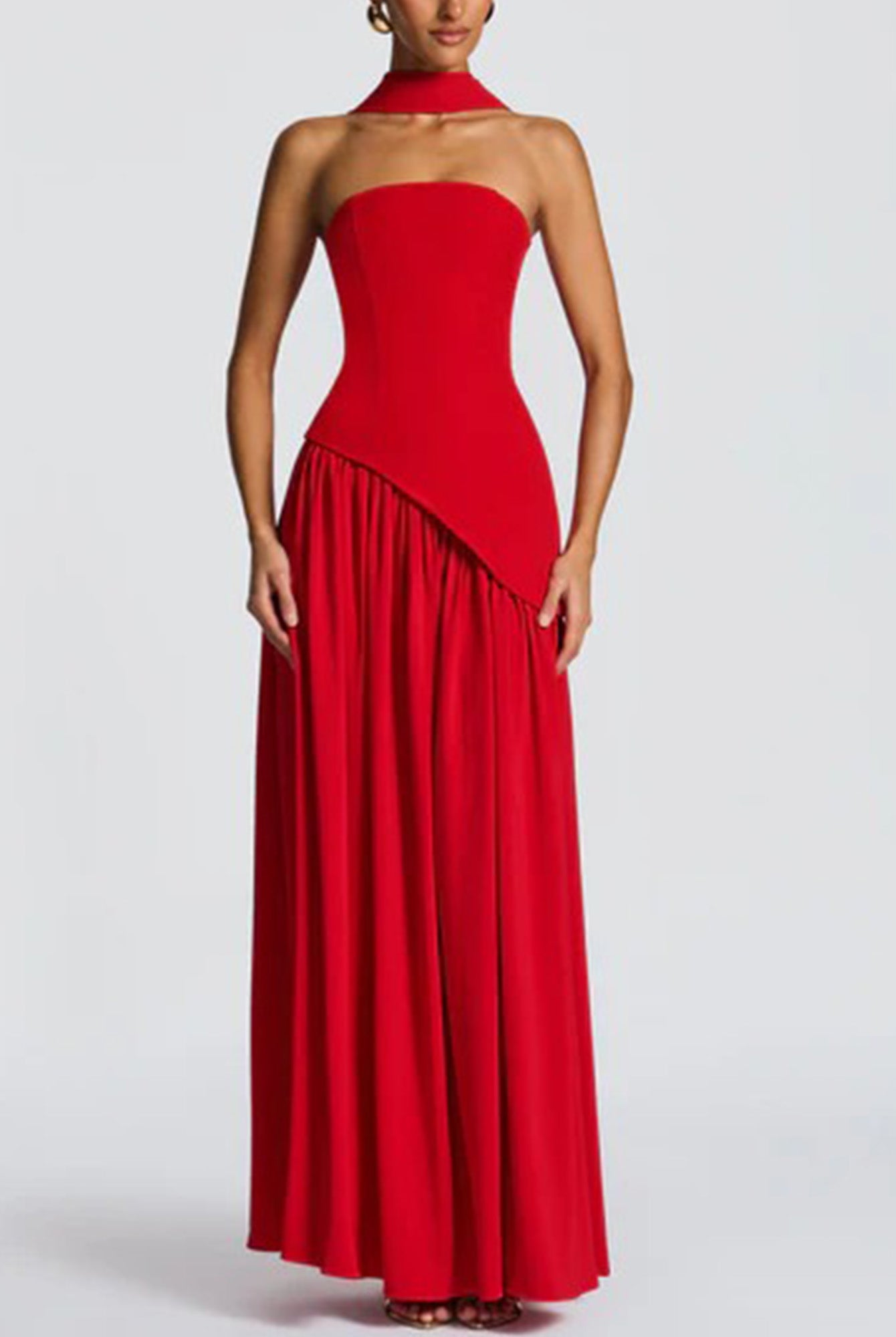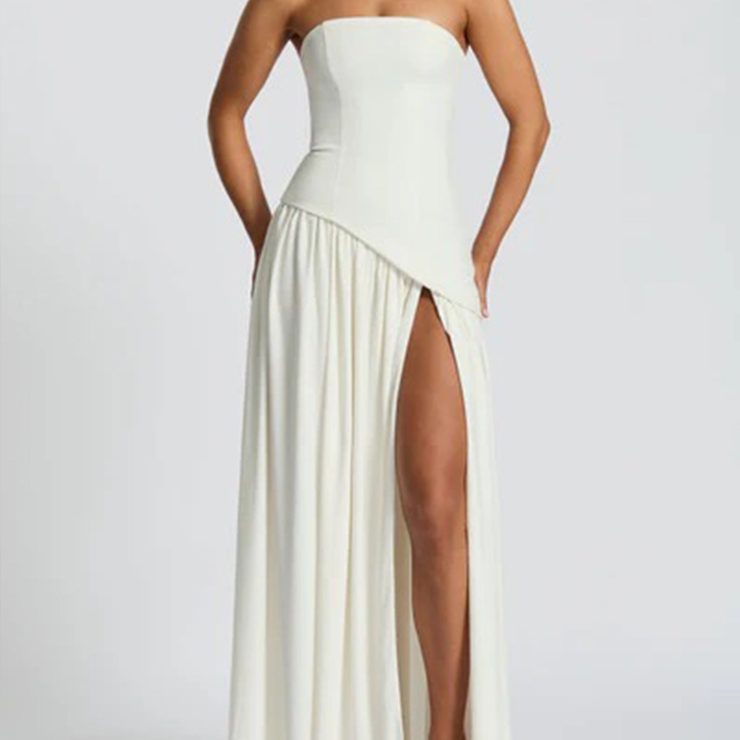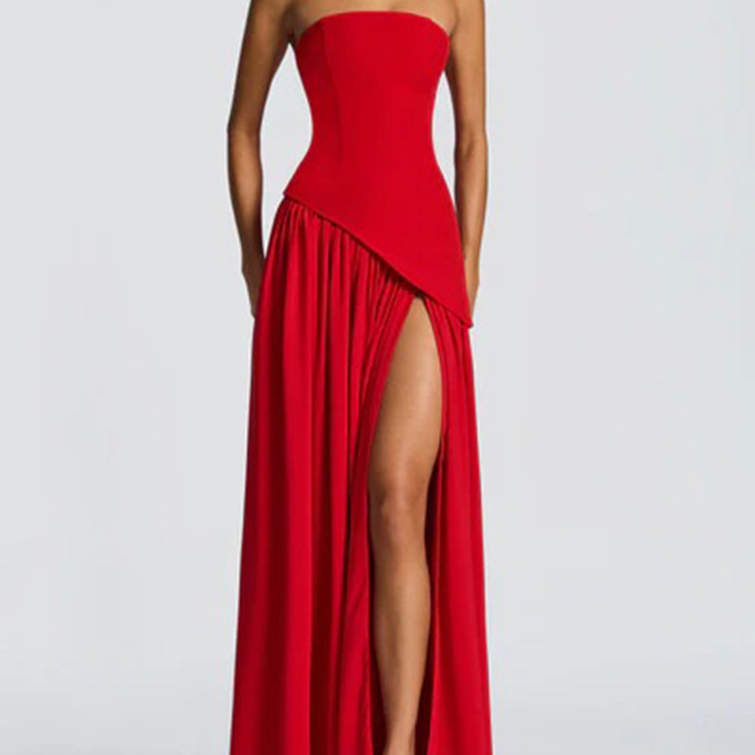 In the hush of parted horizons, this maxi dress veils the form with a choker's quiet decree, where one bold slit summons unspoken freedoms amid cascading folds. Its tube silhouette cradles poised mystery, a dramatic veil for nocturnal rites or shadowed graces, threading enigma into the hem's defiant whisper.