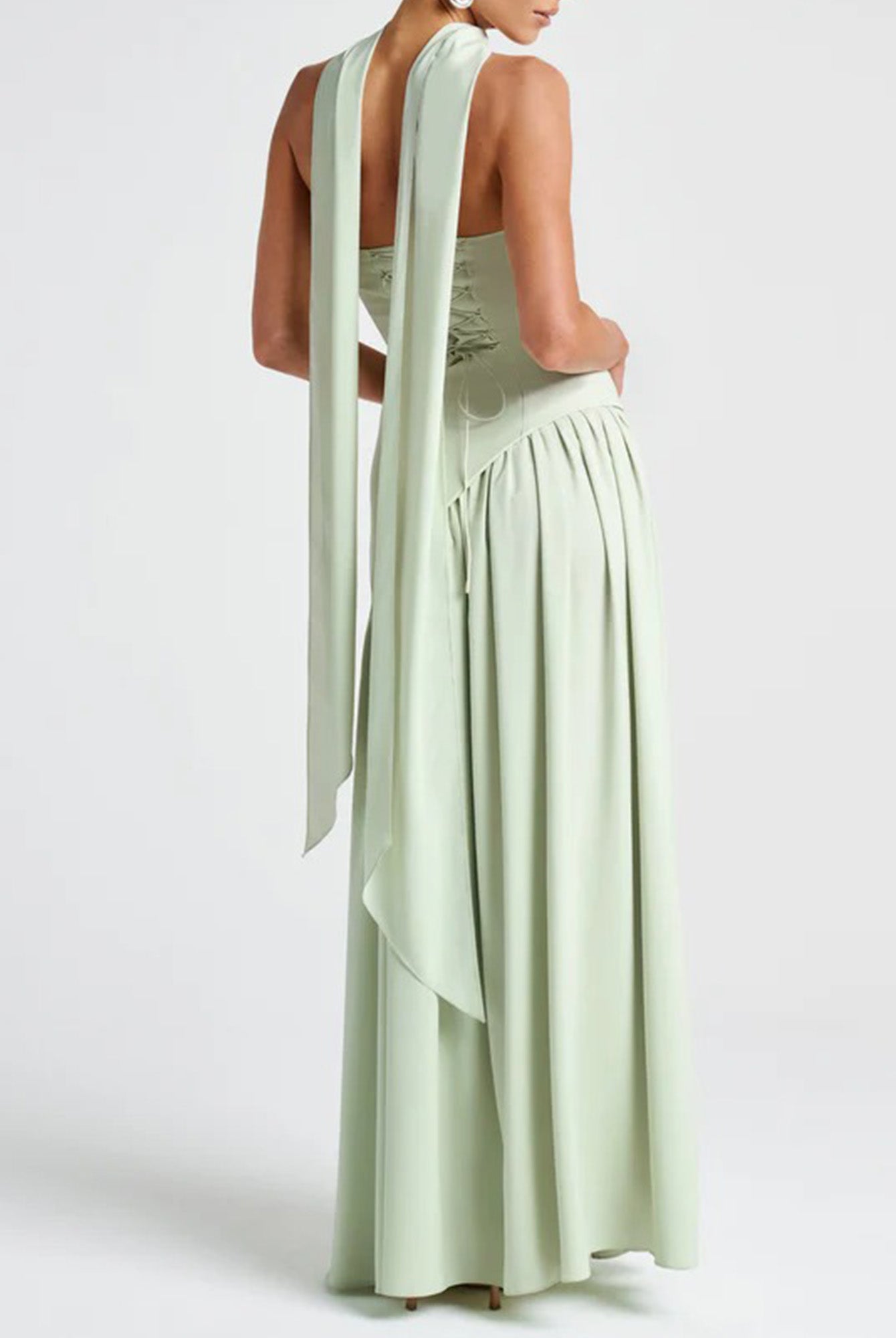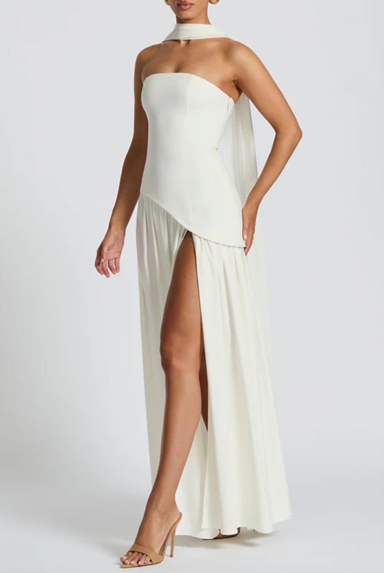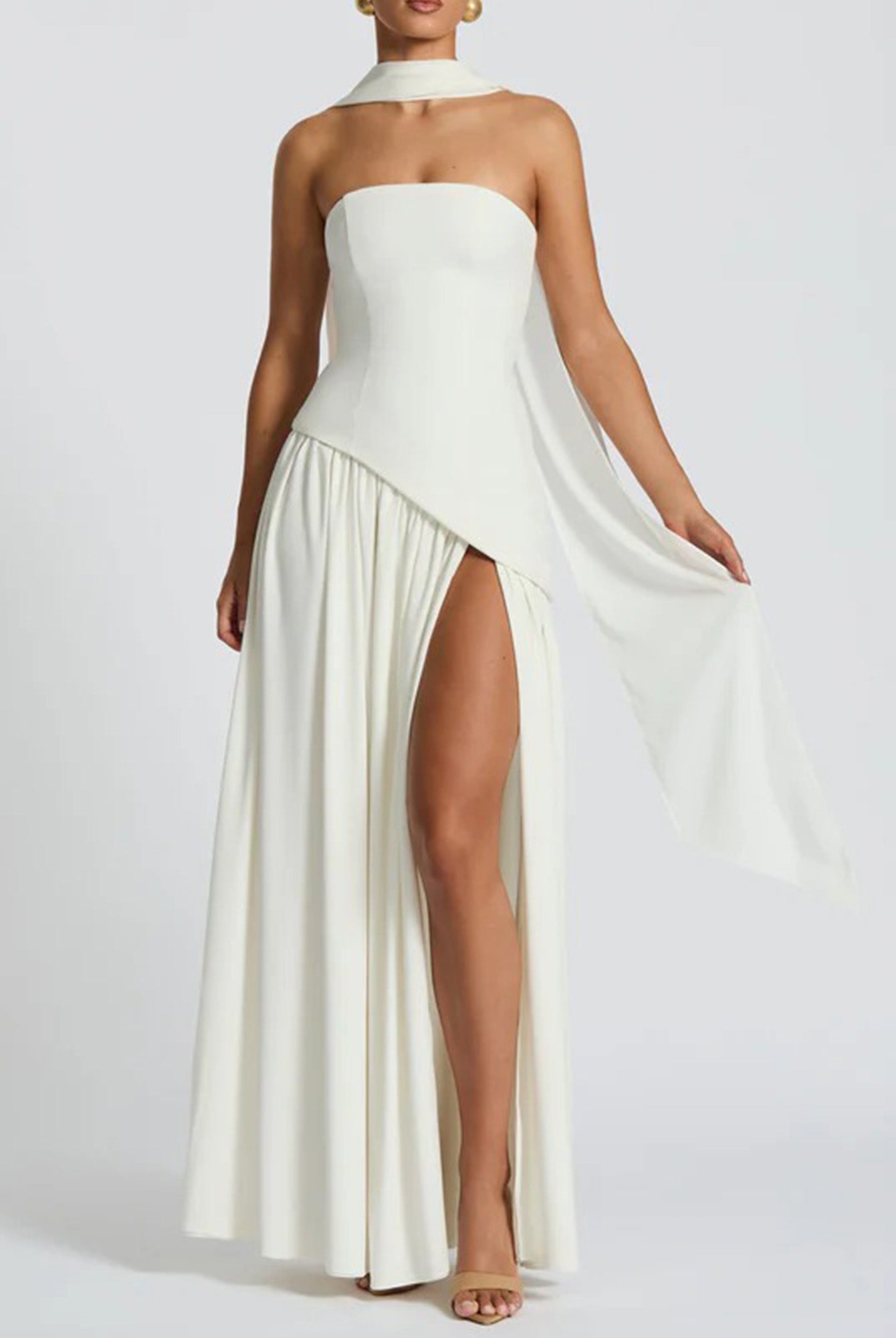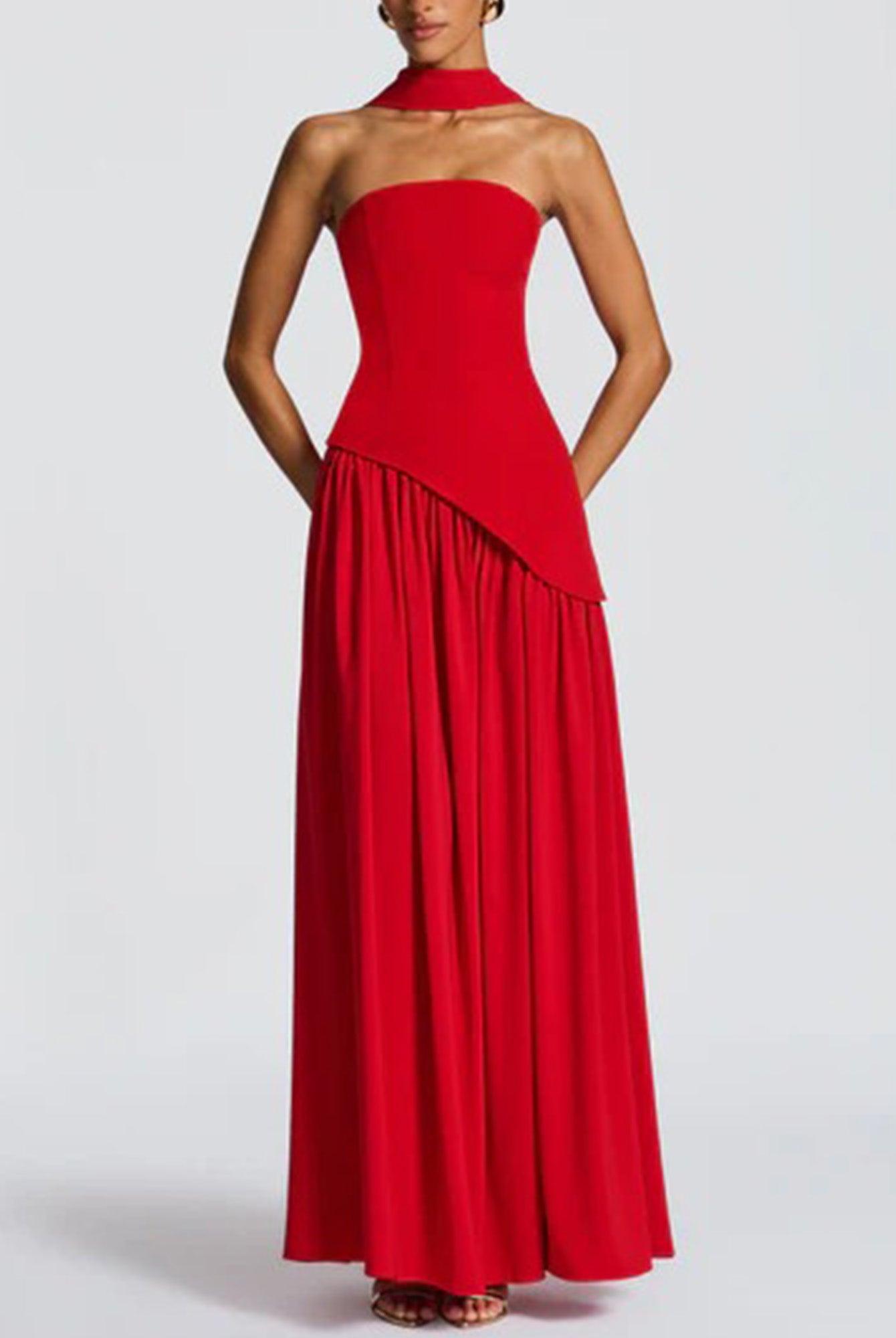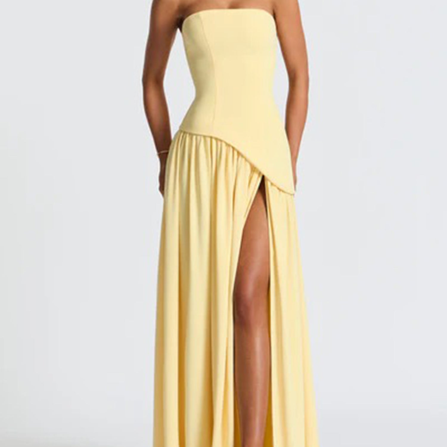 In the hush of parted horizons, this maxi dress veils the form with a choker's quiet decree, where one bold slit summons unspoken freedoms amid cascading folds. Its tube silhouette cradles poised mystery, a dramatic veil for nocturnal rites or shadowed graces, threading enigma into the hem's defiant whisper.