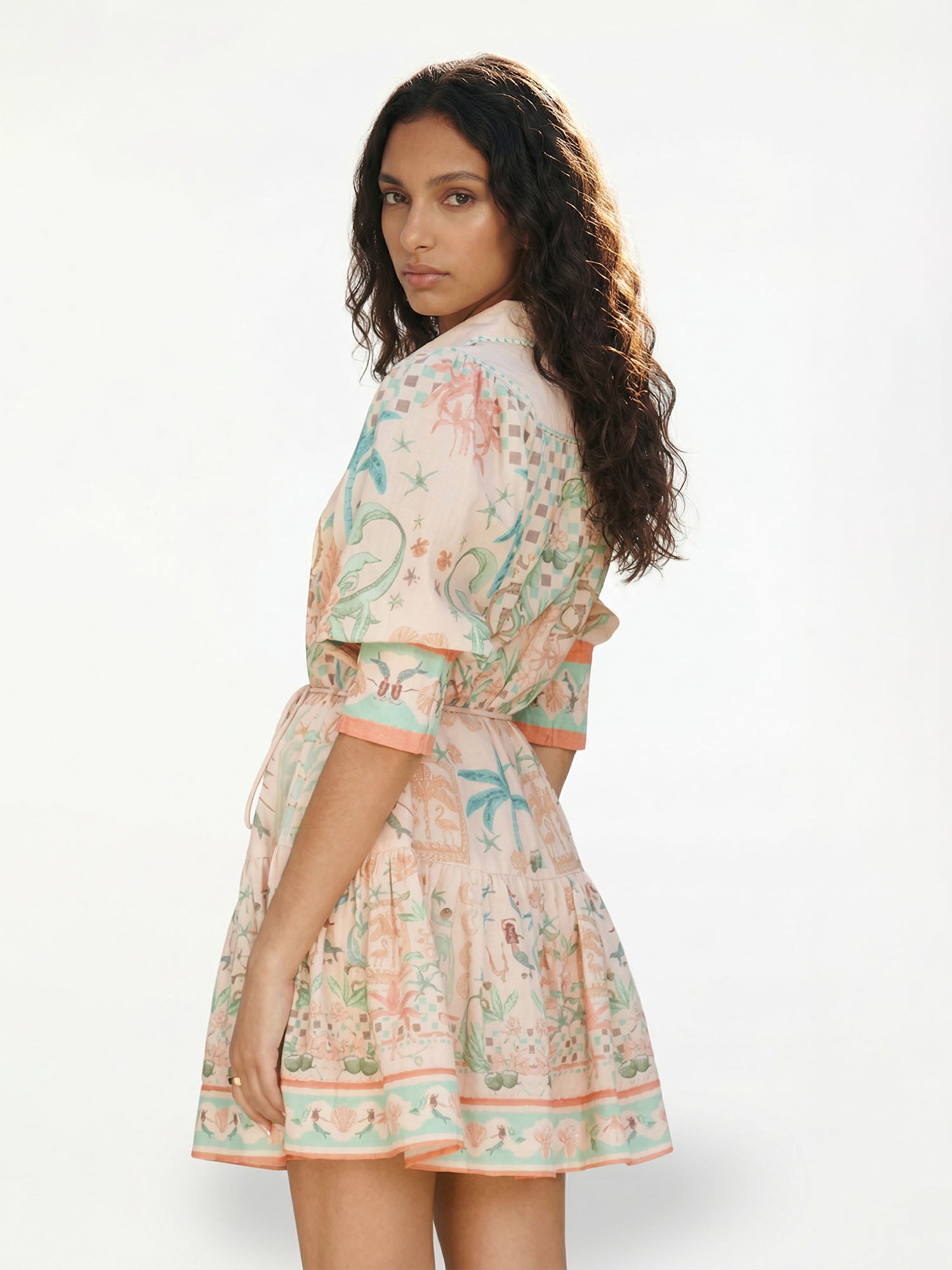 Let sacred motifs bloom like hidden sanctuaries in Dantўўase's Temple Garden Mini Dress, where ornate elephants, blooming lotuses, and intricate paisley borders orbit in joyful symmetry across the fabric. The collared neckline opens to delicate buttons, short puffed sleeves frame effortless ease, and the drawstring waist cinches into a tiered, flouncy hem that twirls above the knee with playful volume. For sun-drenched escapes or twilight gatherings, it becomes minimalist women's portable paradise—vibrant, whimsical, and eternally enchanting.