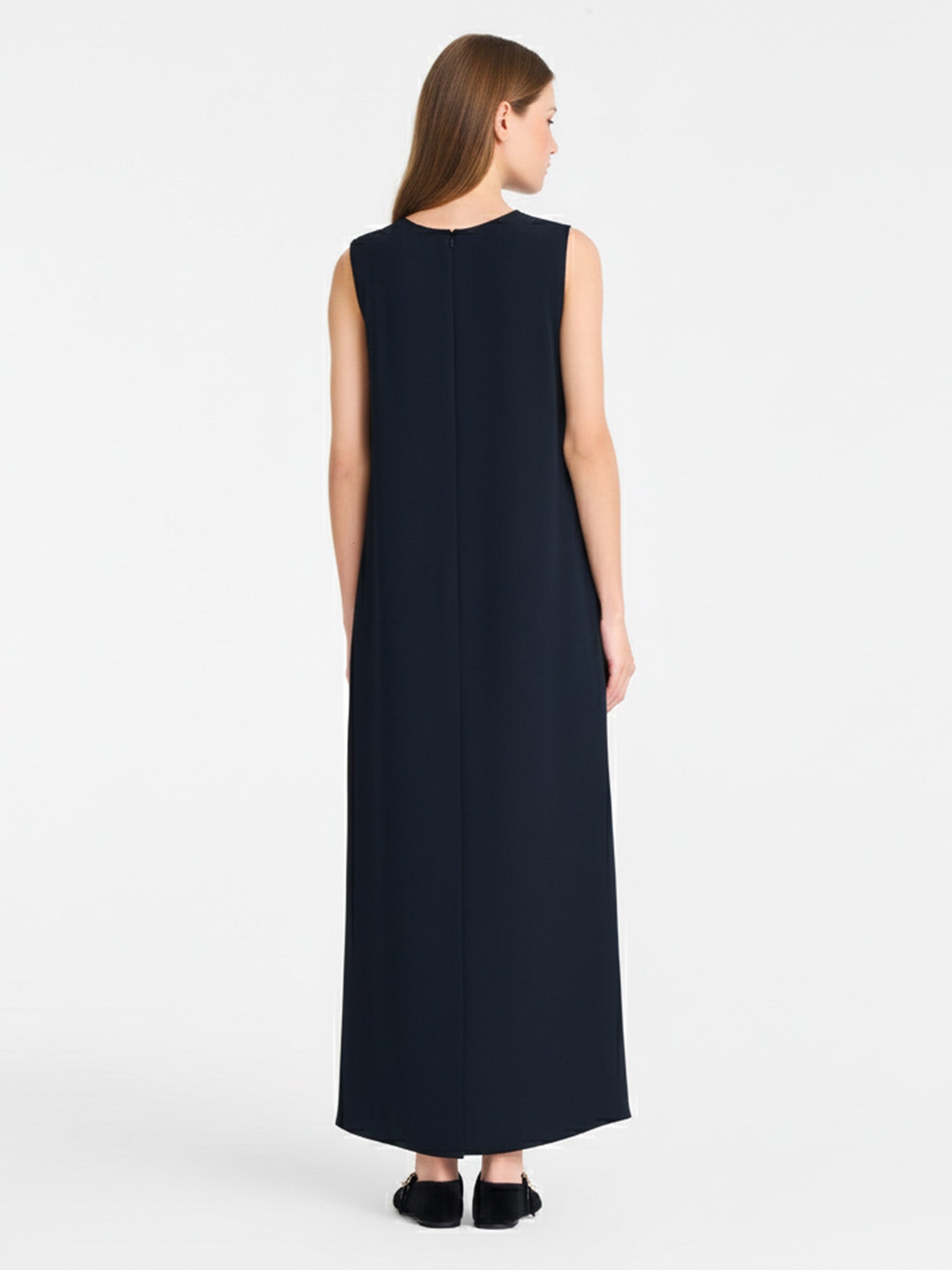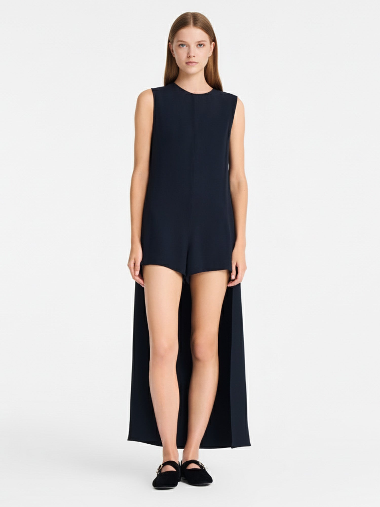 In the hush of divided horizons, this jumpsuit conceals a dramatic cascade at the back, where brief front meets elongated veil in quiet rebellion. Its sleeveless silhouette cradles unspoken duality, a playful form for twilight enigmas or shadowed freedoms, threading contrast into the train's silent descent.