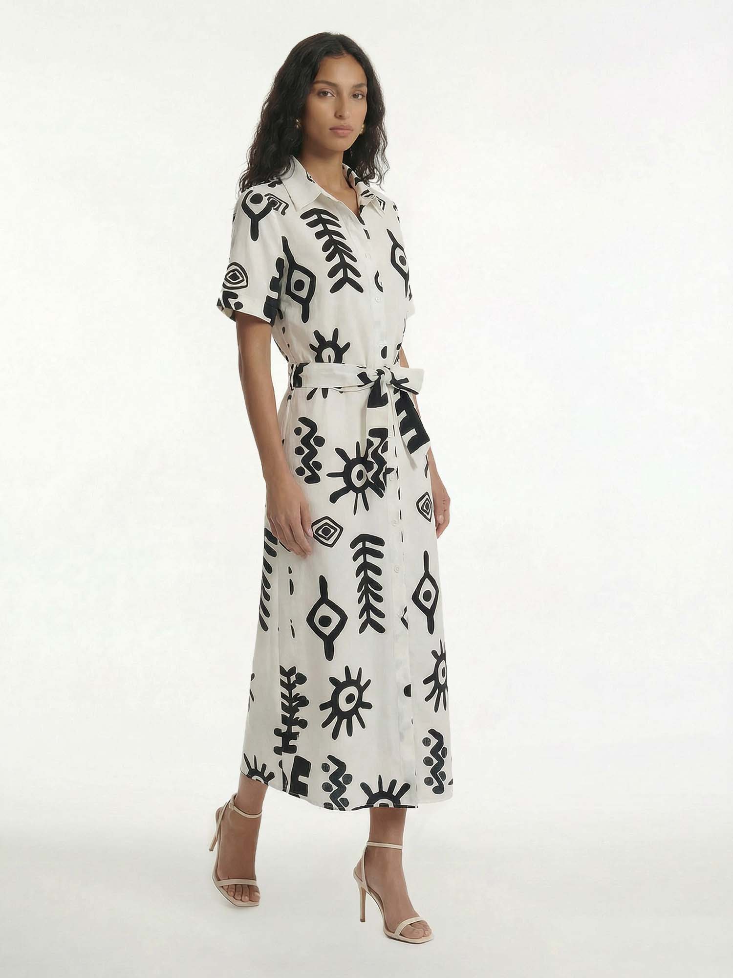 Let ancient symbols awaken in Dantўўase's Tribal Sun Midi Shirt Dress, where bold black glyphs—sun faces, watchful eyes, abstract bones, and rhythmic motifs—scatter across ivory in powerful, ceremonial symmetry. The collared neckline opens to a deep V that ties softly at the waist, short sleeves frame effortless ease, while the midi hem flows with graceful volume and subtle side slits for fluid movement. For sun-drenched rituals or moonlit gatherings, it becomes minimalist women's living talisman—primal, bold, and eternally commanding.