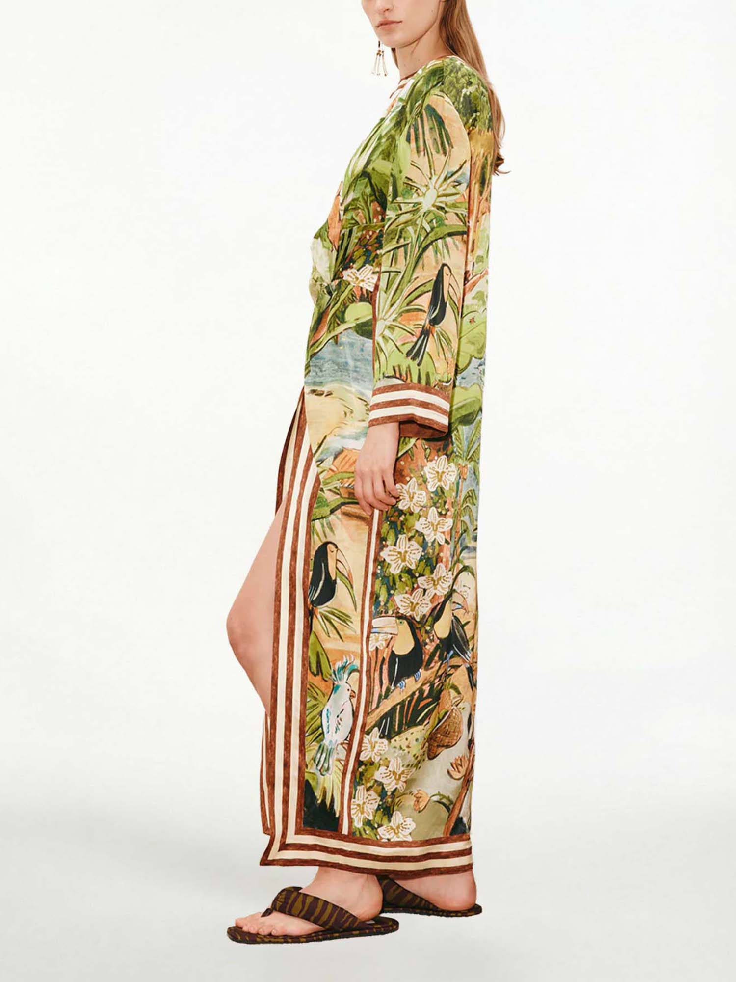 Let vivid illusions bloom in Dantўўase's Tropic Mirage Maxi Dress, where lush jungle foliage, exotic birds, and hidden lagoons dissolve into painterly waves of emerald, coral, and azure across the flowing silk. The open neckline drapes into a soft V, voluminous kimono sleeves cascade with weightless drama, while the high side slit and asymmetric hem part like parted vines, inviting effortless movement and fleeting glimpses of sunlit shores. For golden-hour wanderings or moonlit reveries, it becomes minimalist women's living mirage—lush, hypnotic, eternally elusive.