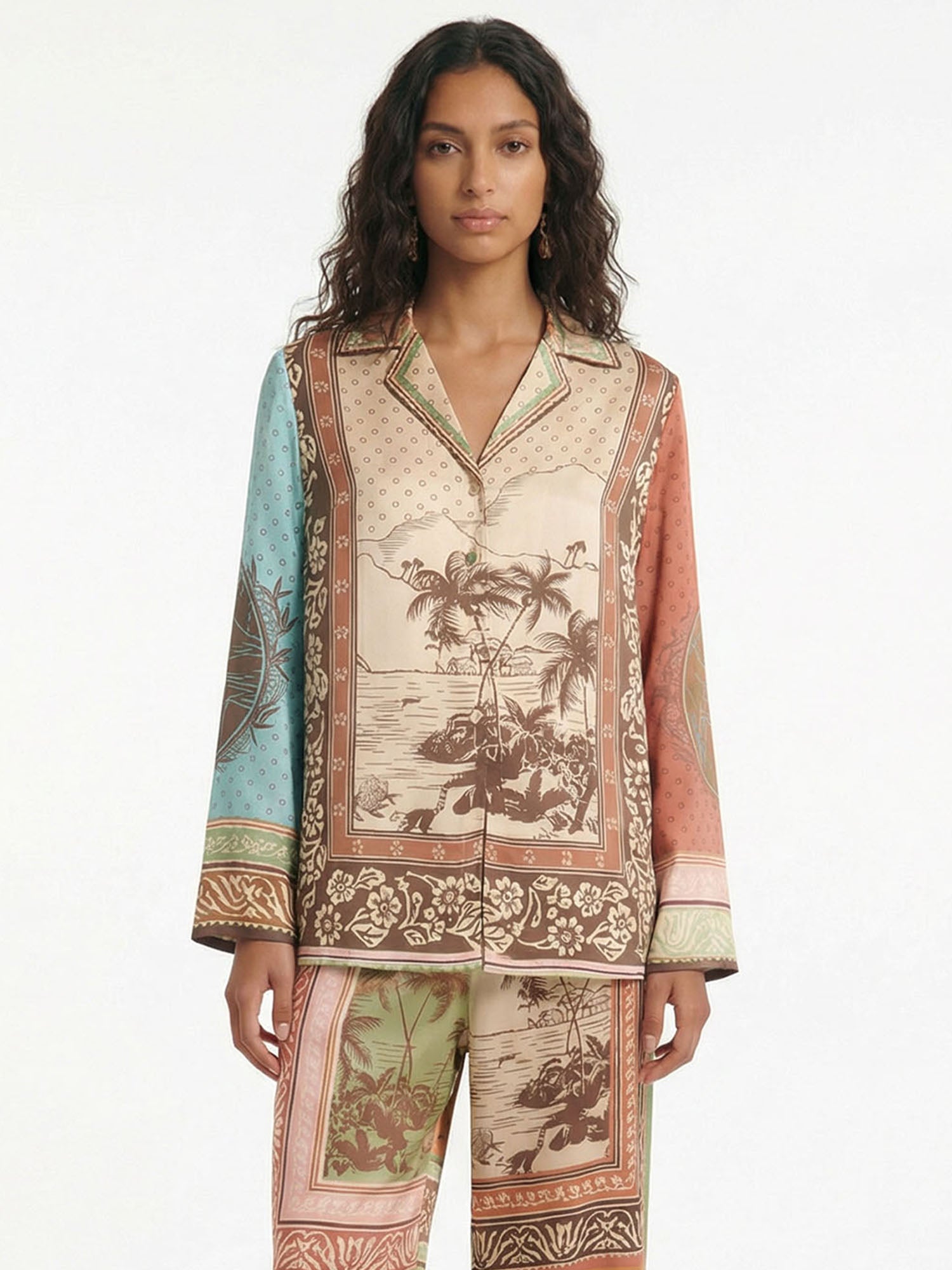 Drift into sunlit escape in Dantўўase's Tropical Reverie Shirt, where classic collar and long sleeves frame nostalgic beach scenes and palm-framed vignettes. Relaxed fit invites languid comfort. Ideal for Daily lounging or Vacation ease, it reimagines minimalist women's allure—dreamy, nostalgic, and softly captivating.