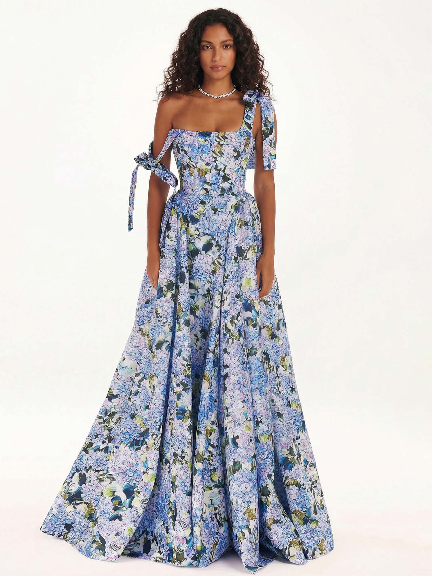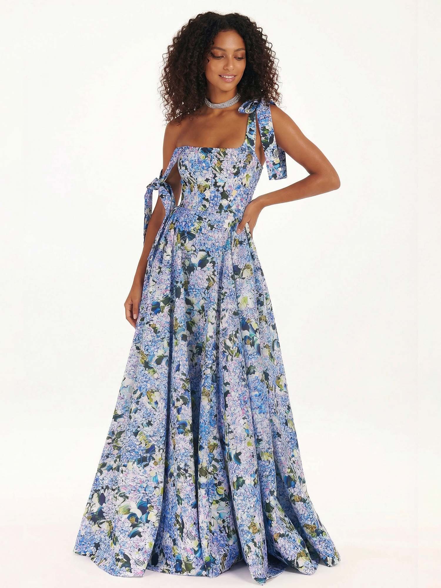 Let delicate bows adorn the off-shoulder silhouette where florals cascade into full, layered grace, inviting quiet drama and feminine serenity.